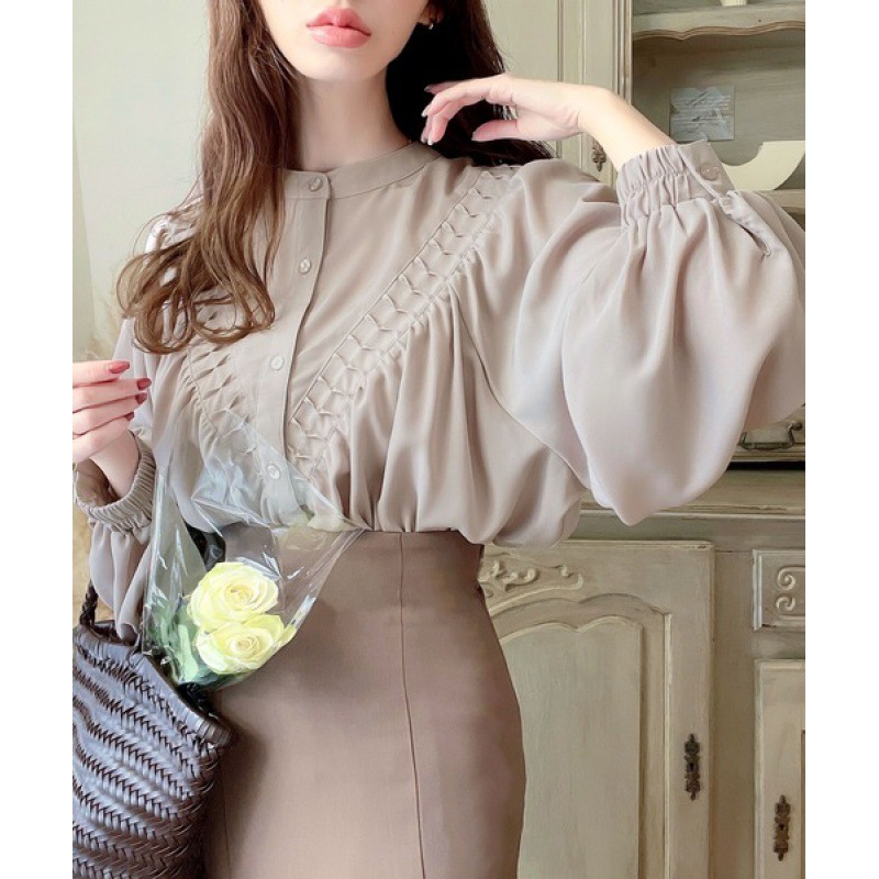 2024 일본과 한국의 새로운 우아한 기질 둥근 목 주름 셔츠 앞뒤 2 달콤한 느슨한 랜턴 소매 쉬폰 셔츠를 입습니다.스토어 가기