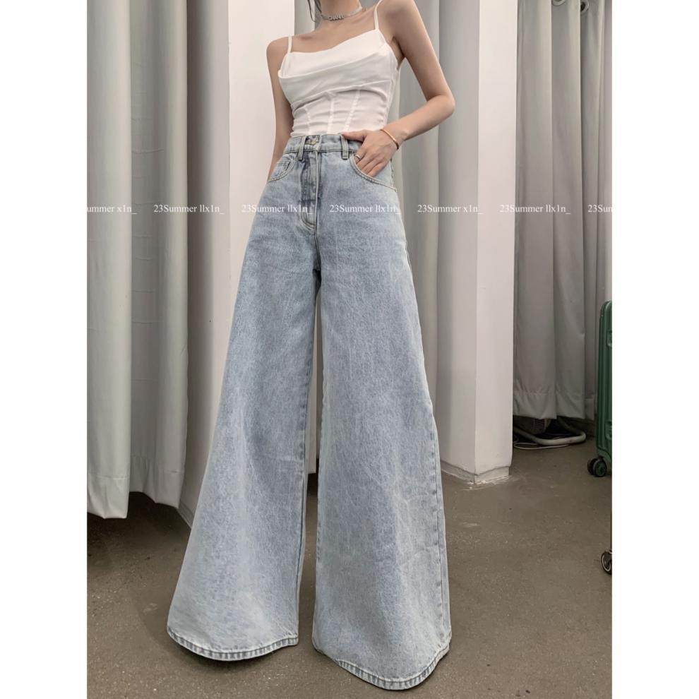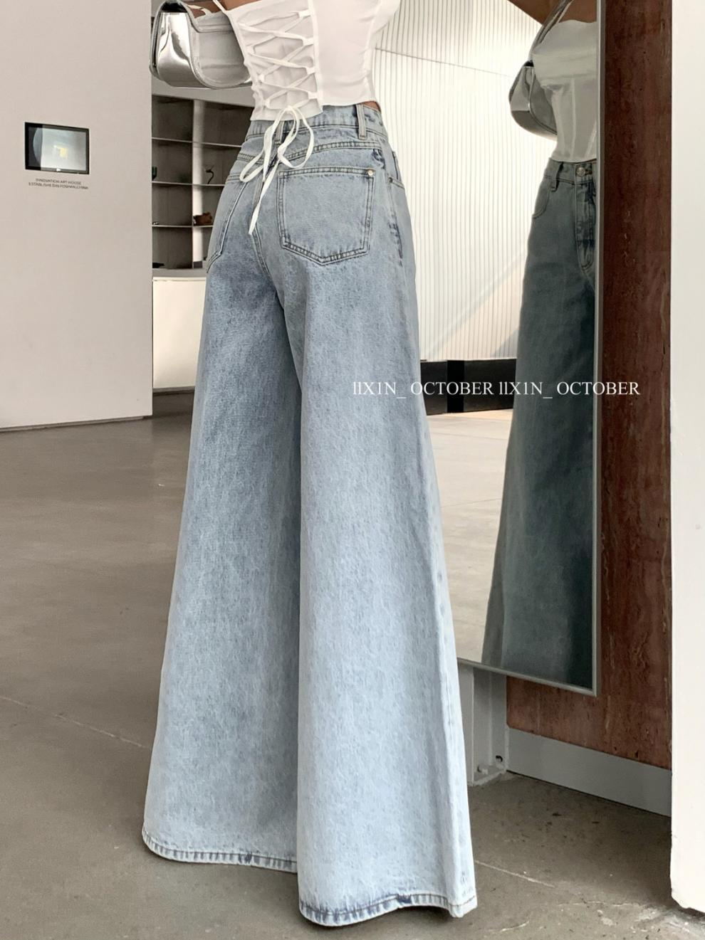 미국 스타일 개인화 된 디자인 감각 틈새 와이드 레그 청바지 여성 2023 가을 새로운 높은 허리 간단한 기질 걸레 바지스토어 가기