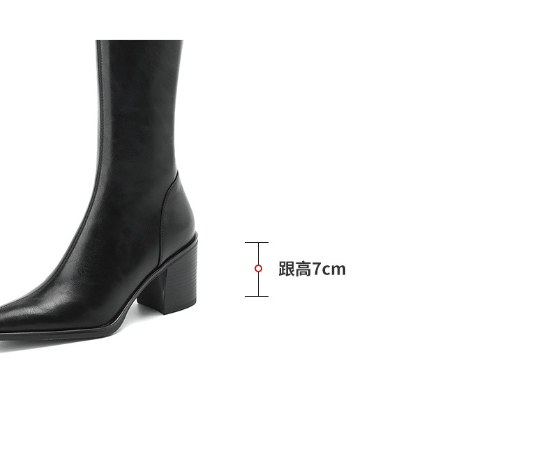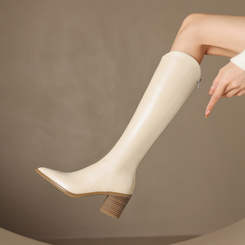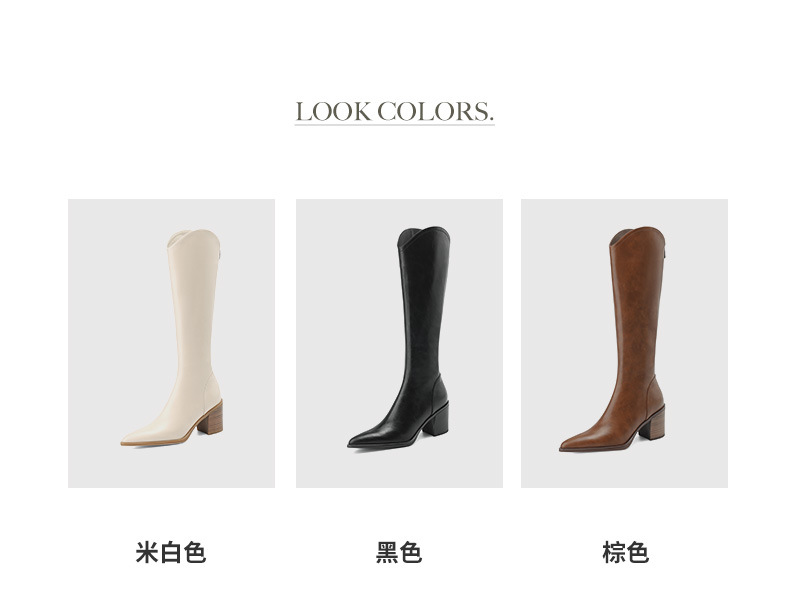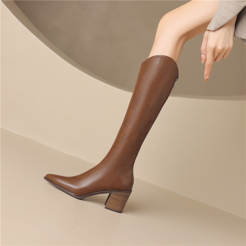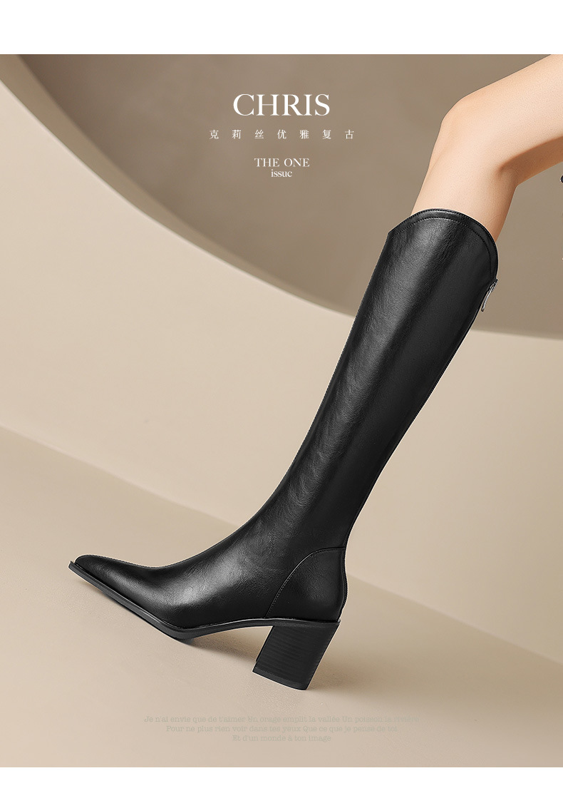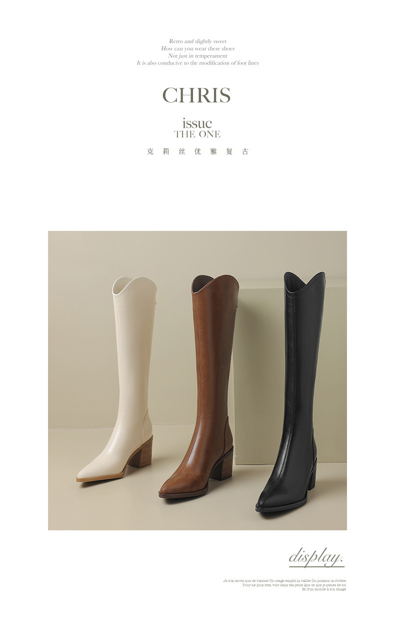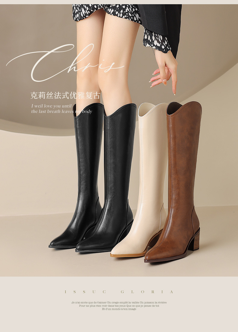 여성용 프랑스 스타일의 복고풍 가죽 뾰족한 발가락 청키 힐 V-mouth 슬리밍 라이딩 부츠 하이힐 무릎 하이 부츠