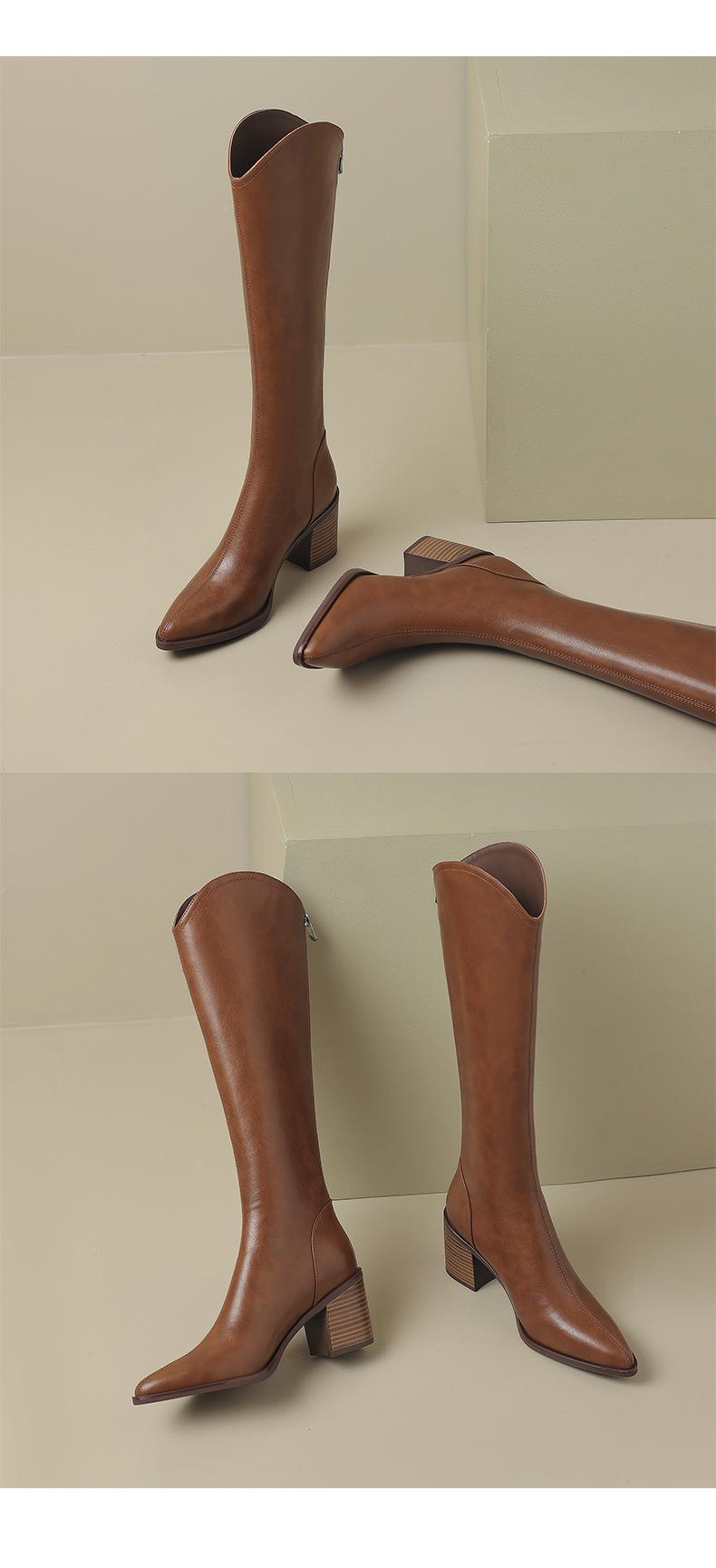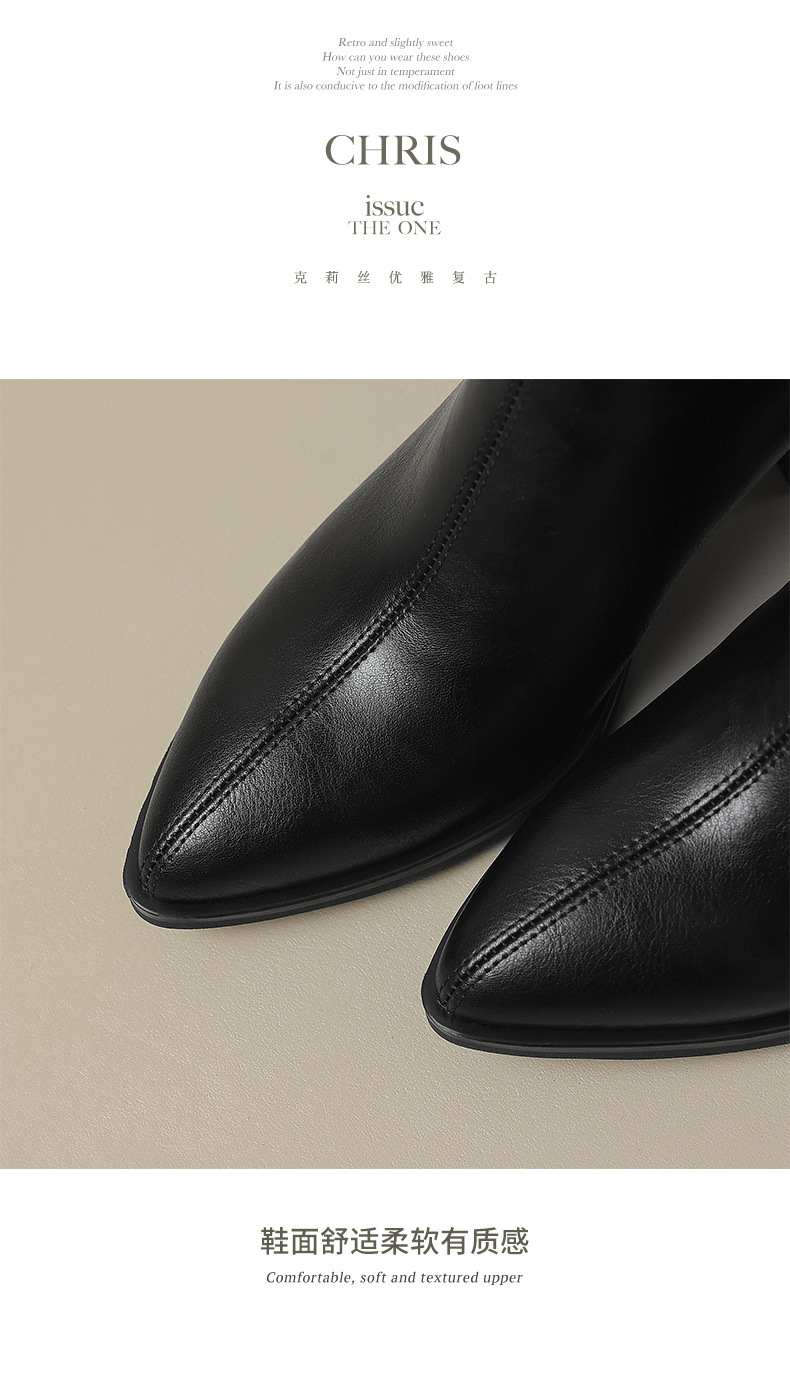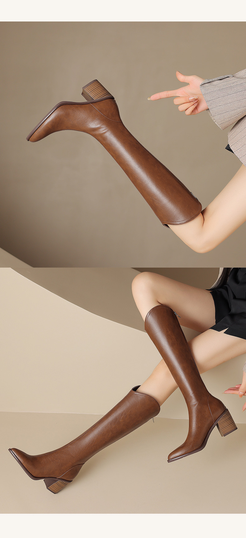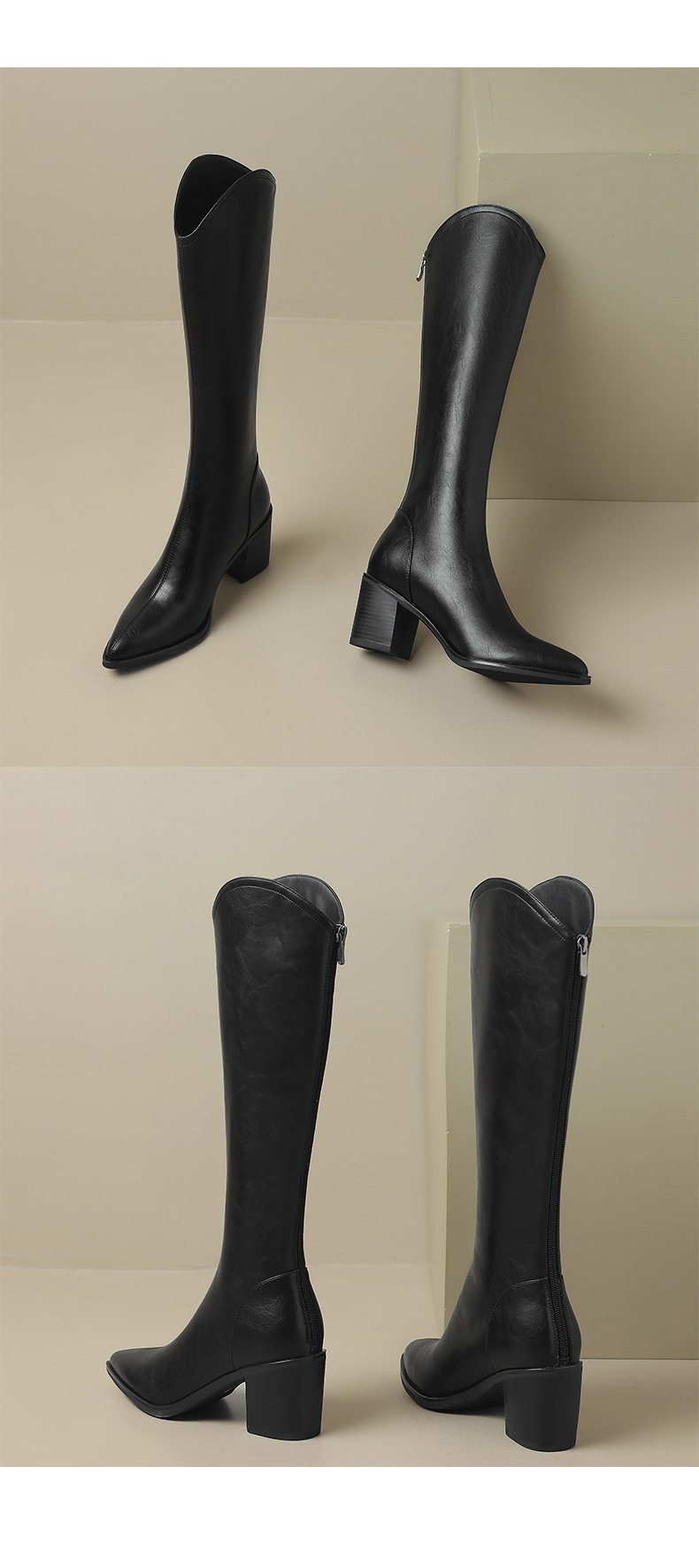 여성용 프랑스 스타일의 복고풍 가죽 뾰족한 발가락 청키 힐 V-mouth 슬리밍 라이딩 부츠 하이힐 무릎 하이 부츠