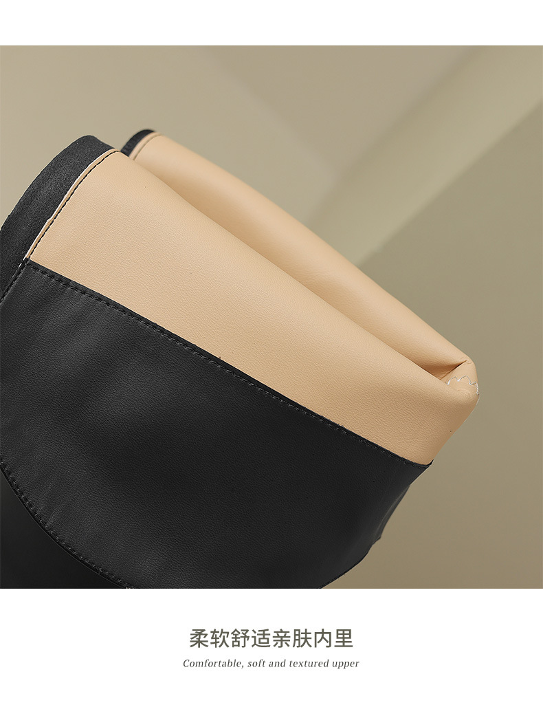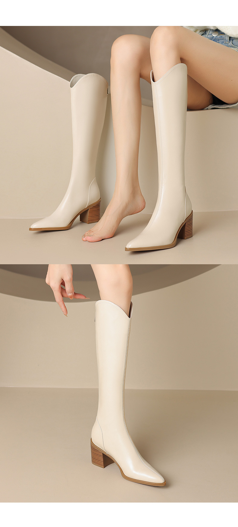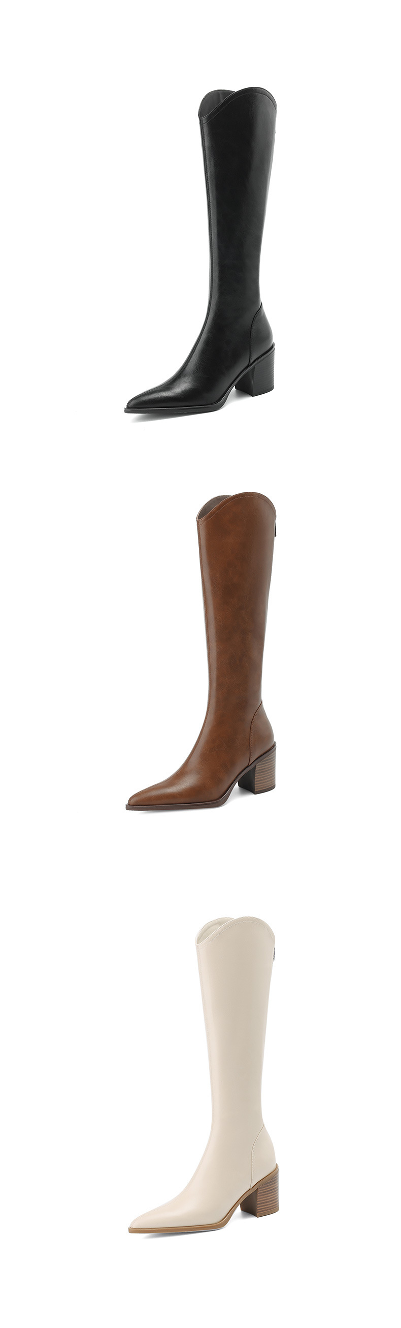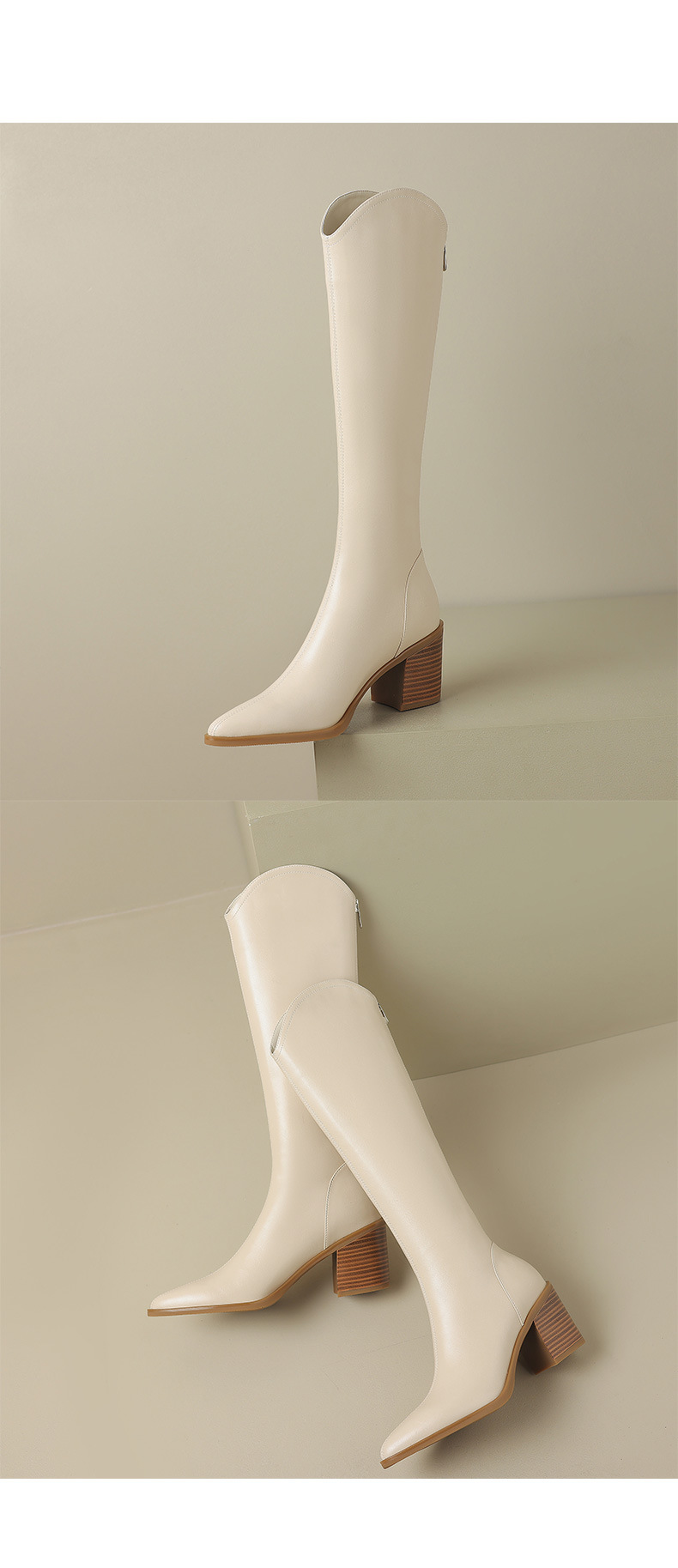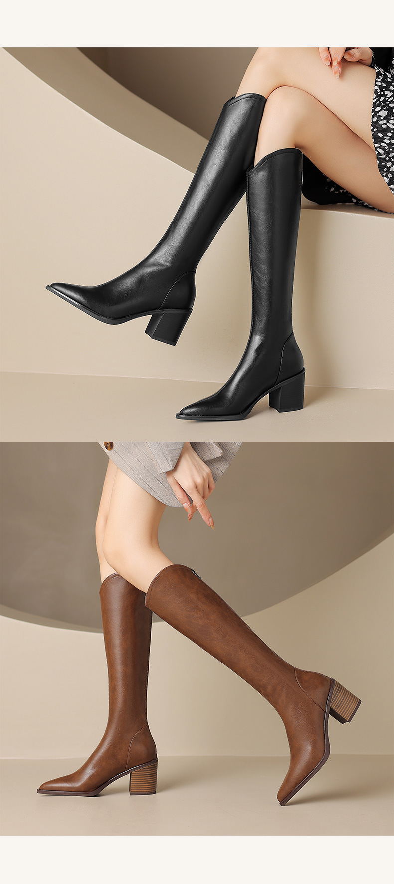 여성용 프랑스 스타일의 복고풍 가죽 뾰족한 발가락 청키 힐 V-mouth 슬리밍 라이딩 부츠 하이힐 무릎 하이 부츠
