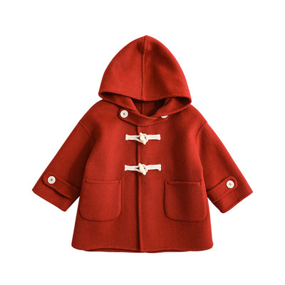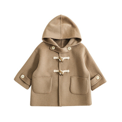 가을과 겨울 2023 경적 버클이 달린 소녀 양면 양모 모직 코트 새로운 어린이 서양식 두꺼운 후드 모직 코트스토어 가기