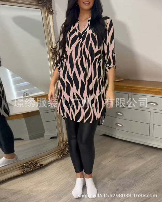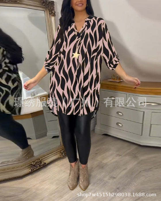 2023 봄과 가을 새로운 국경 아마존 국경 간 유럽과 미국의 패션 패턴 V-넥 플러스 사이즈 소매 셔츠