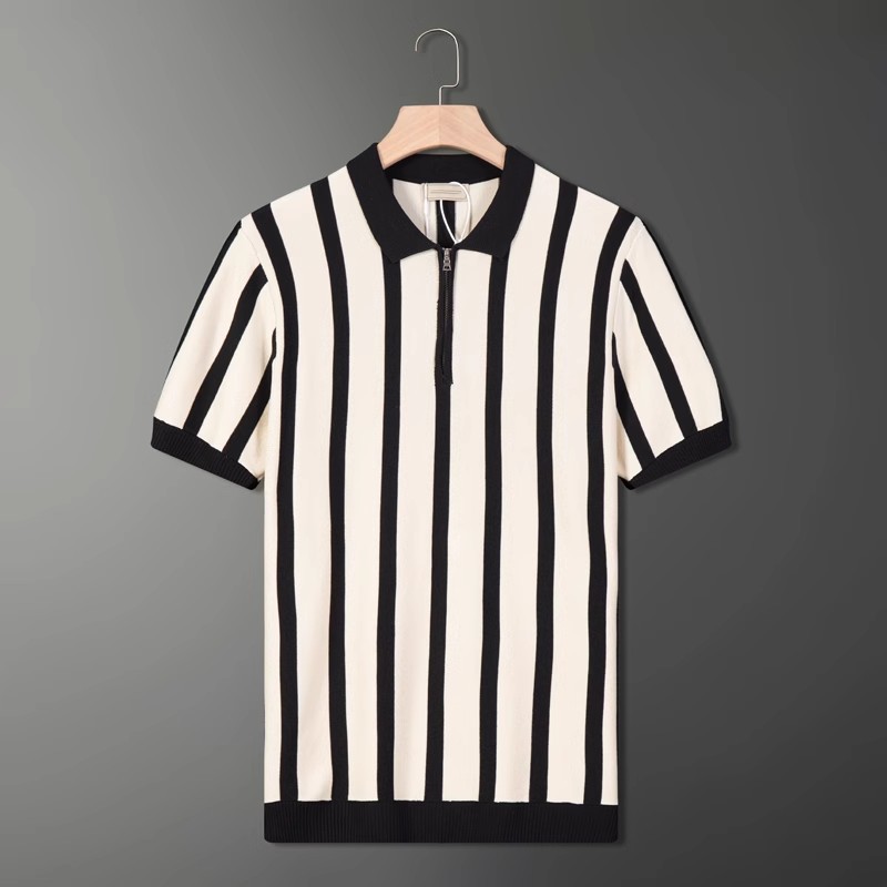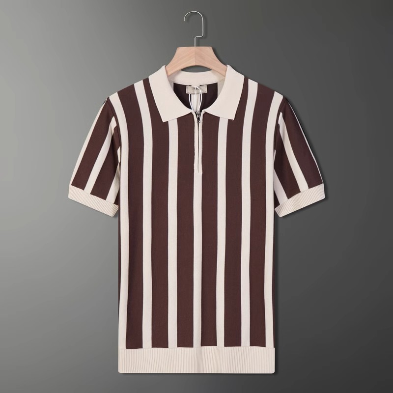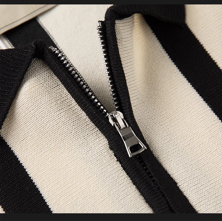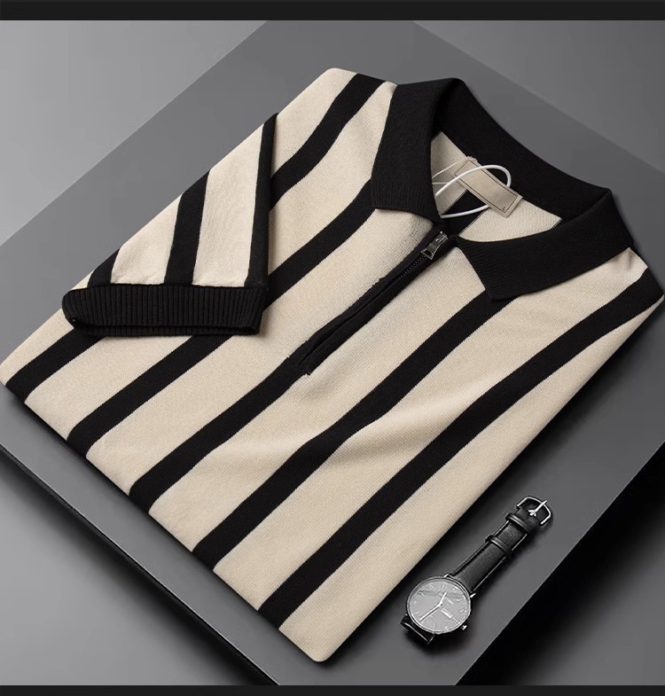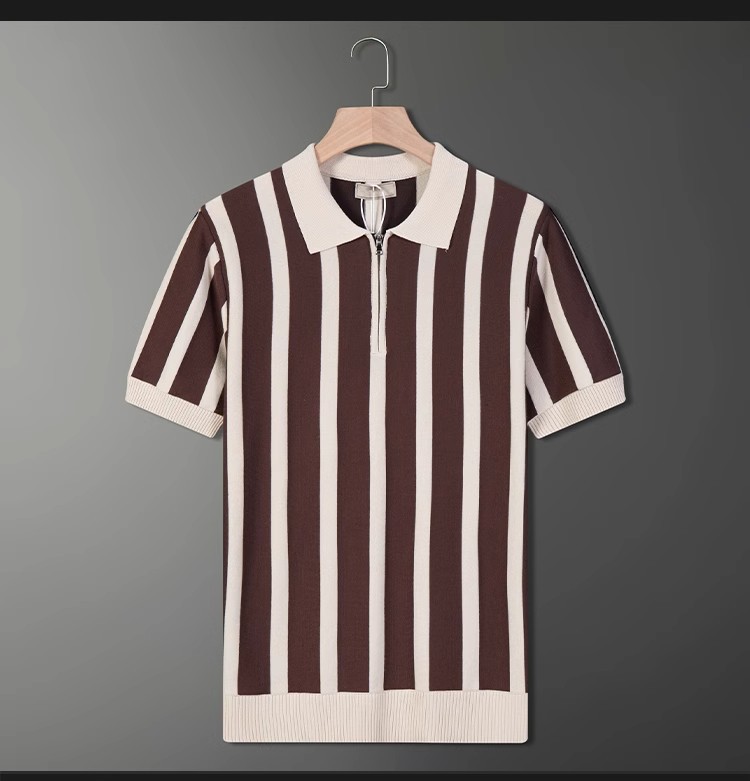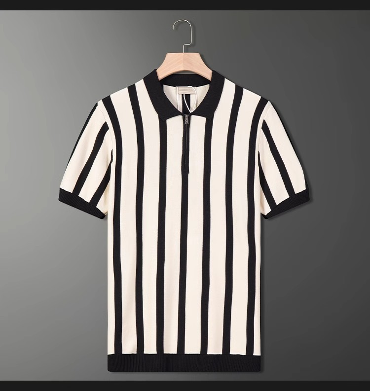 트렌디 한 여름 반소매 올매치 남자 한국 스타일 레트로 스트라이프 독특한 지퍼 반소매 니트웨어 캐주얼 트렌디 티셔츠 남성용 트렌디