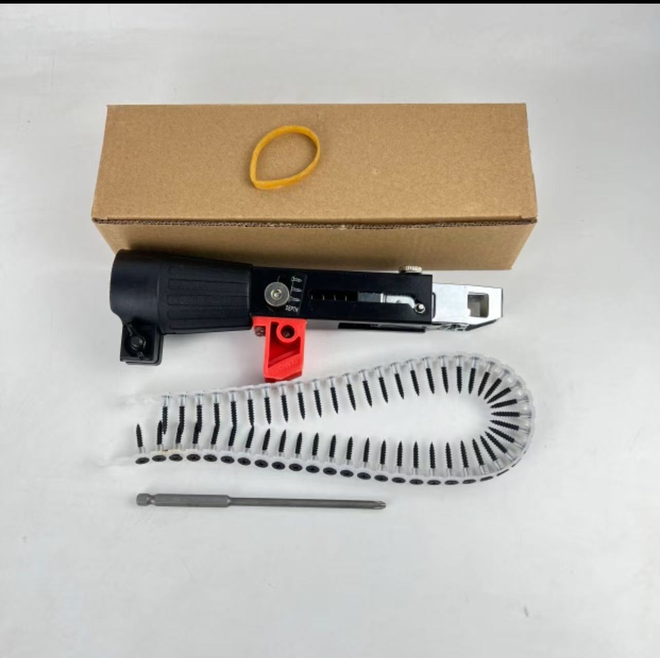 一机多用:这款产品适用于锂电动钻夹头直径46-49mm口径范围,干壁钉螺丝杆直径m3.0-3.8,长度16~50mm丝钉。机头内披头杆驱动长度165mm高速钢材质。产品自动送钉。产品都可以方便地调节和使用。