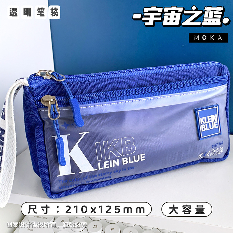 클라인 블루 연필 케이스 투명 캔버스 더블 레이어 휴대용 연필 케이스 소년 대용량 학생 연필 저장 문구 상자