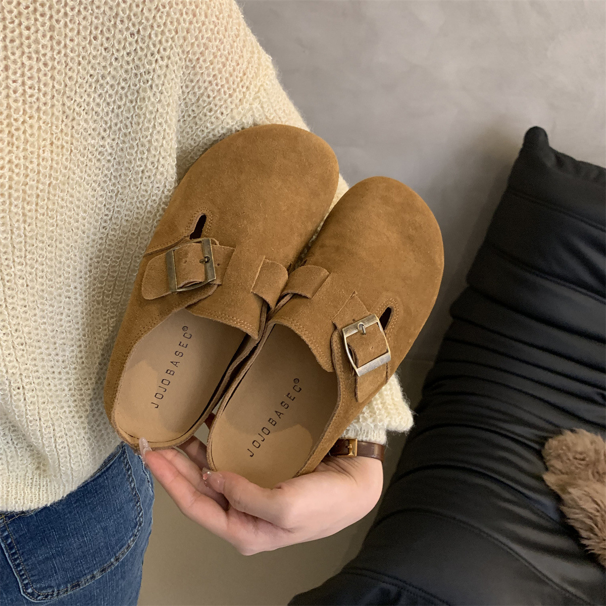 2024 봄 새로운 복고풍 뮬러 신발 플랫 캐주얼 추악한 귀여운 Boken 신발 기모 슬리퍼 여성을위한 닫힌 발가락 하프 슬리퍼스토어 가기