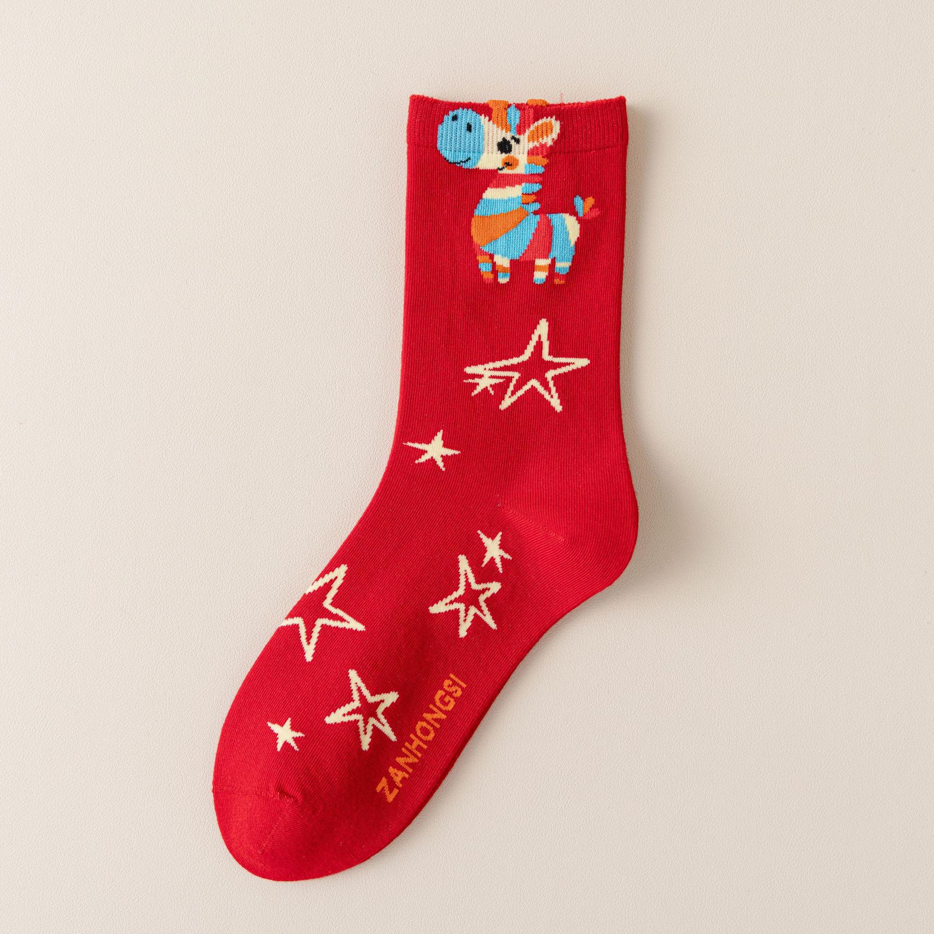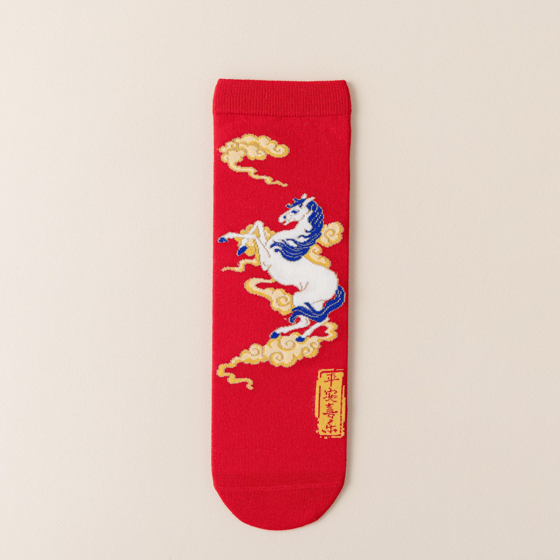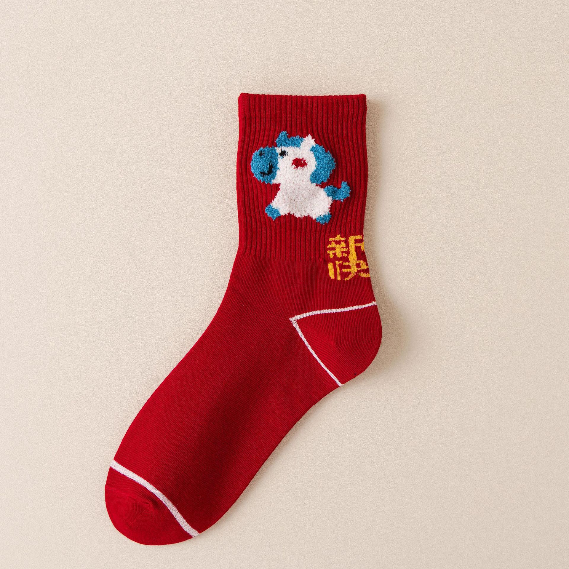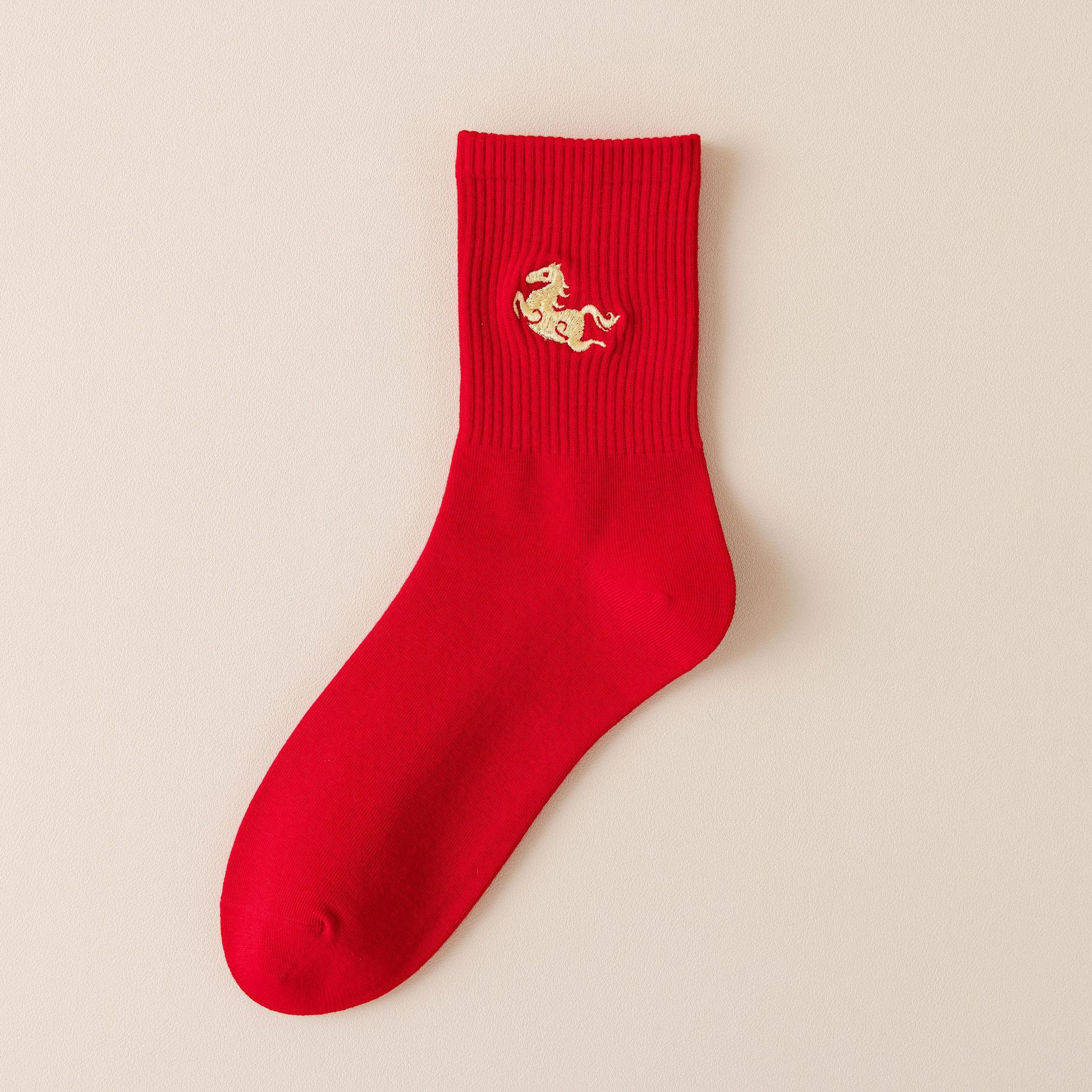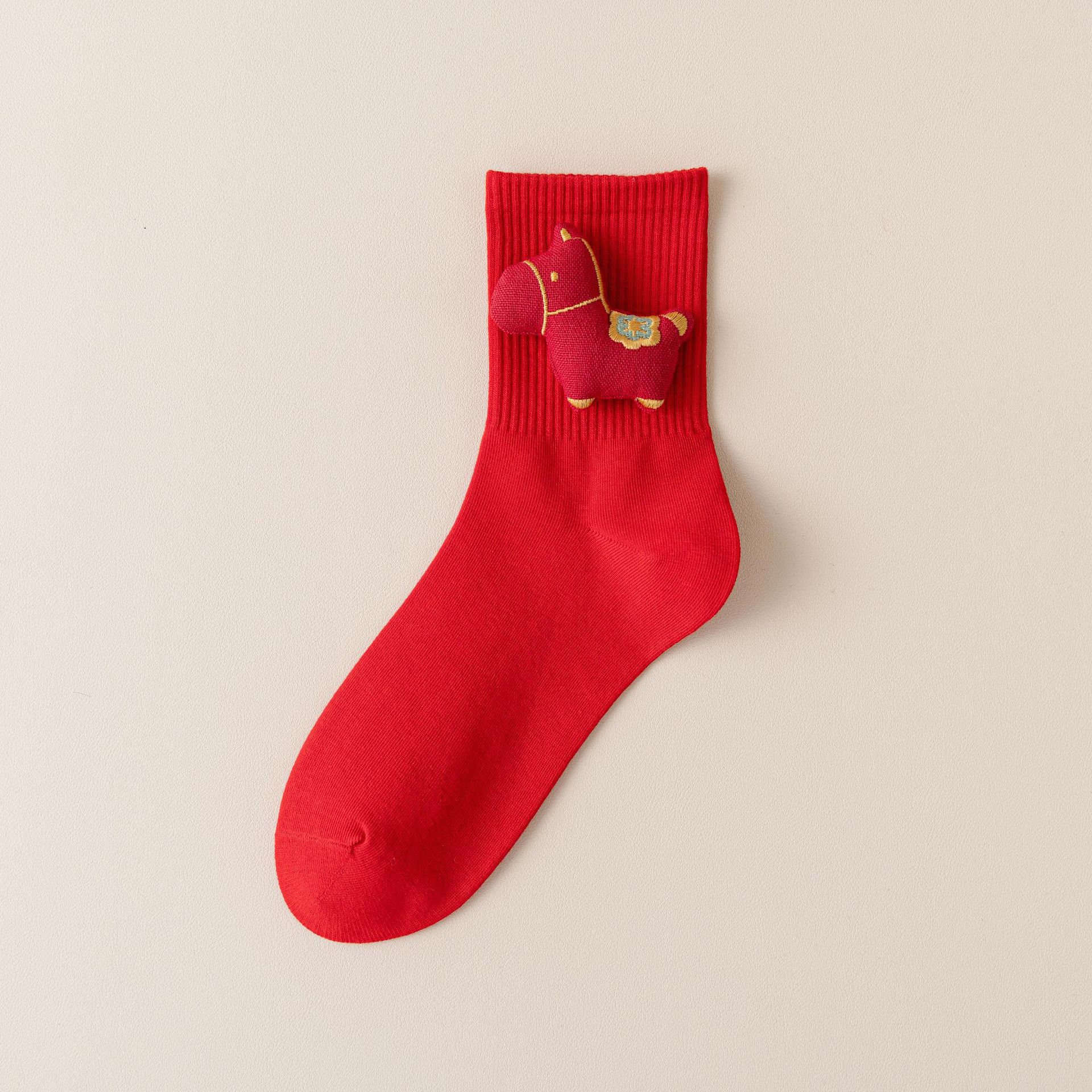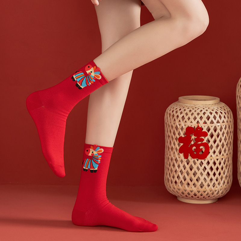 말의 해 레드 양말 남녀공용 중간 길이 귀여운 만화풍 고전 인형 축제 커플 결혼 생년월일 레드 면 양말