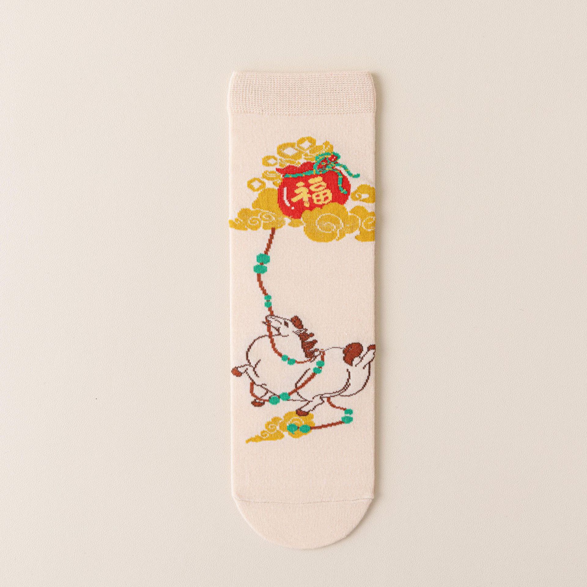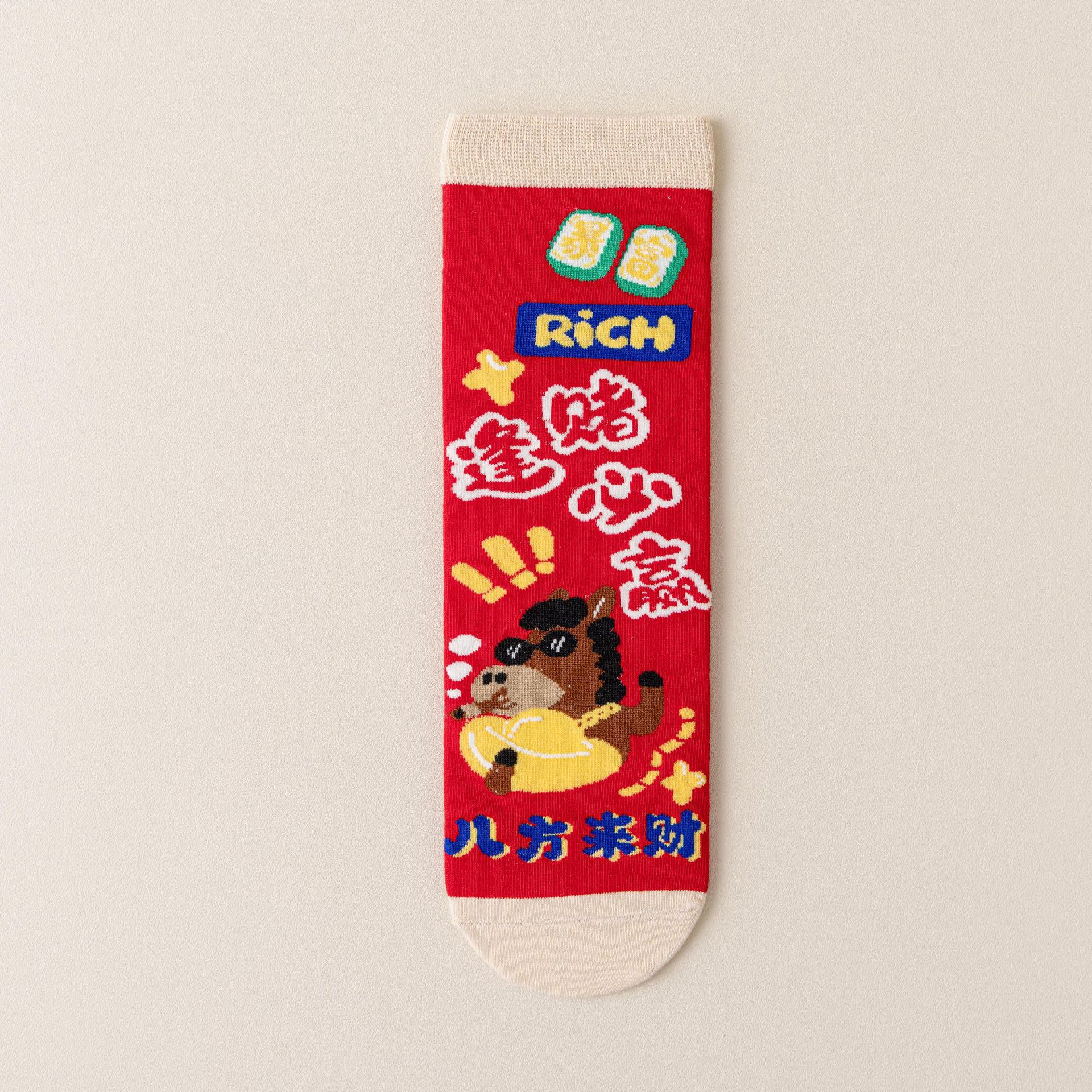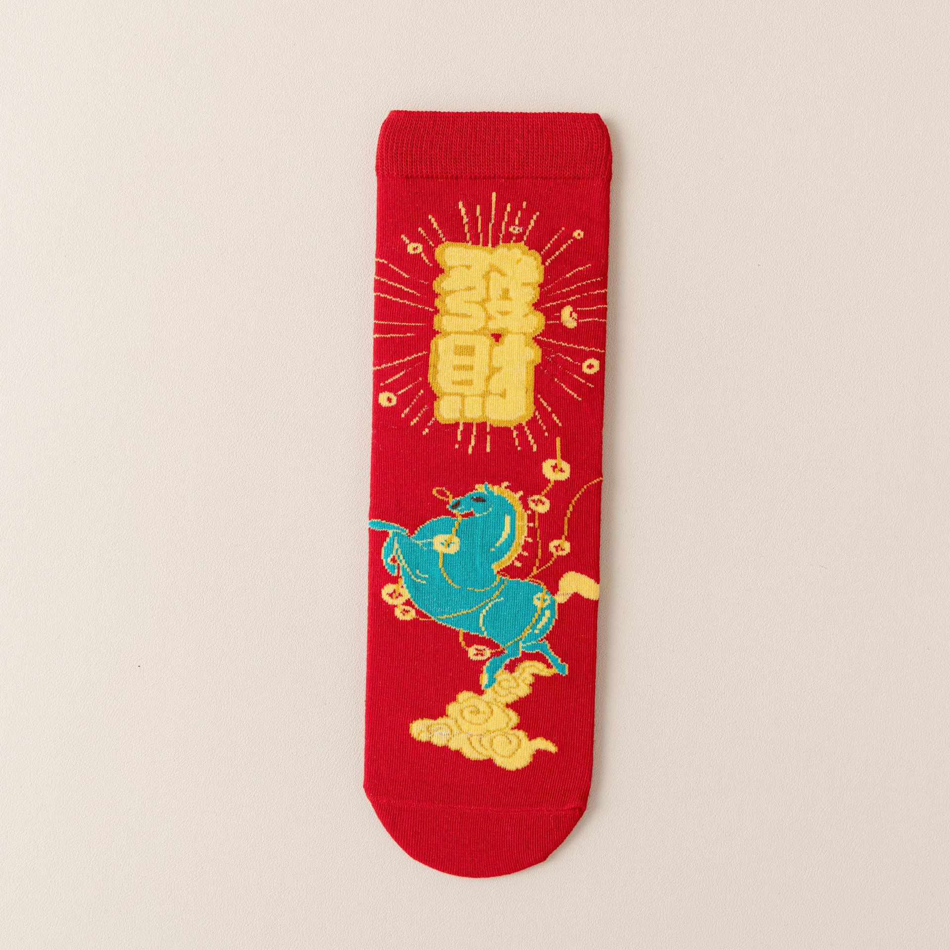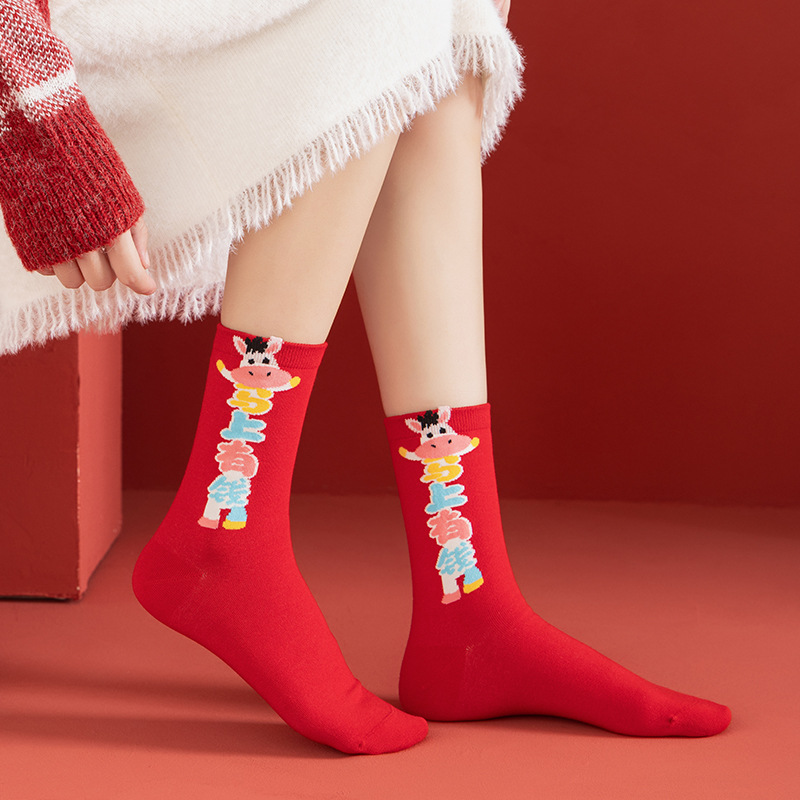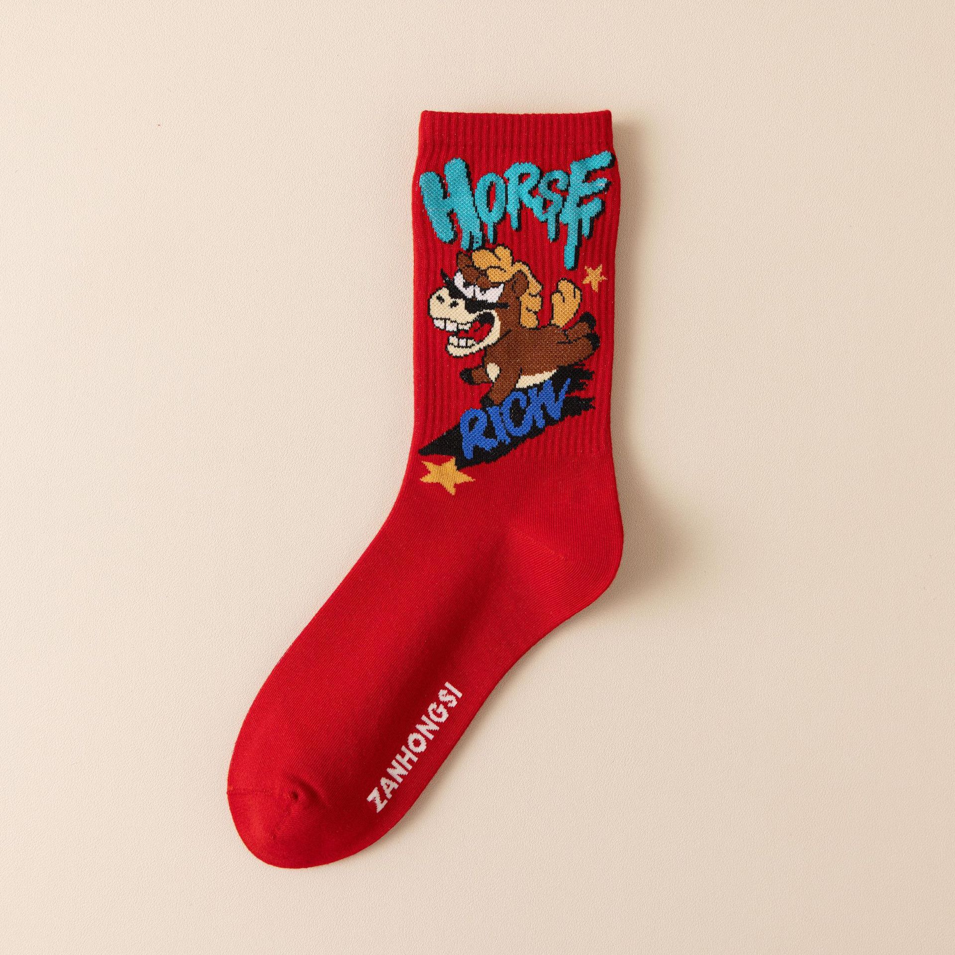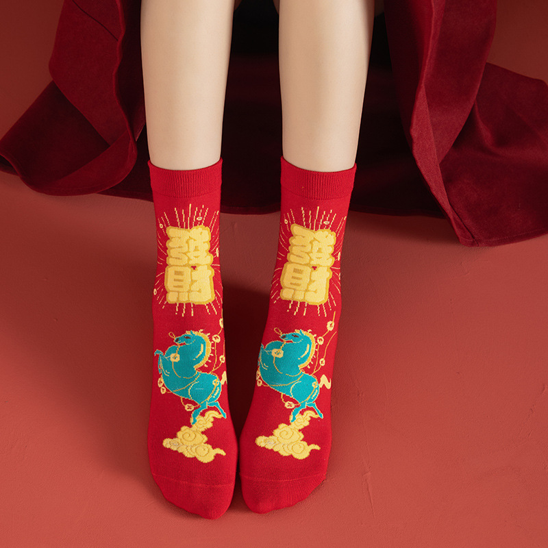 말의 해 레드 양말 남녀공용 중간 길이 귀여운 만화풍 고전 인형 축제 커플 결혼 생년월일 레드 면 양말