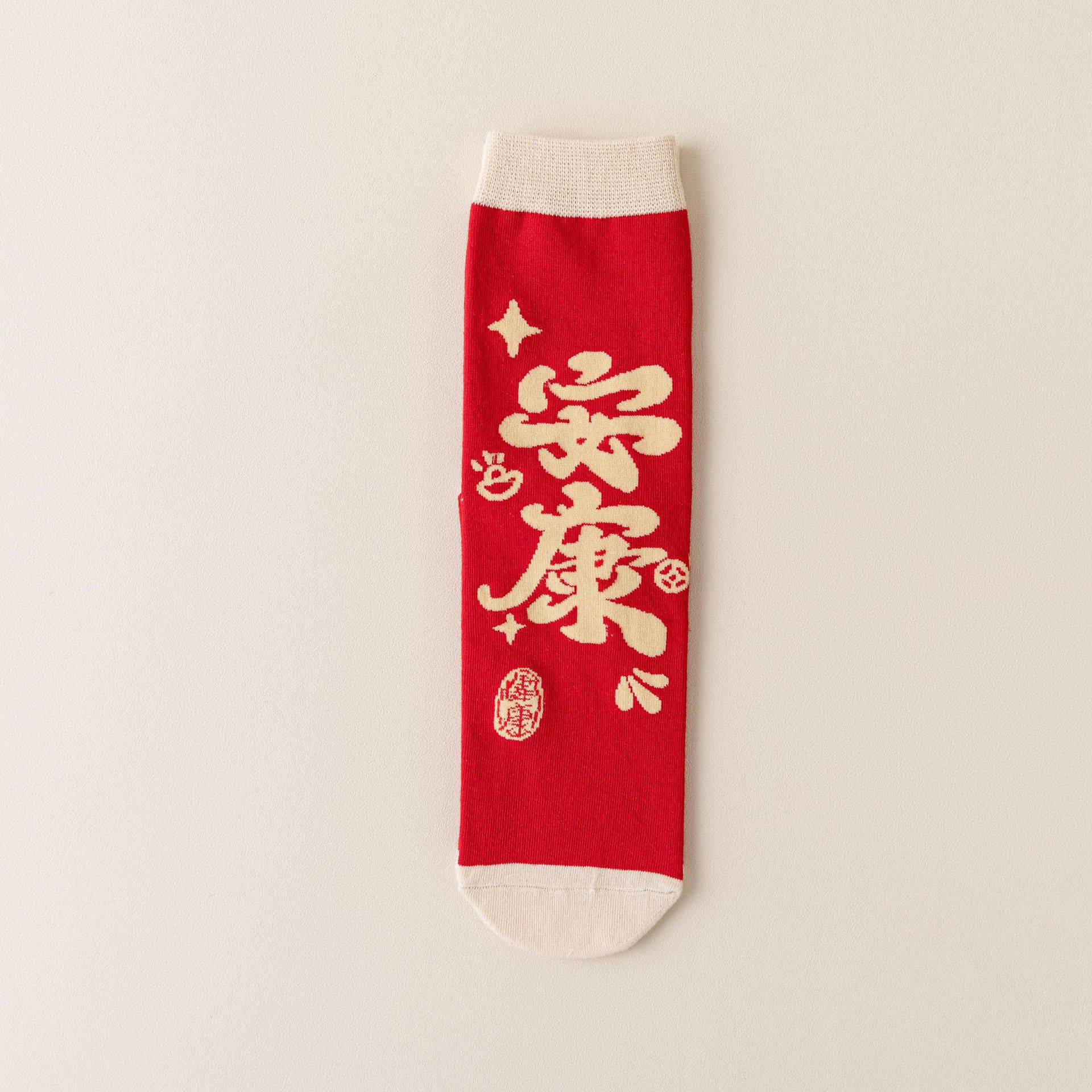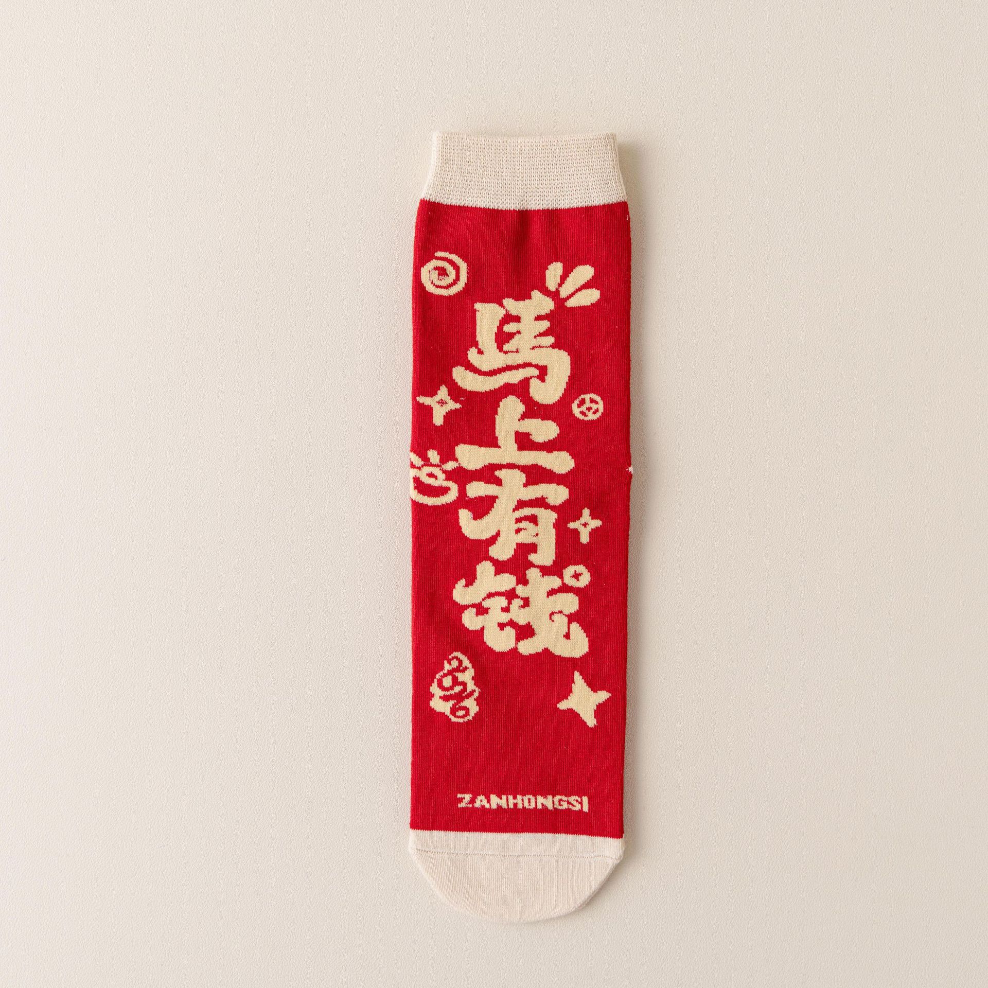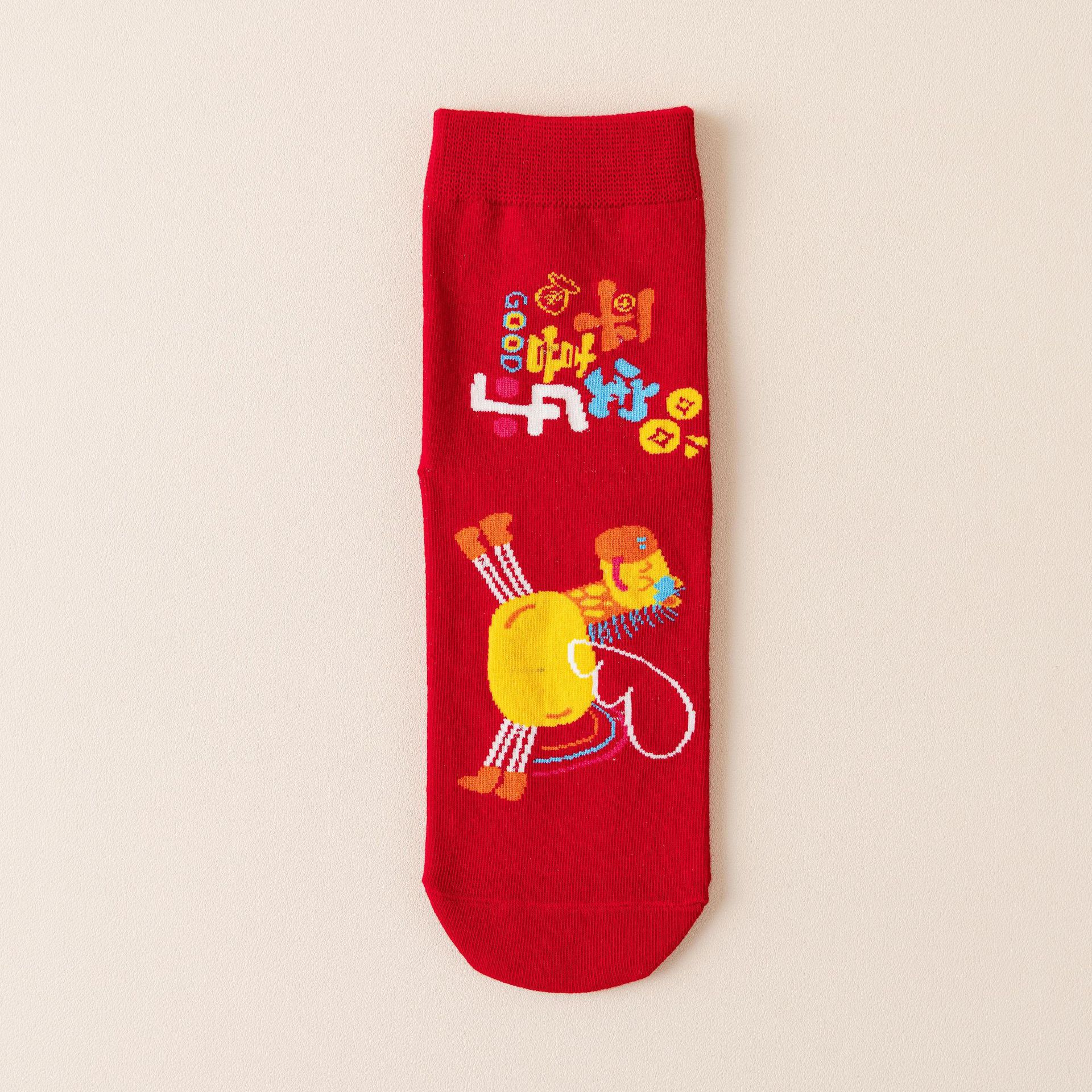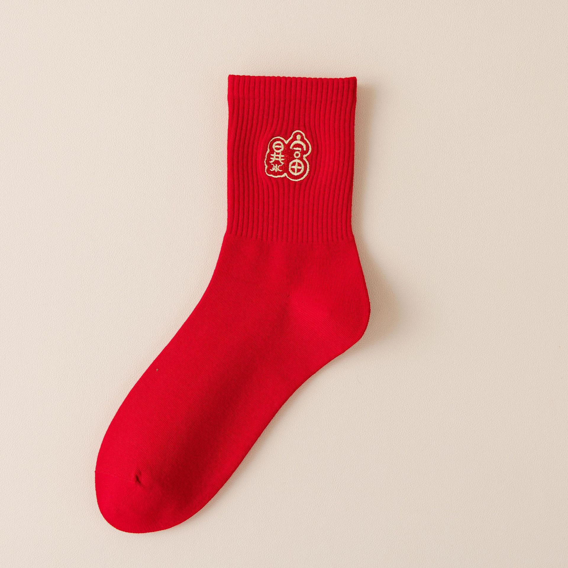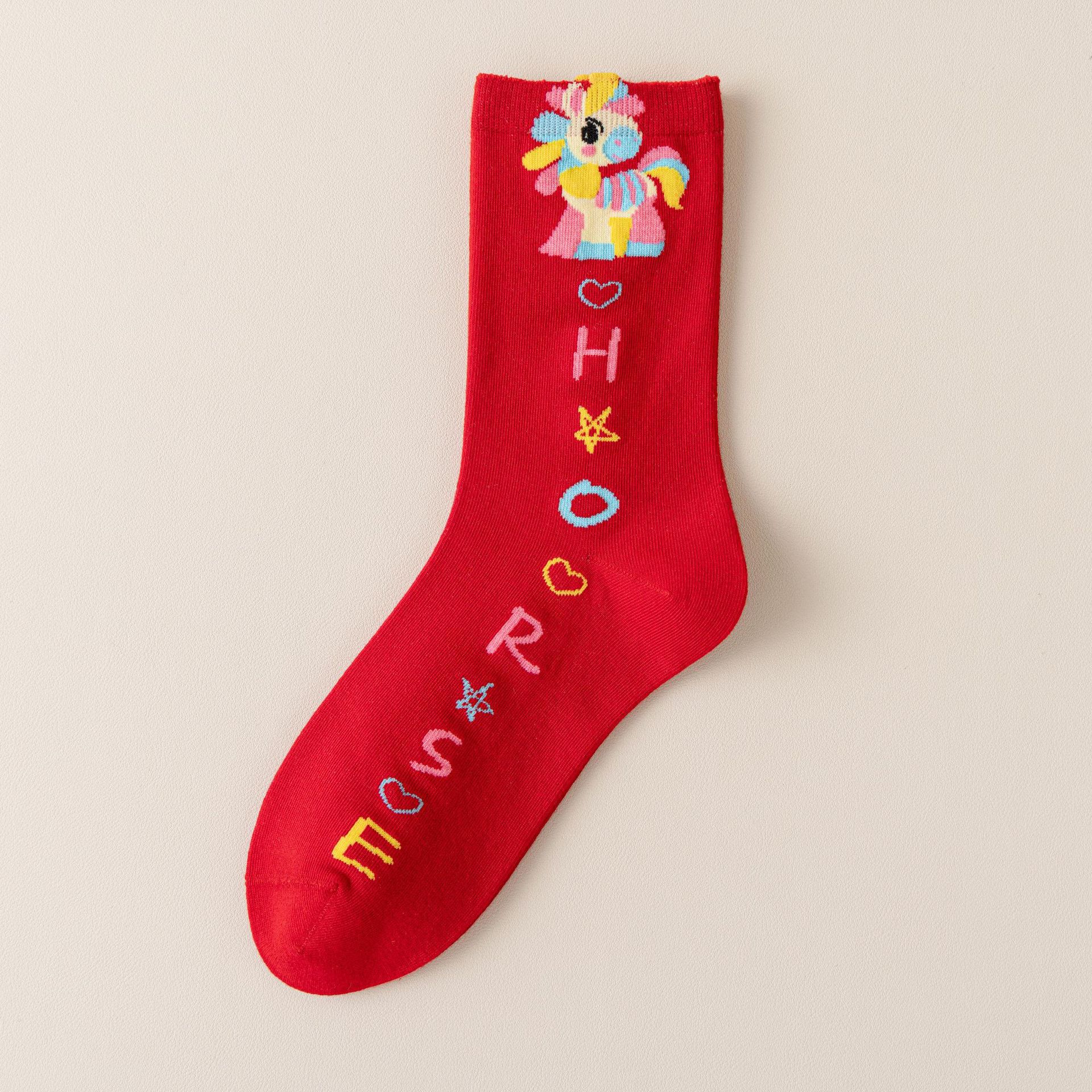 말의 해 레드 양말 남녀공용 중간 길이 귀여운 만화풍 고전 인형 축제 커플 결혼 생년월일 레드 면 양말