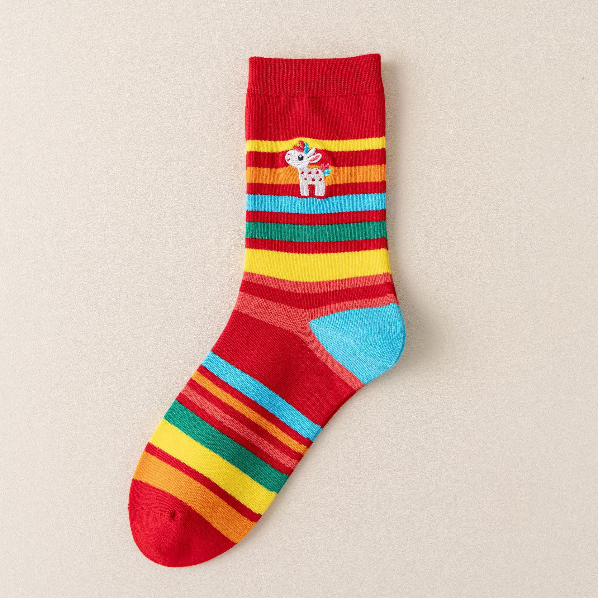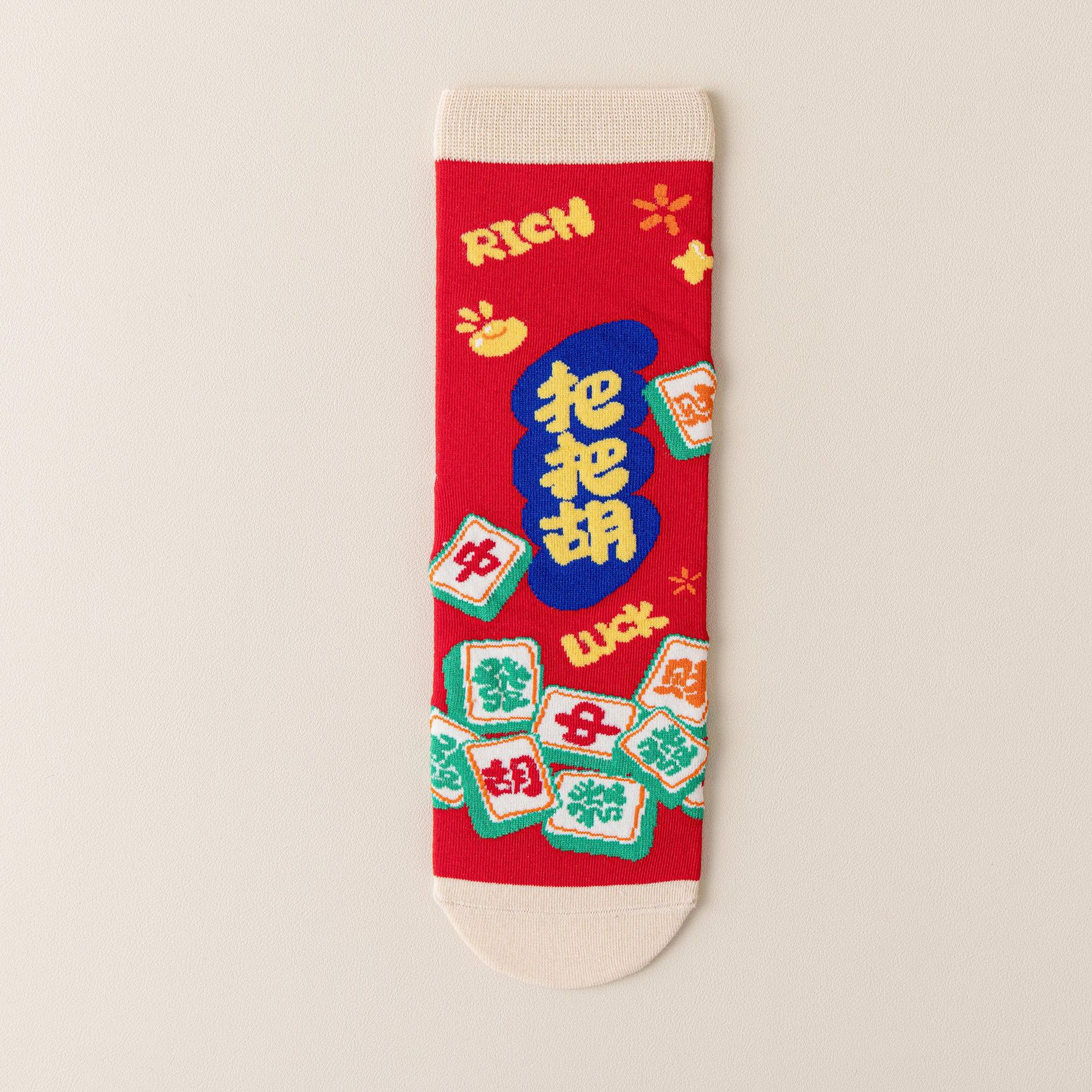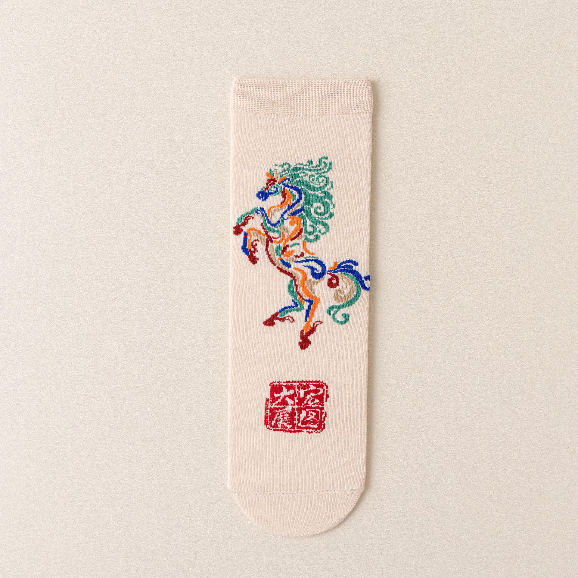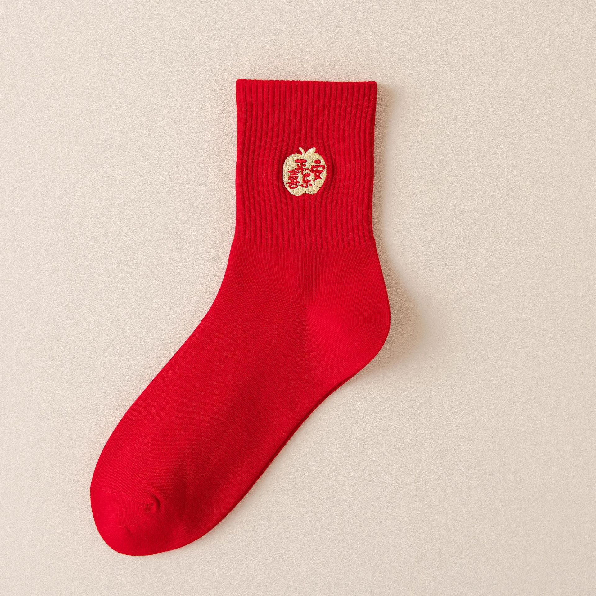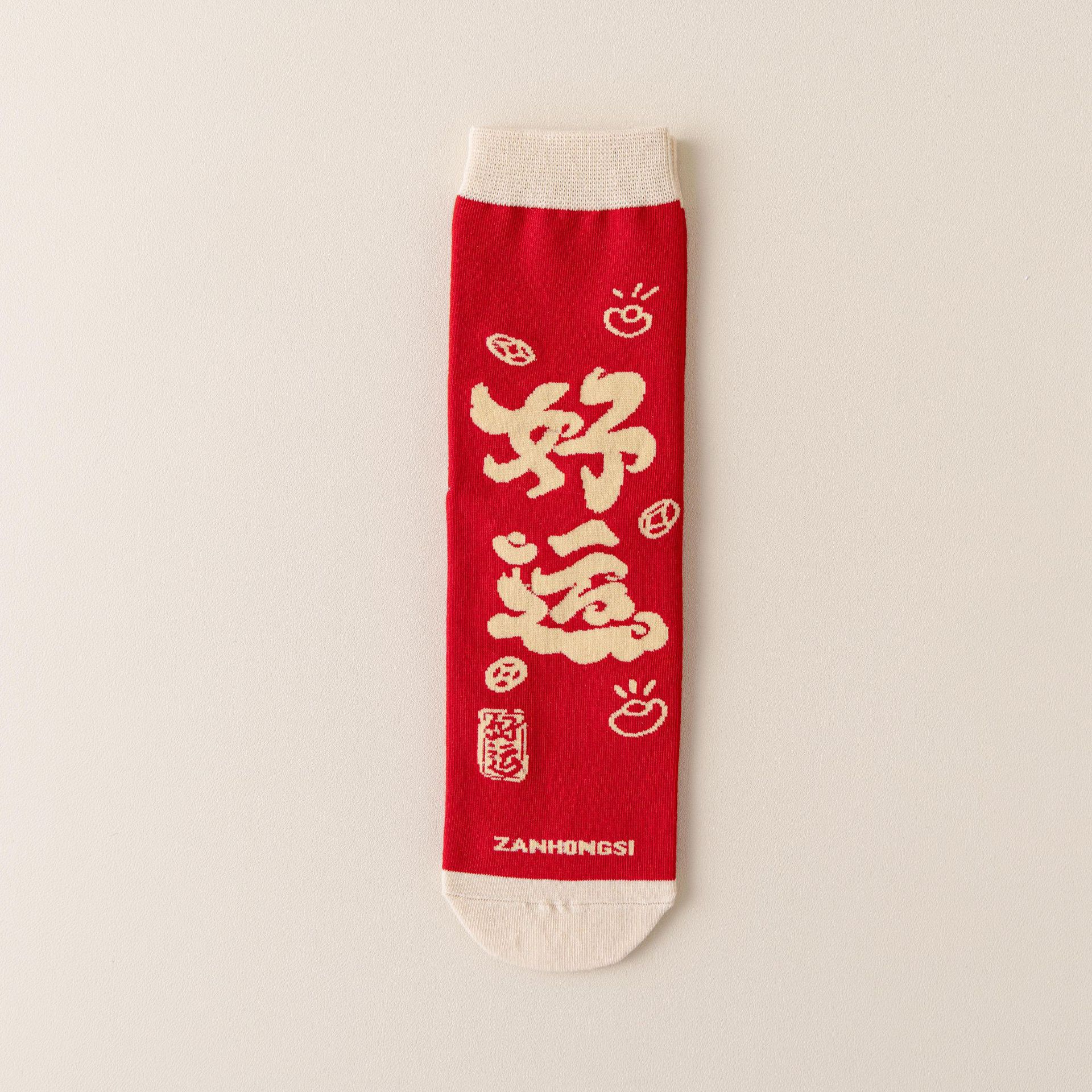 말의 해 레드 양말 남녀공용 중간 길이 귀여운 만화풍 고전 인형 축제 커플 결혼 생년월일 레드 면 양말