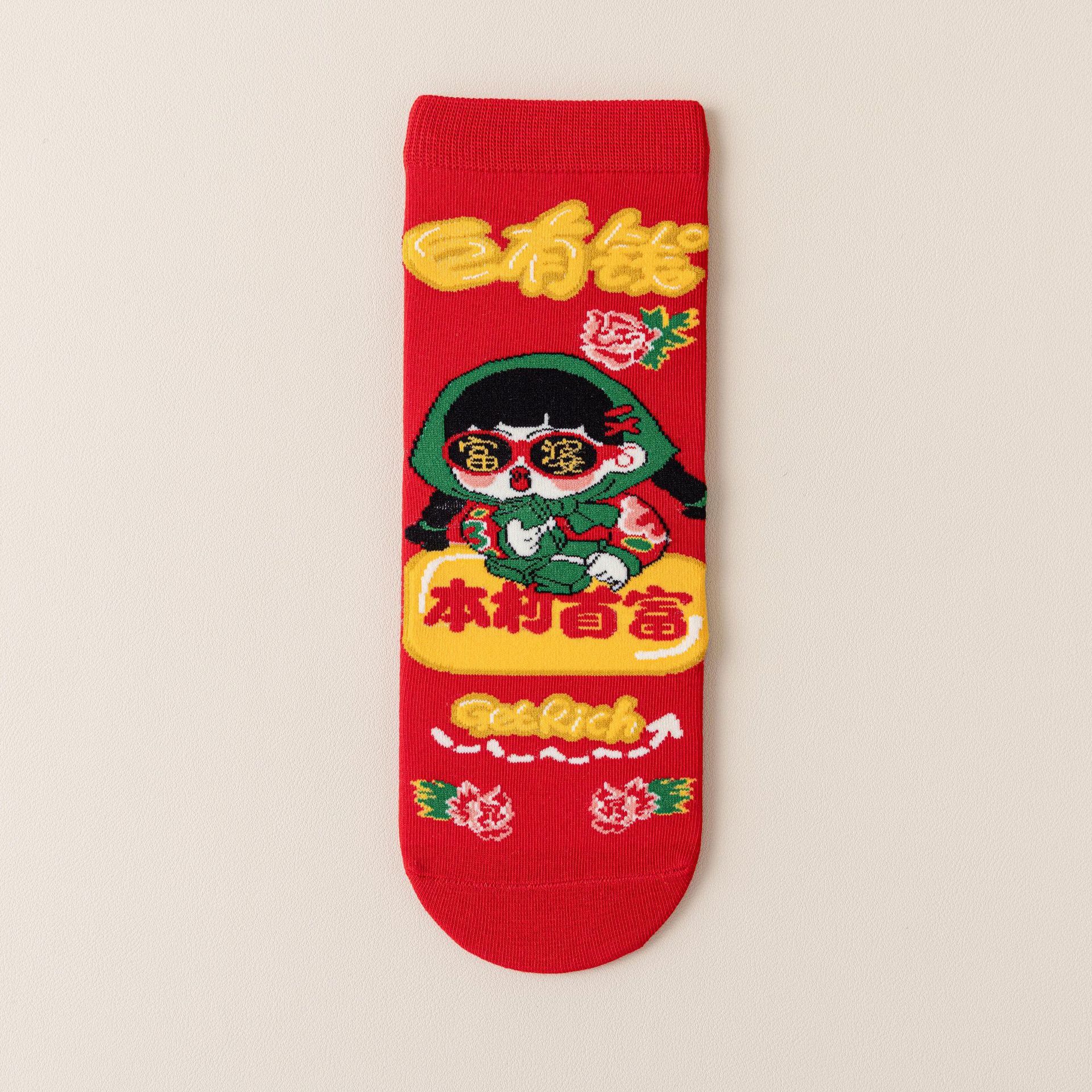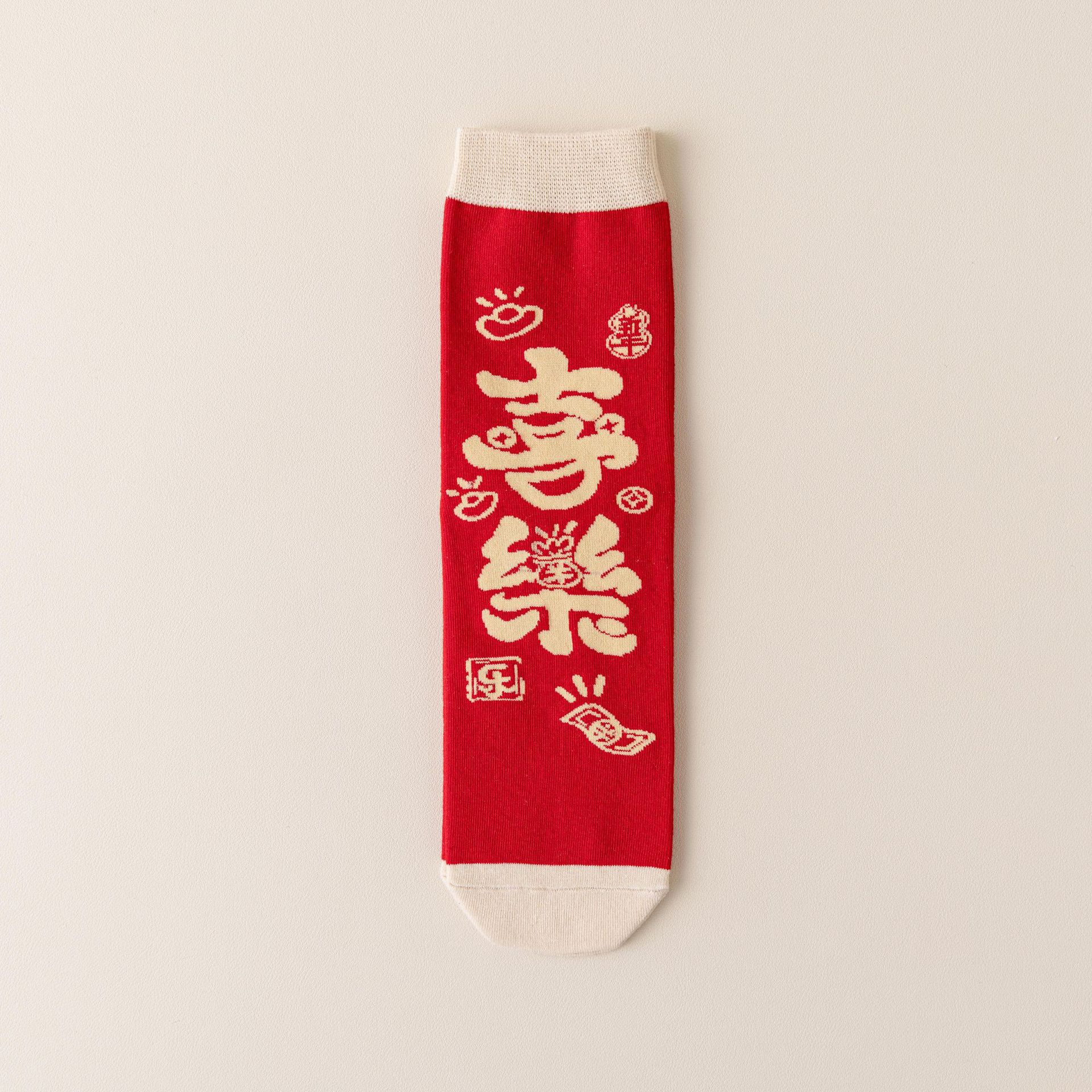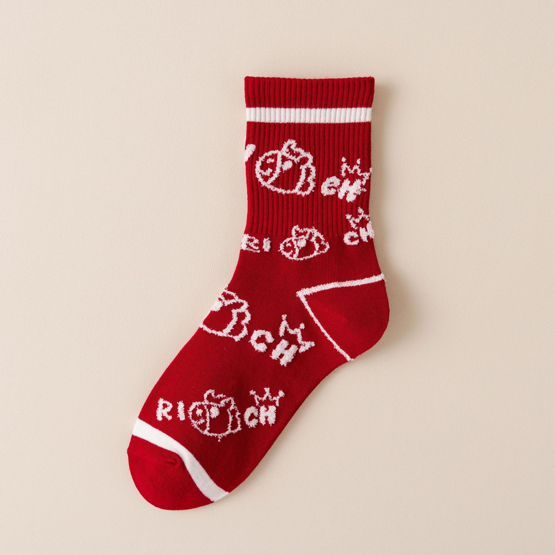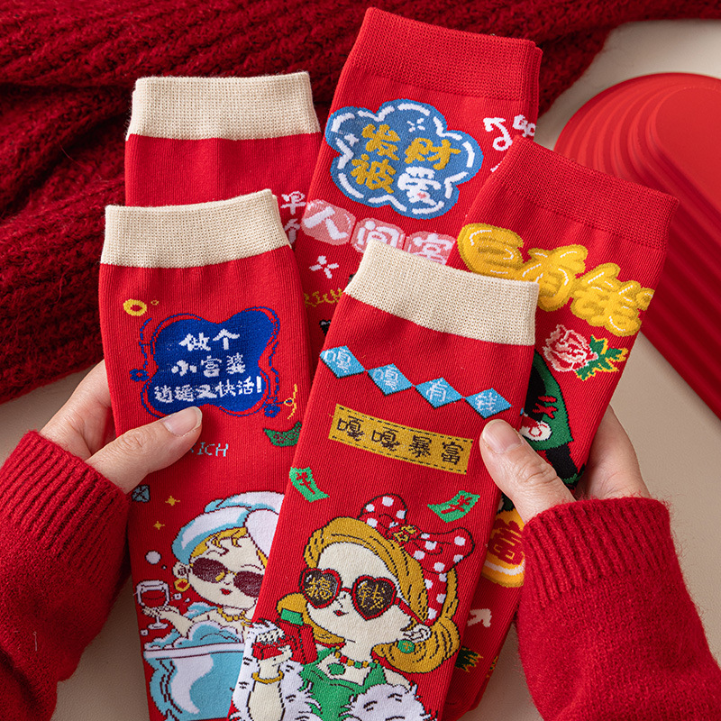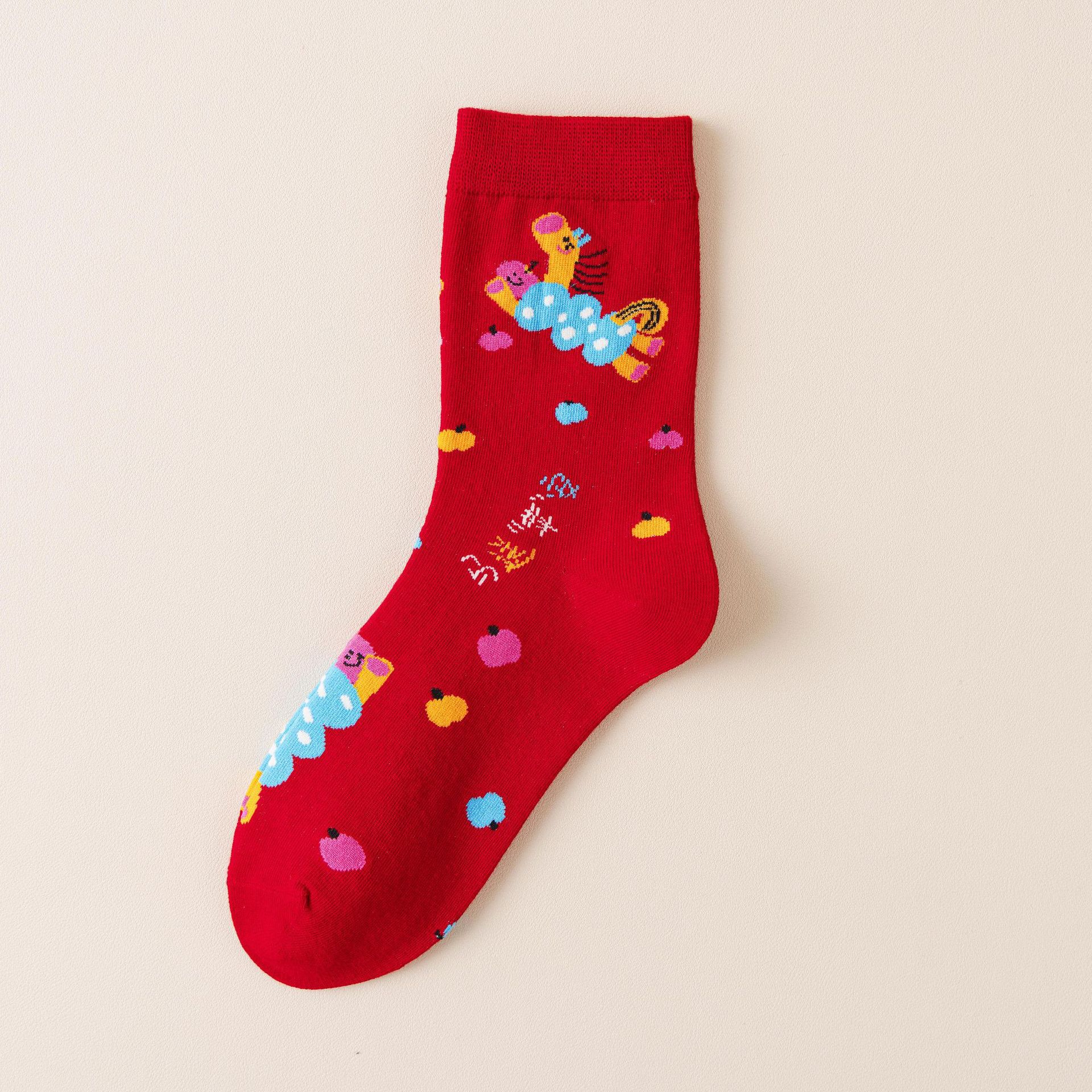 말의 해 레드 양말 남녀공용 중간 길이 귀여운 만화풍 고전 인형 축제 커플 결혼 생년월일 레드 면 양말스토어 가기