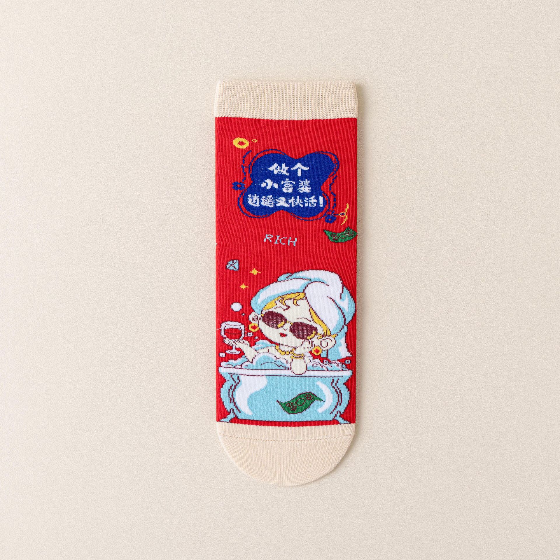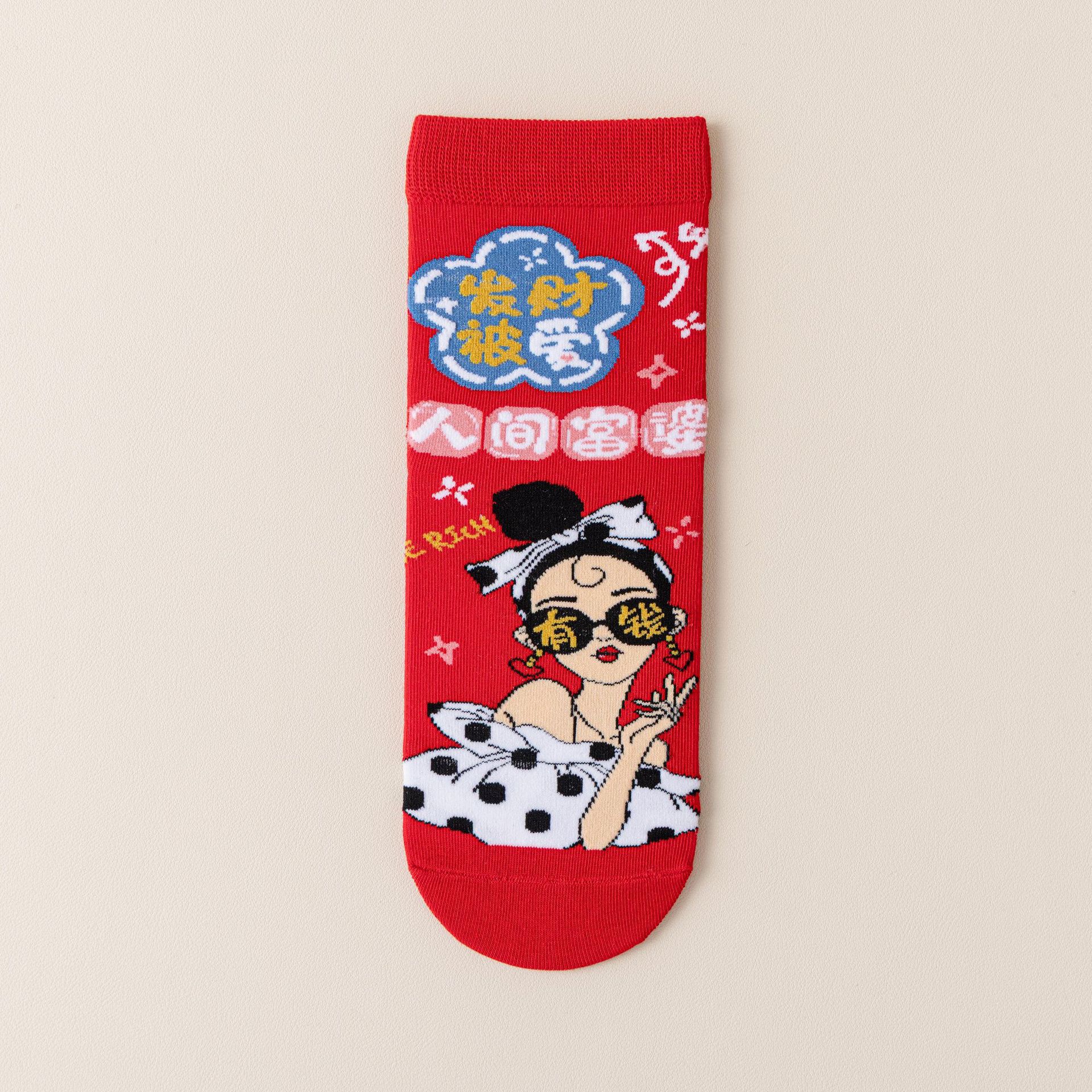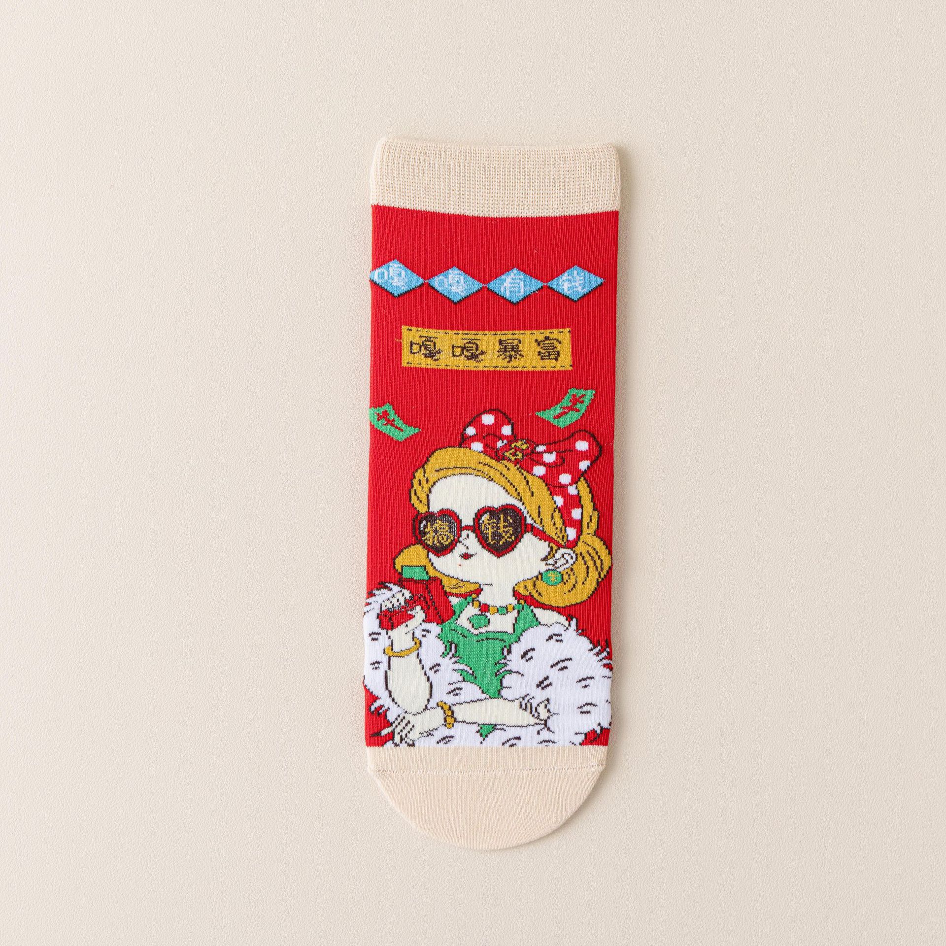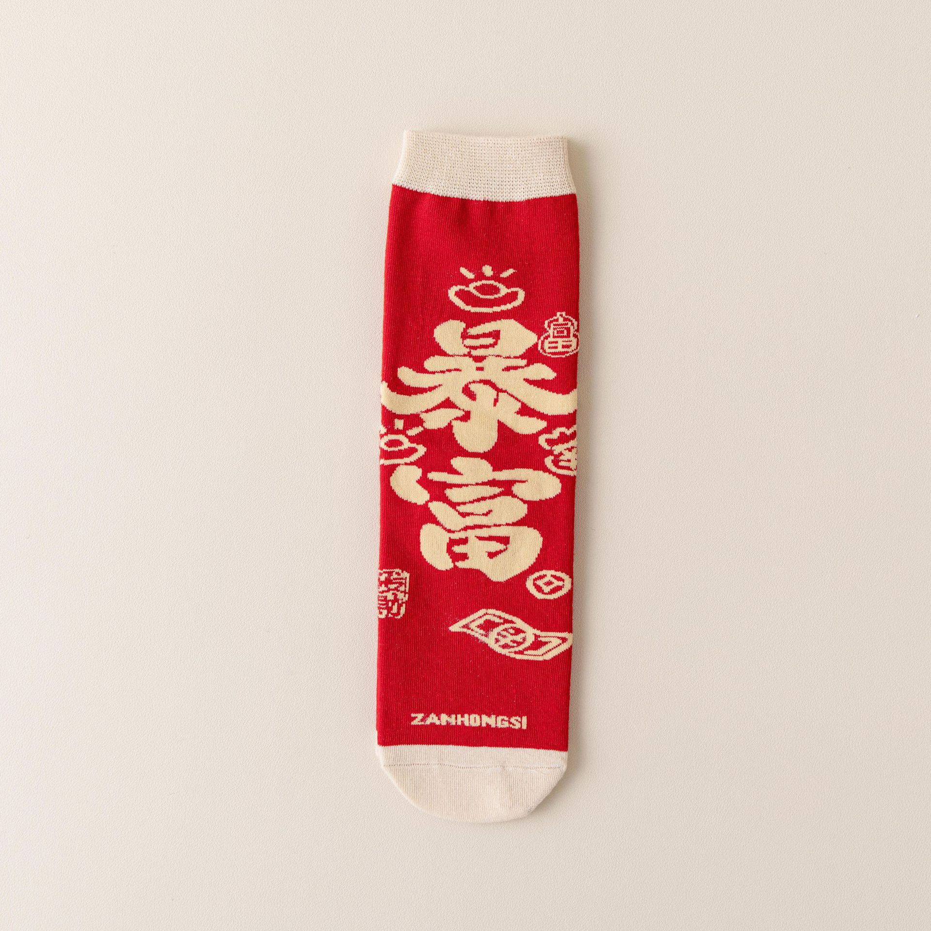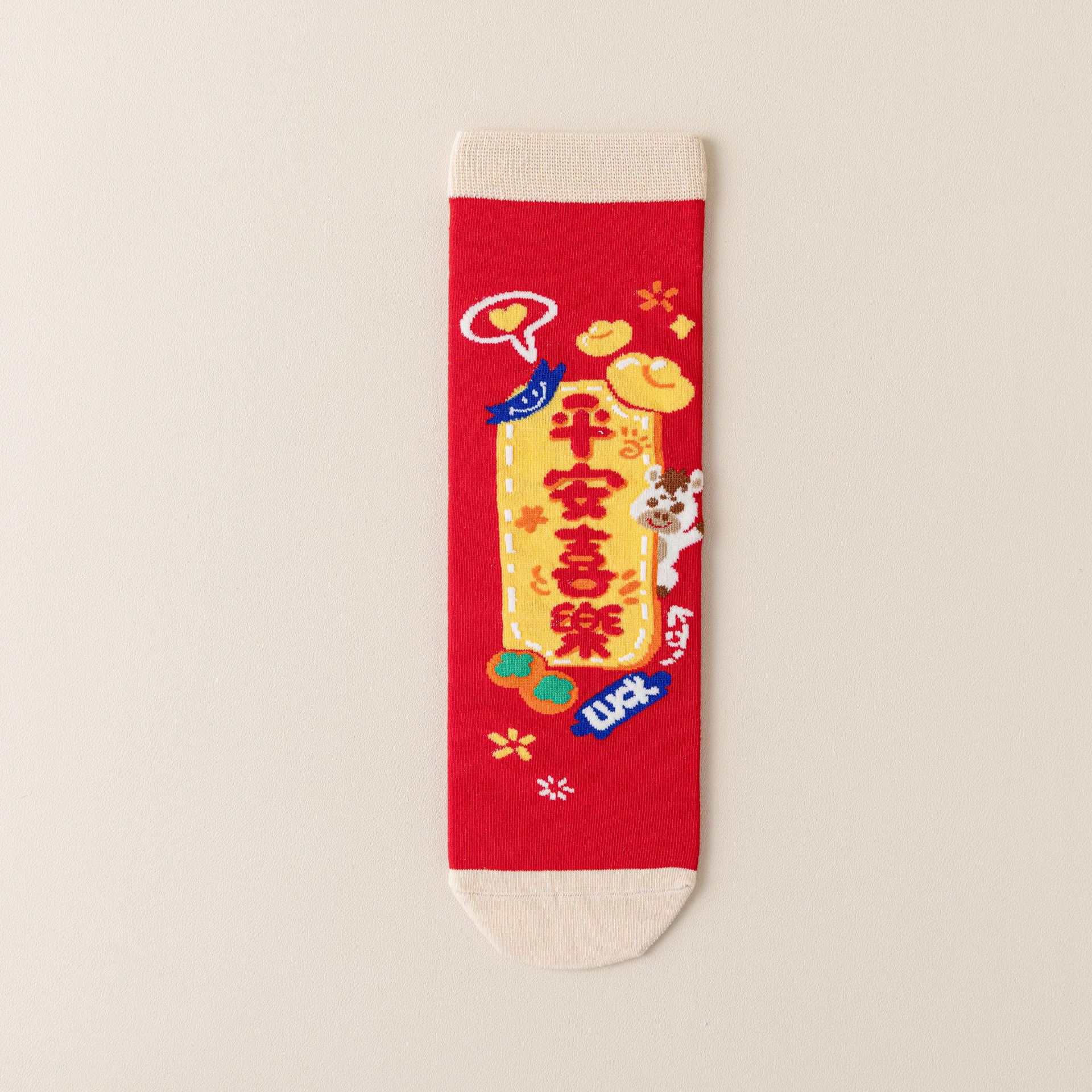말의 해 레드 양말 남녀공용 중간 길이 귀여운 만화풍 고전 인형 축제 커플 결혼 생년월일 레드 면 양말스토어 가기