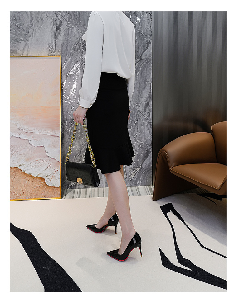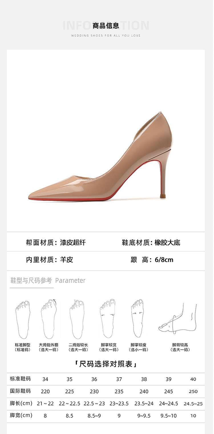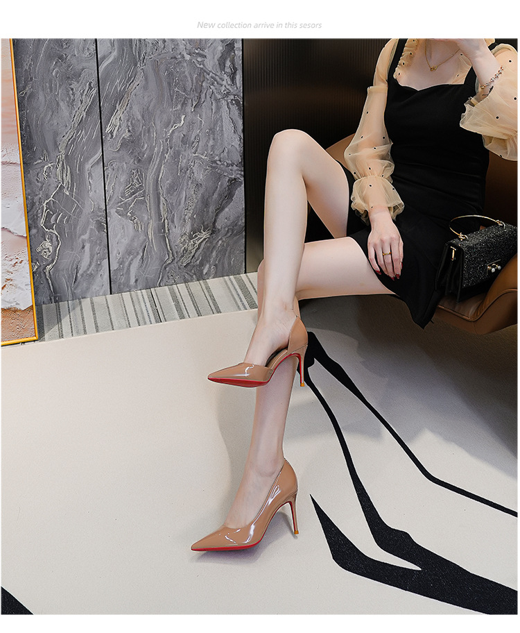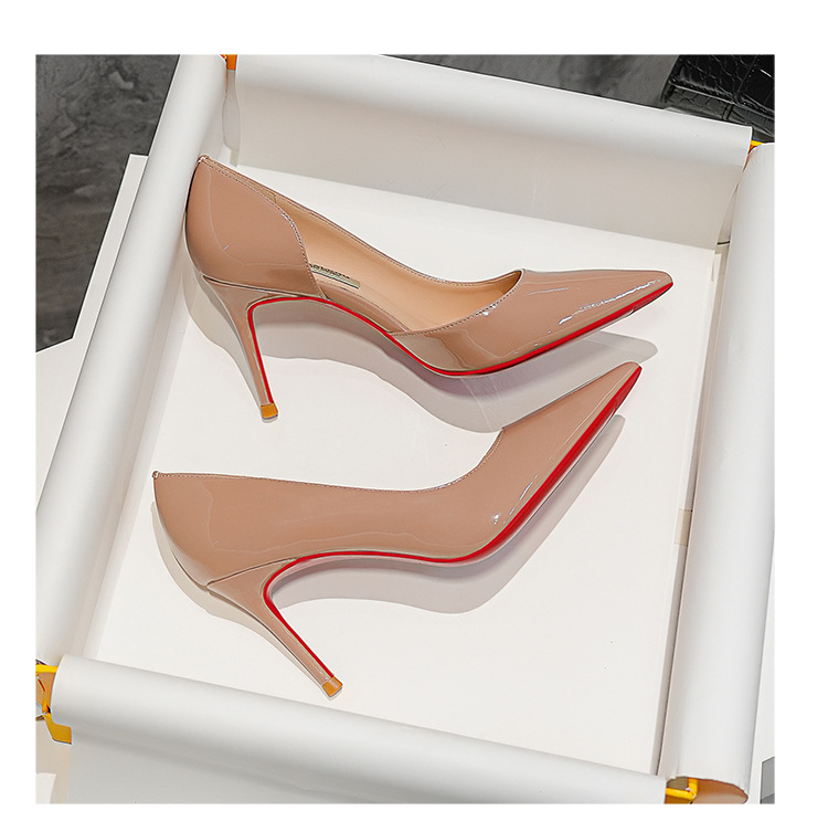 특허 가죽 누드 사이드 빈 슈퍼 하이힐 여성 2024 년 봄 새 뾰족한 스틸레토 힐 얕은 레드 하단 섹시한 8cm 싱글 레이어 신발스토어 가기