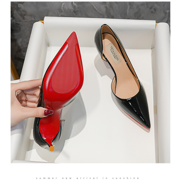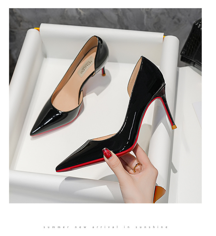 특허 가죽 누드 사이드 빈 슈퍼 하이힐 여성 2024 년 봄 새 뾰족한 스틸레토 힐 얕은 레드 하단 섹시한 8cm 싱글 레이어 신발