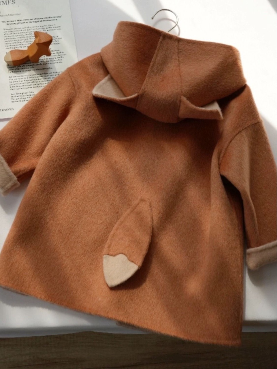 소녀의 외국식 다크 브라운 귀여운 폭스 트위드 코트 중간 길이의 후드 양면 트위드 코트스토어 가기