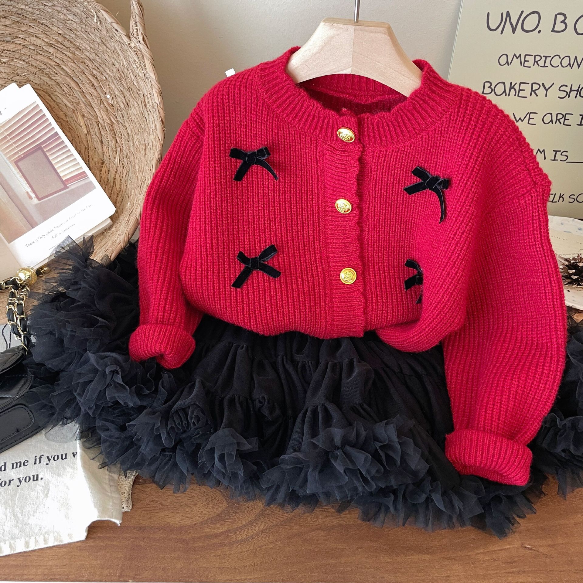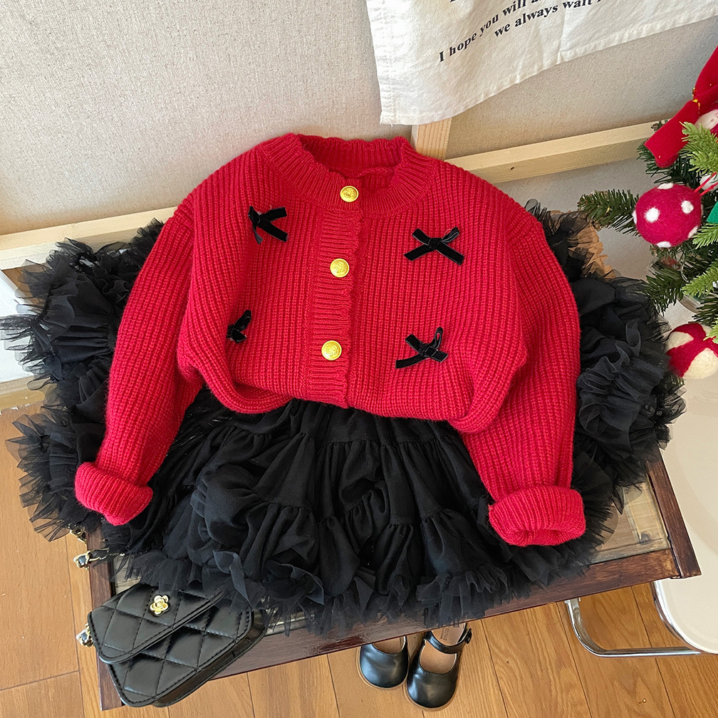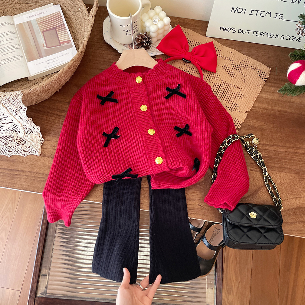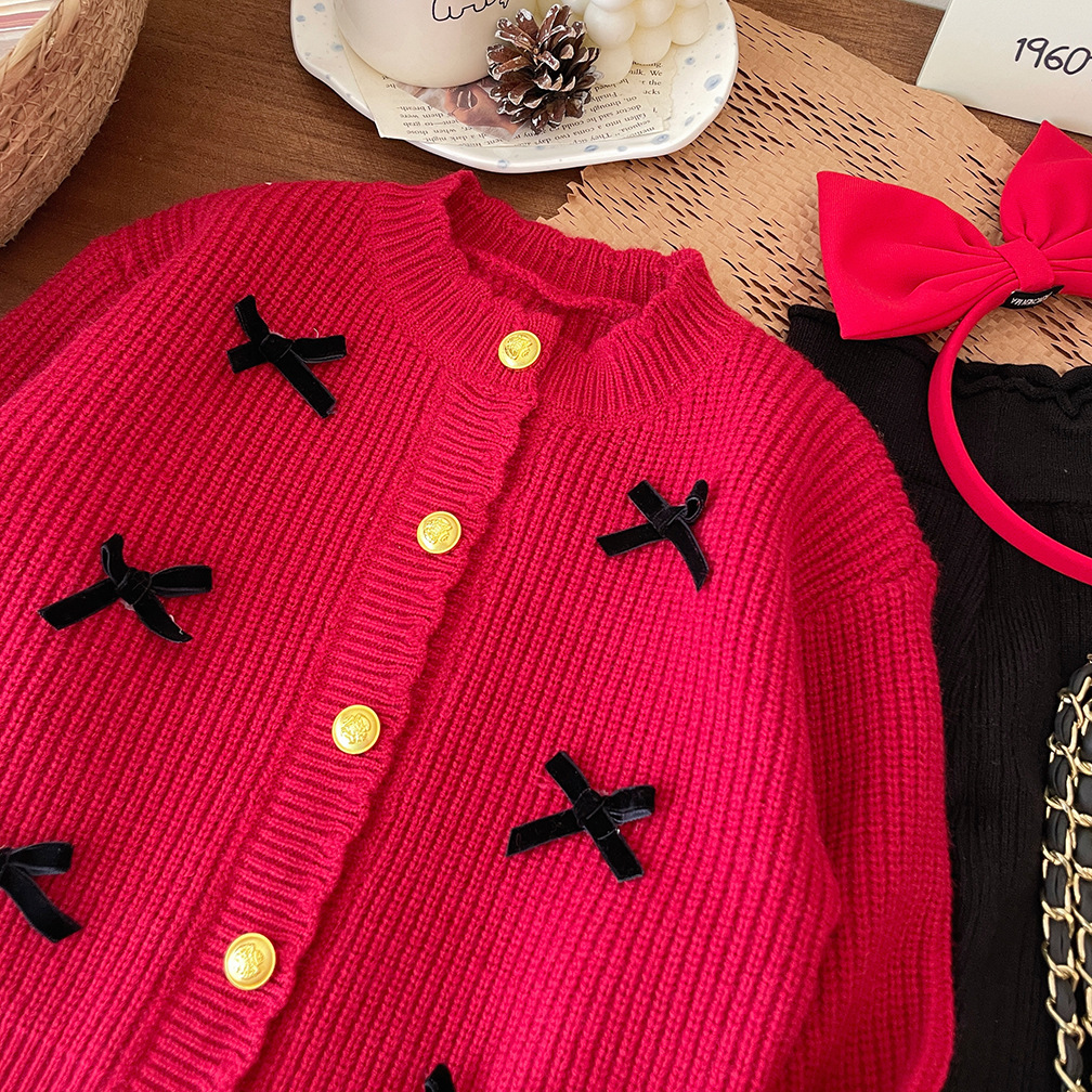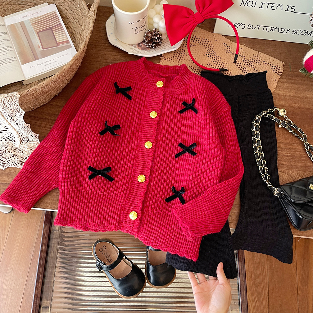한국식 소녀들의 두꺼운 스웨터 가을과 겨울 새로운 아기 빨간 활 니트 카디건 어린이 크리스마스 및 새해 옷