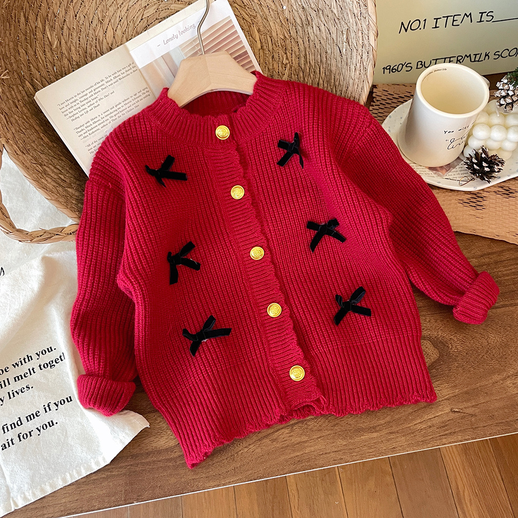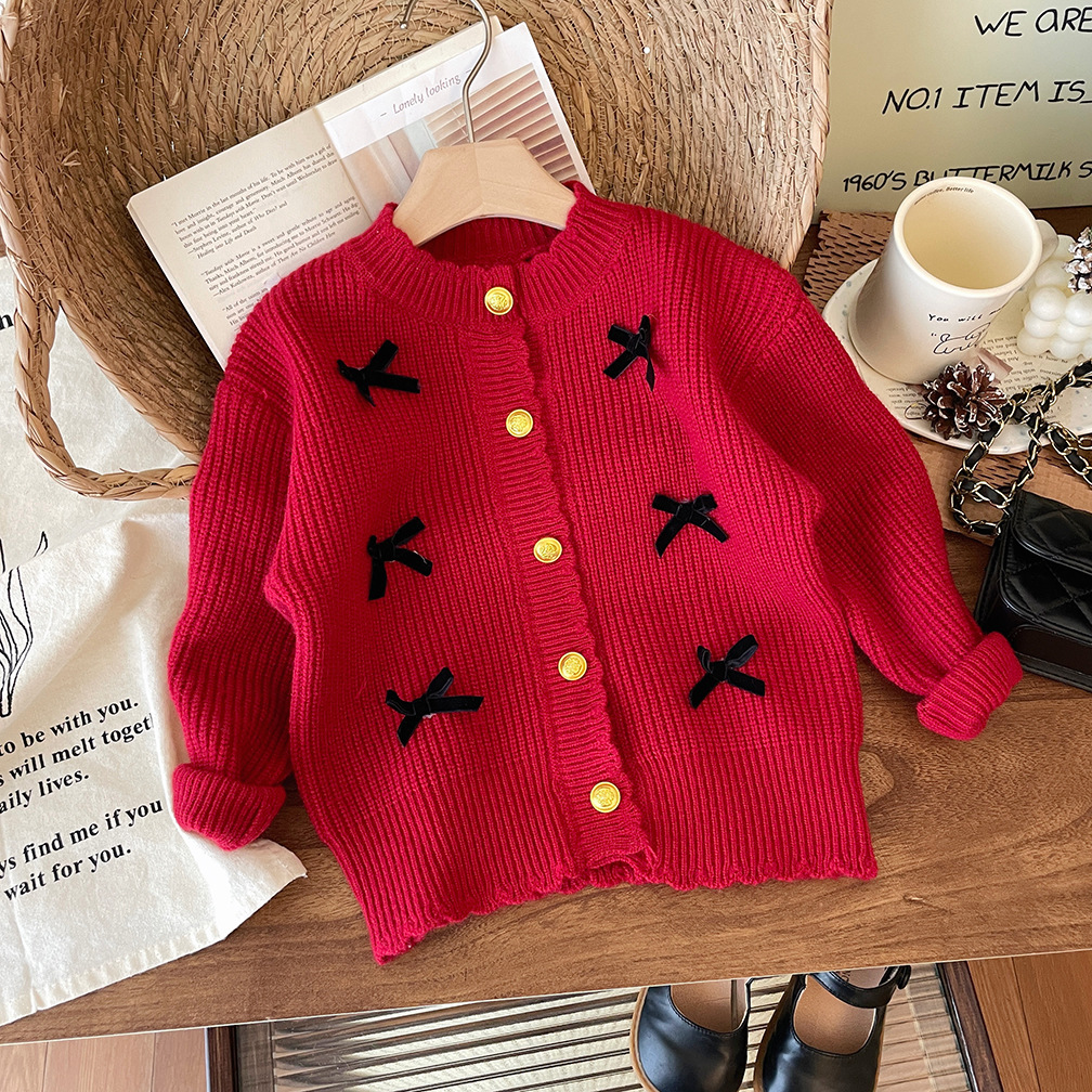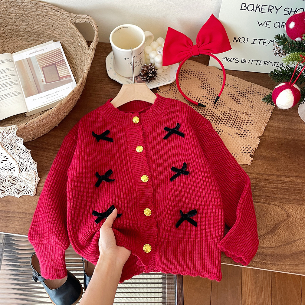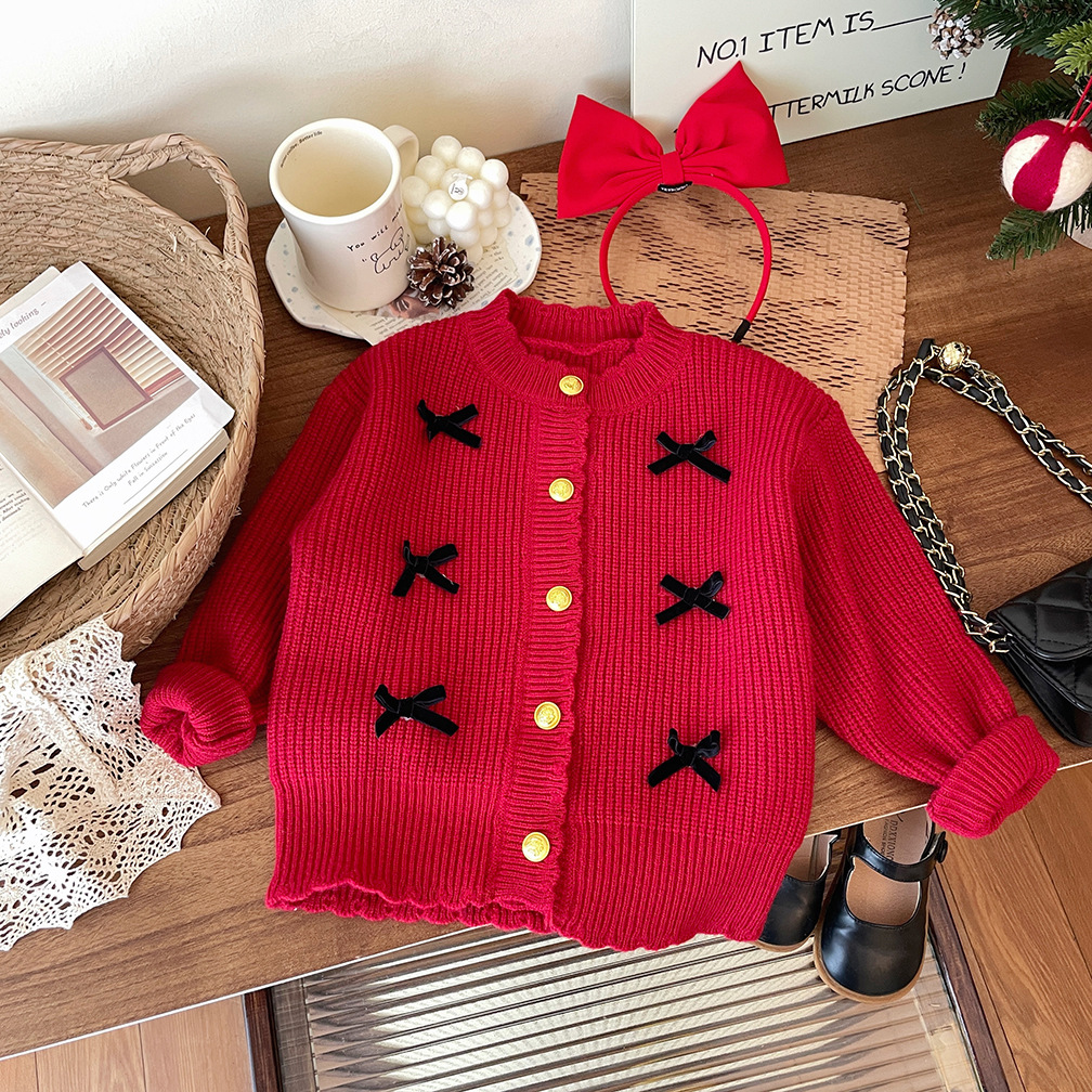 한국식 소녀들의 두꺼운 스웨터 가을과 겨울 새로운 아기 빨간 활 니트 카디건 어린이 크리스마스 및 새해 옷스토어 가기