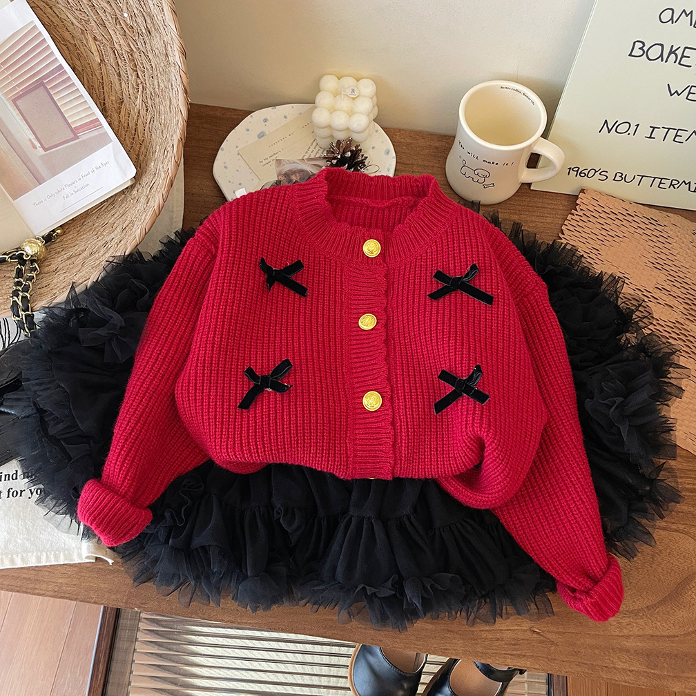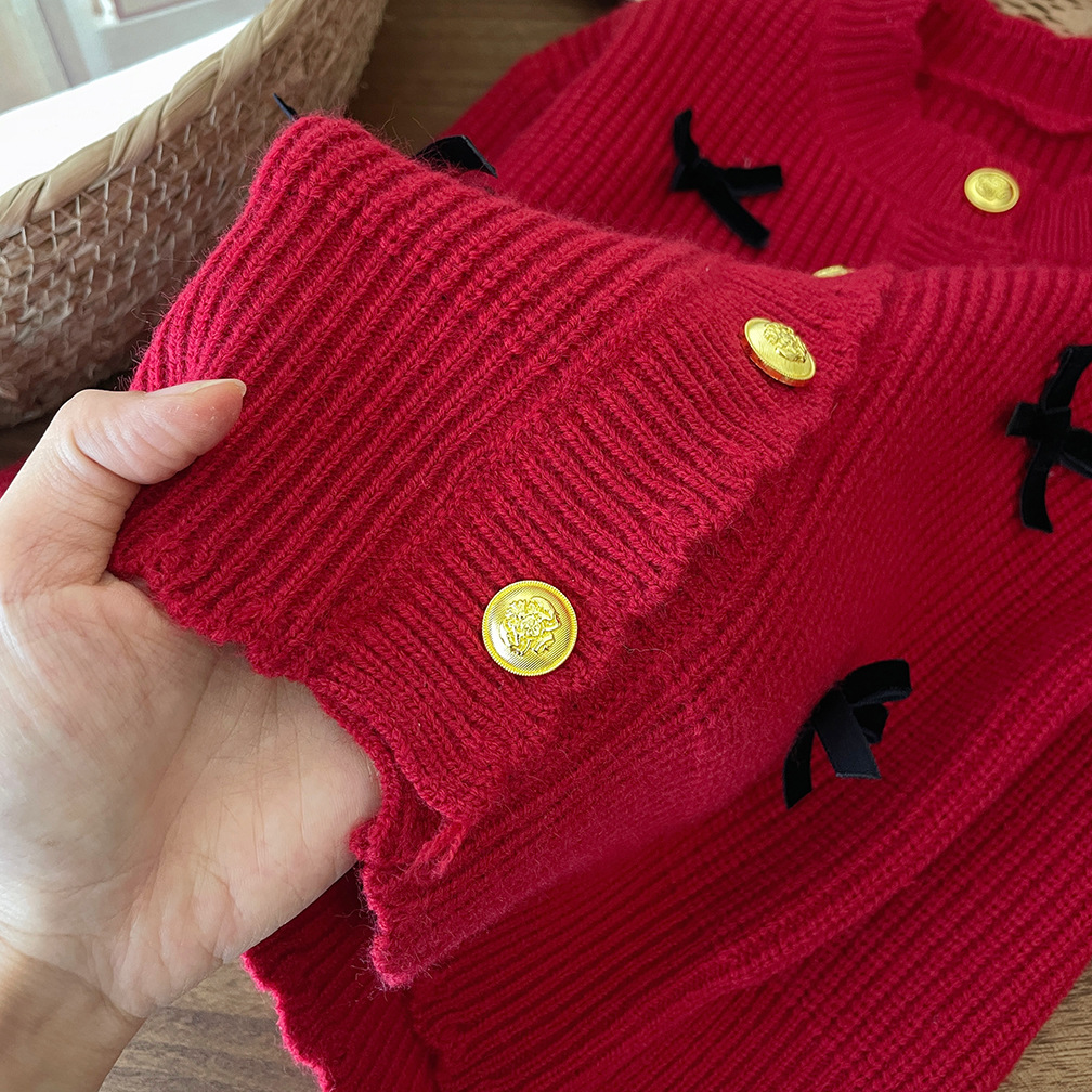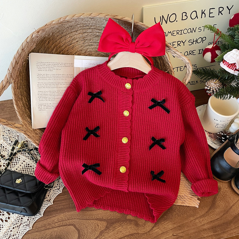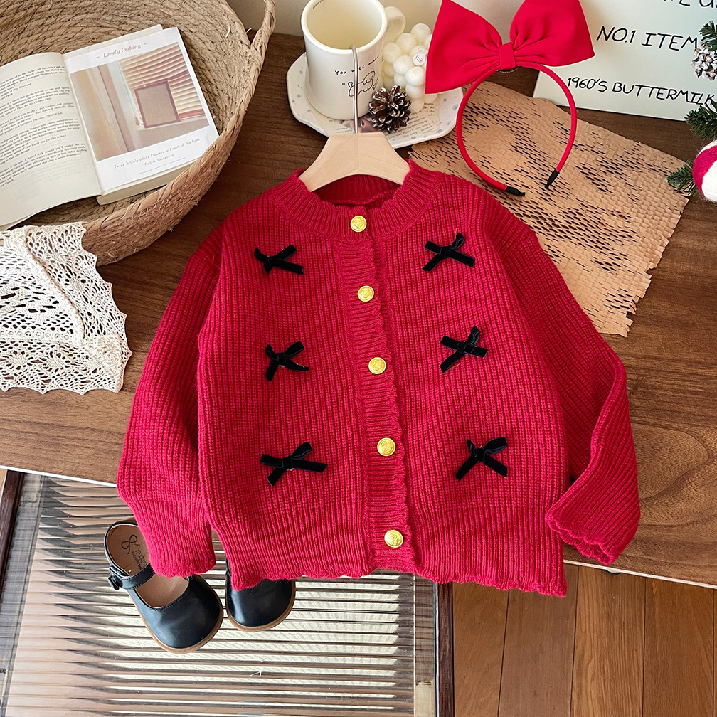 한국식 소녀들의 두꺼운 스웨터 가을과 겨울 새로운 아기 빨간 활 니트 카디건 어린이 크리스마스 및 새해 옷스토어 가기