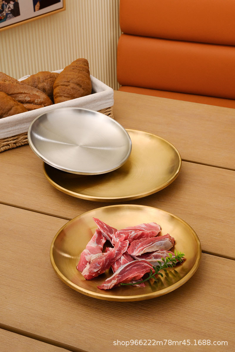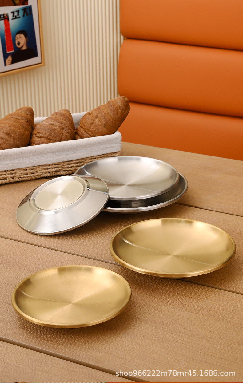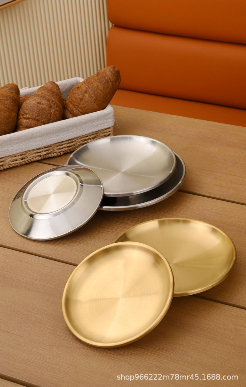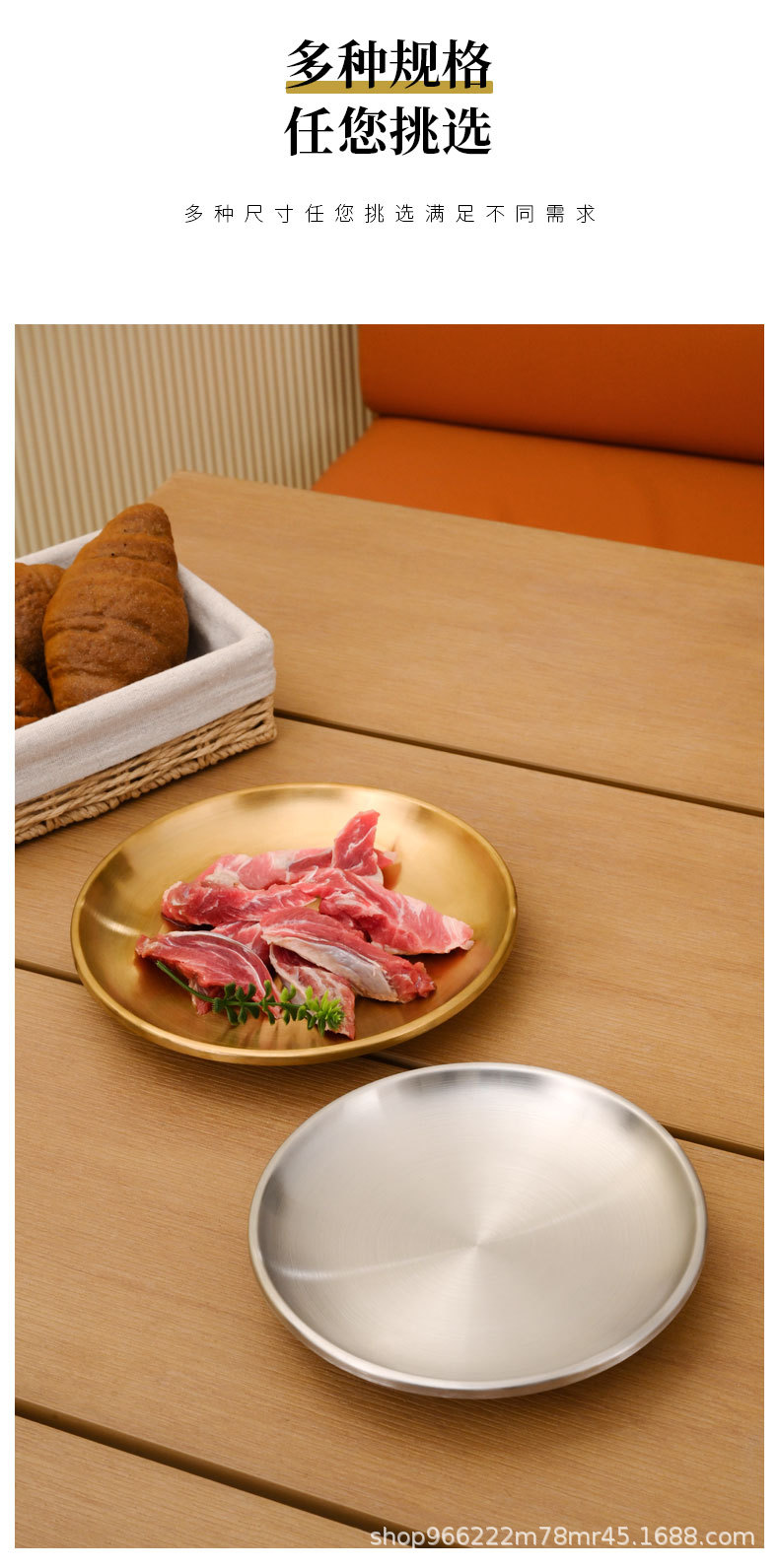 한국식 스테인레스 스틸 플레이트 더블 레이어 황금 접시 과일 플레이트 서양 스테이크 플레이트 상업 바베큐 레스토랑 식기