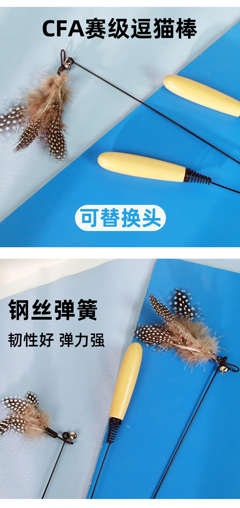 • 厂家直销长杆钢丝逗猫棒羽毛铃铛逗猫杆替换头互动自嗨耐咬猫玩具折扣价:0.8