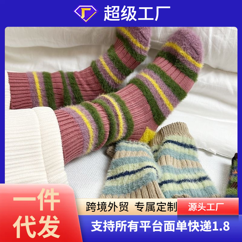 에 한국 스타일 두꺼운 라인 스트라이프 컬러 매칭 콘트라스트 컬러 모조 밍크 모피 양말 달콤한 가을과 겨울 따뜻한 여성의 중간 송아지 길이 양말스토어 가기