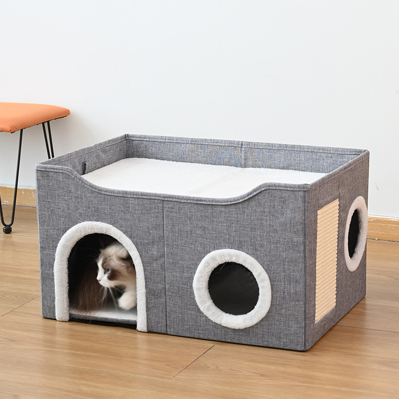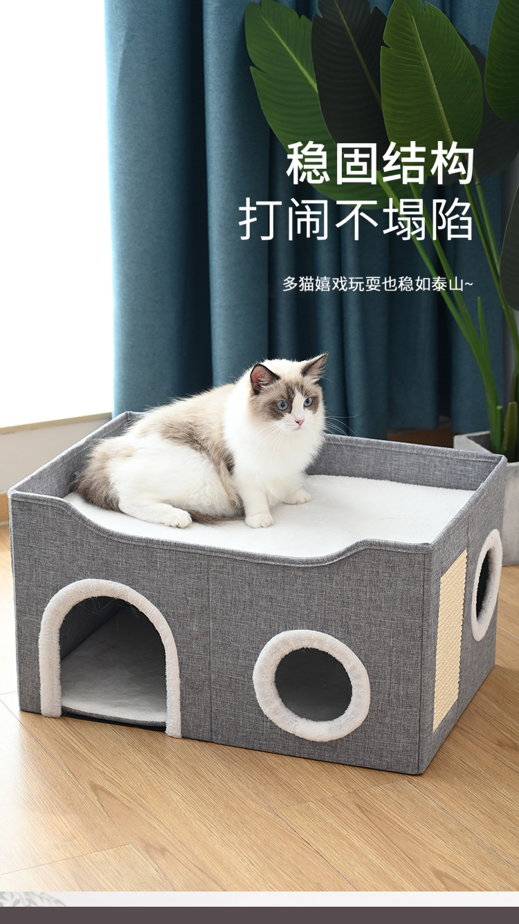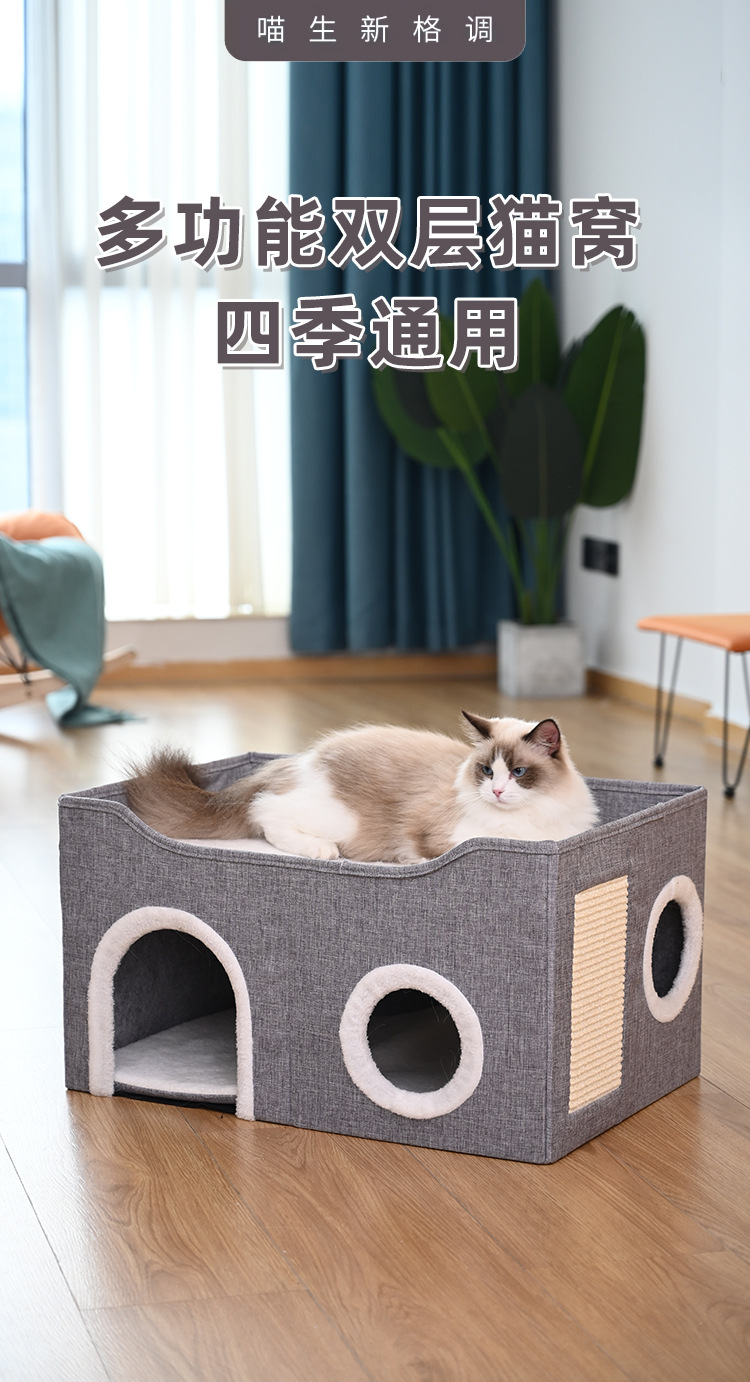 사계절용 애완동물 집, 고양이 집, 이중층 다공성 사자수 발톱 갈이 애완용품, 완전 밀폐형 접이식 개집