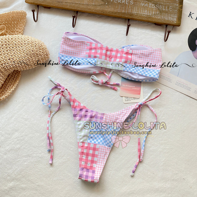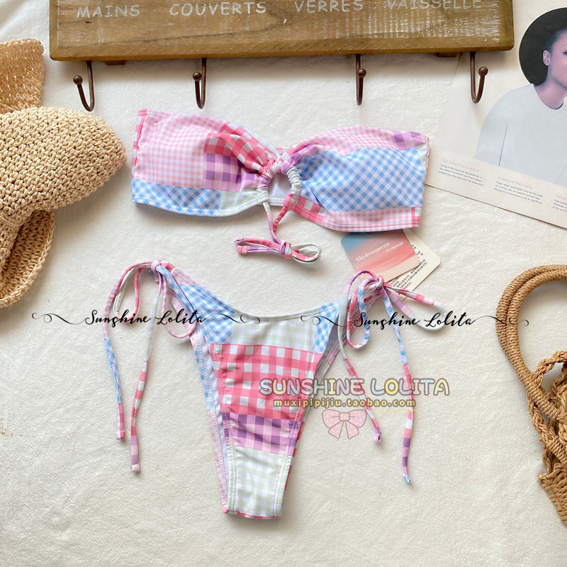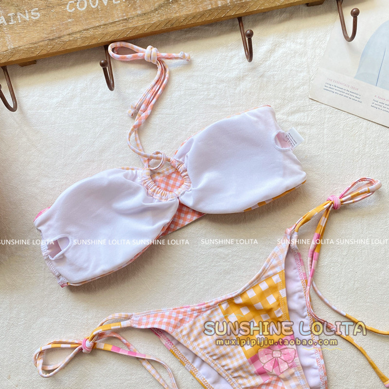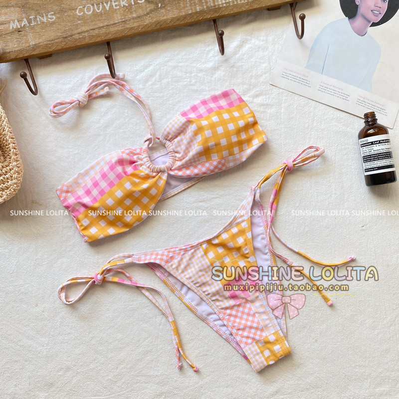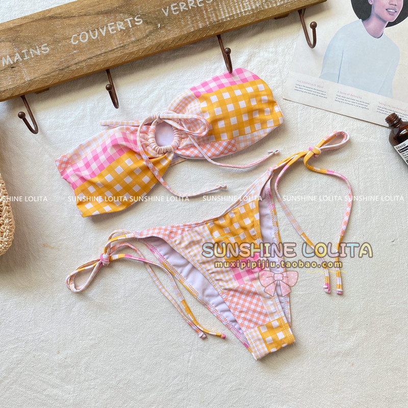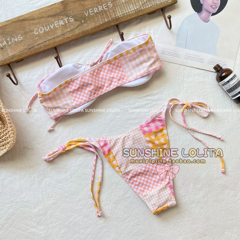 핑크 오렌지 격자 무늬 프린트 튜브 탑 비키니 스트랩 3 점 비키니 서핑 수영복 여성 핫 소녀 싼야 휴가스토어 가기