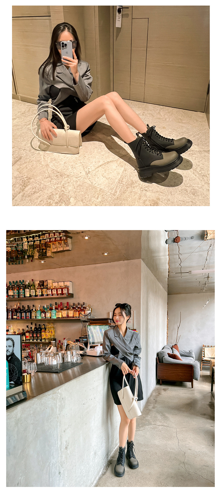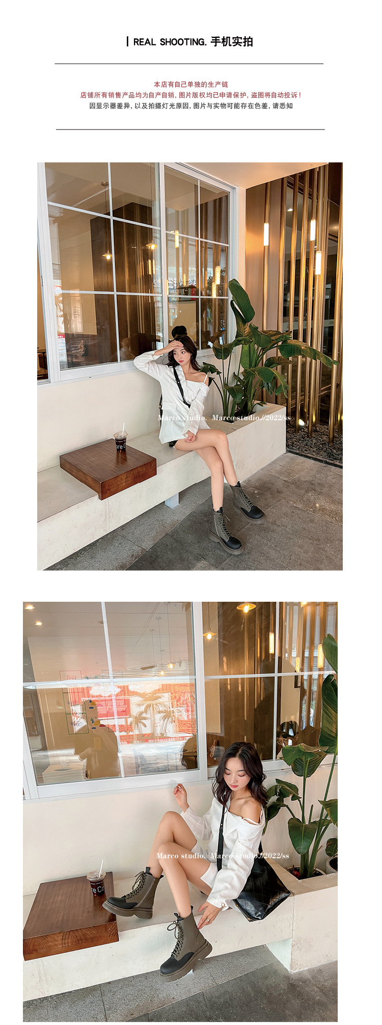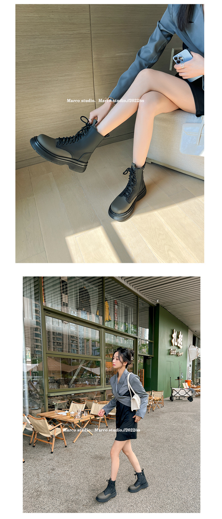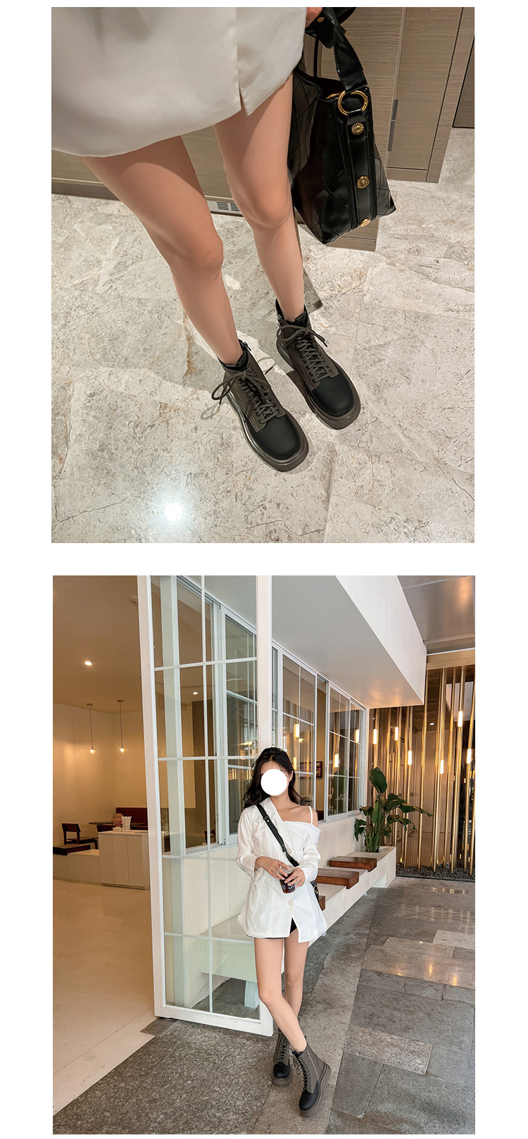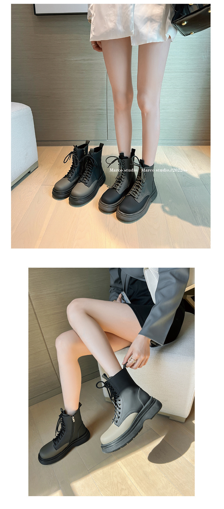 가을과 겨울 컬러 매칭 마틴 부츠 여성 정품 가죽 두꺼운 밑창 영국 스타일 짧은 부츠 레이스 업 스키니 다리 스커트 오토바이 부츠 얇은 단층 부츠스토어 가기