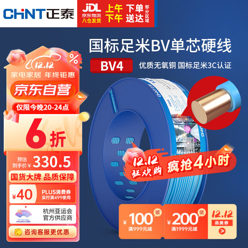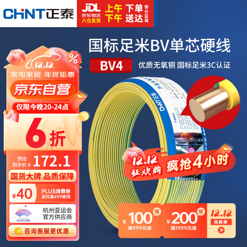 CHNT 와이어 및 케이블 BV4 사각형 단일 코어 단일 스트랜드 구리 와이어 국가 표준 가정 장식 구리 코어 와이어 100 m스토어 가기
