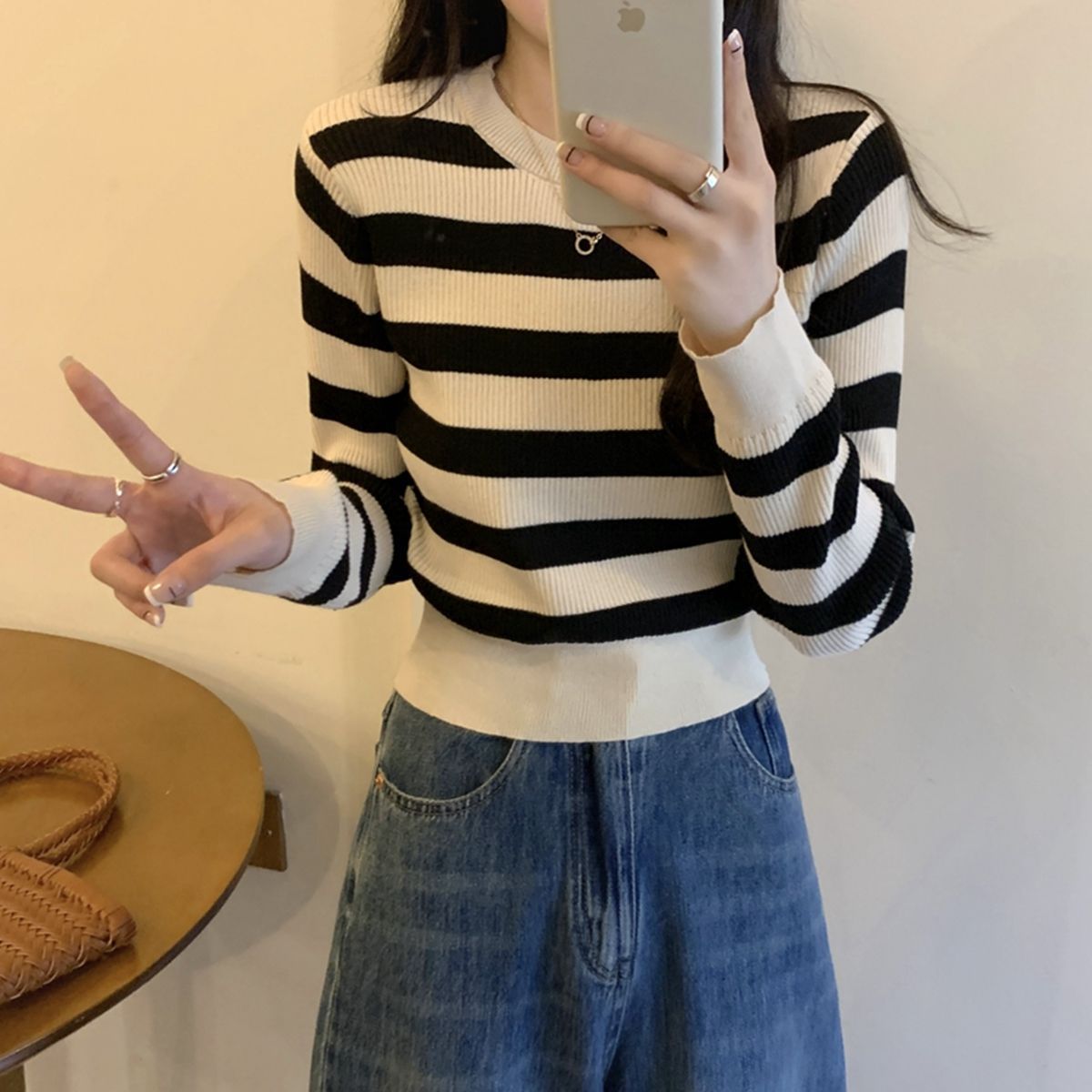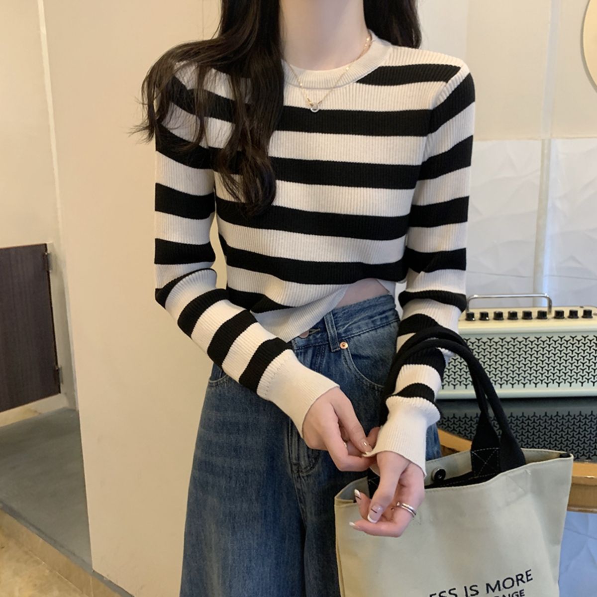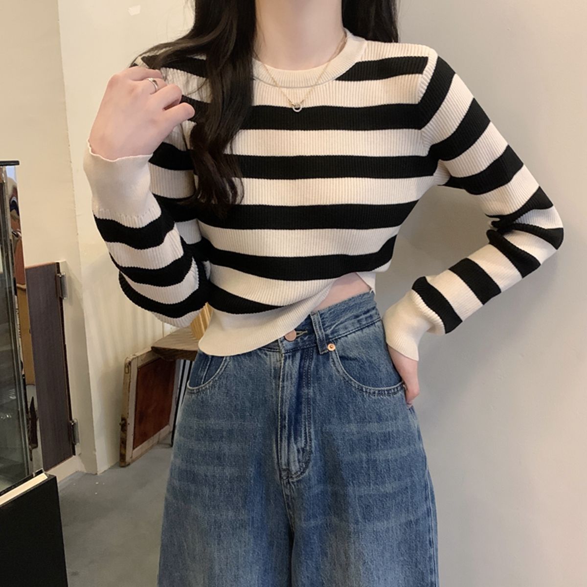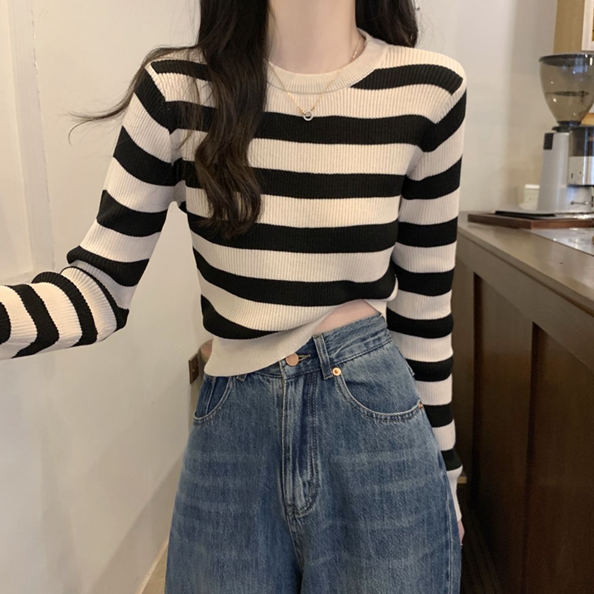 국경 줄무늬 짧은 긴팔 스웨터 언더 셔츠 2024 새로운 유행 간단한 슬리밍 다용도 탑스토어 가기