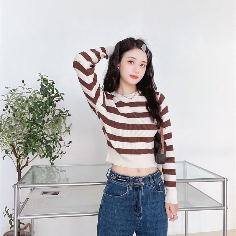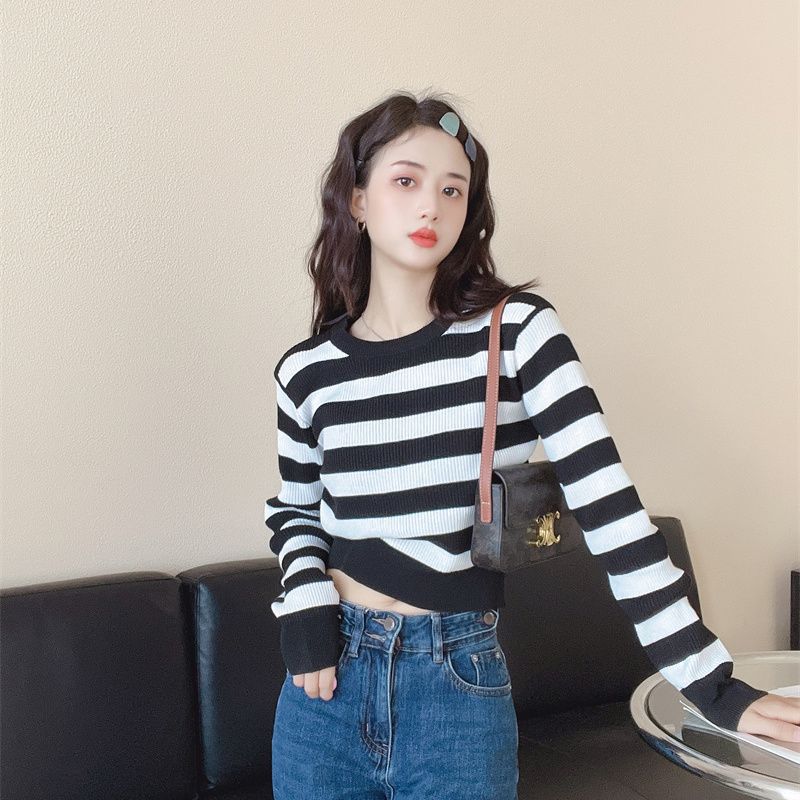 국경 줄무늬 짧은 긴팔 스웨터 언더 셔츠 2024 새로운 유행 간단한 슬리밍 다용도 탑