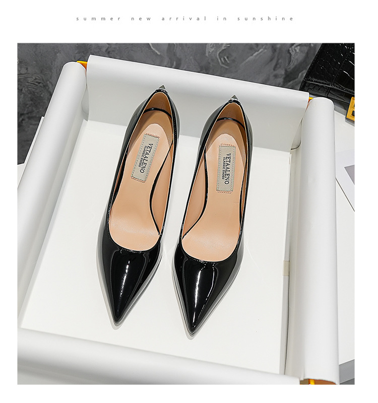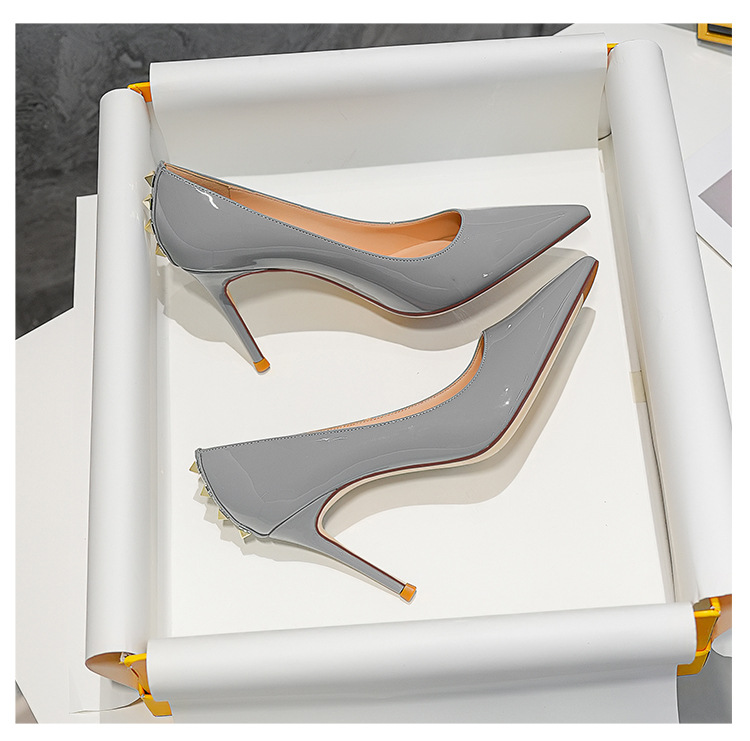 리벳 하이힐 여성용 2025 봄 신상품, 우아하고 다재다능한 뾰족코 얇은 굽의 에나멜 가죽 구두, 출퇴근용 작업화스토어 가기