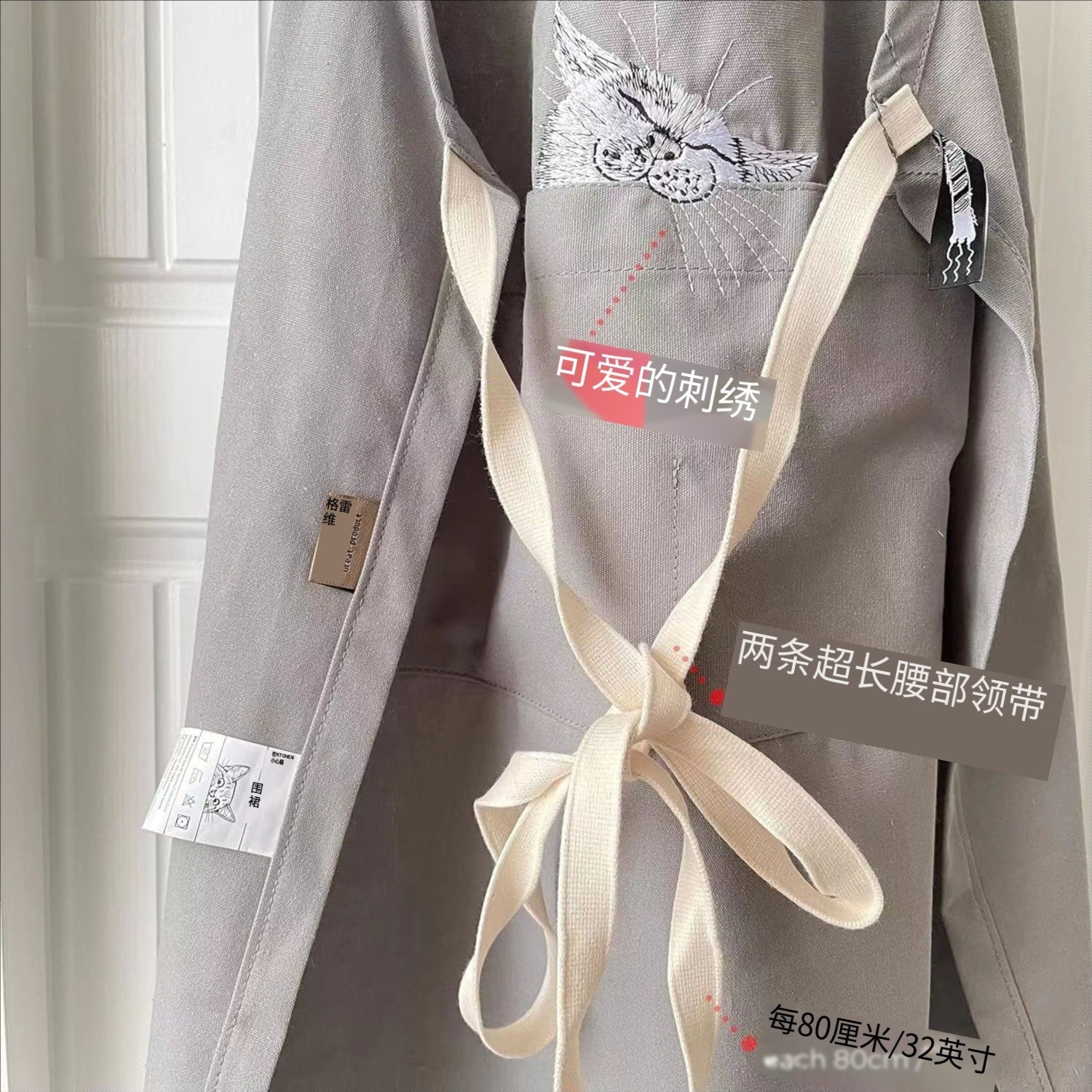 任何人都可以使用的均码围裙尺寸(约):宽64×全长90厘米,重量(约):200克。棉100%、刺绣线、聚酯纤维100% 洗衣机。
