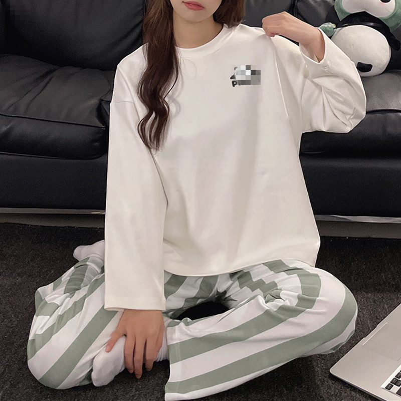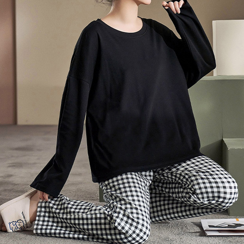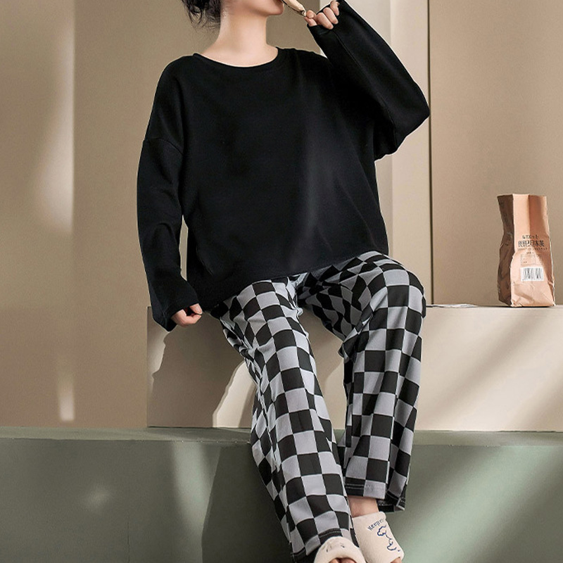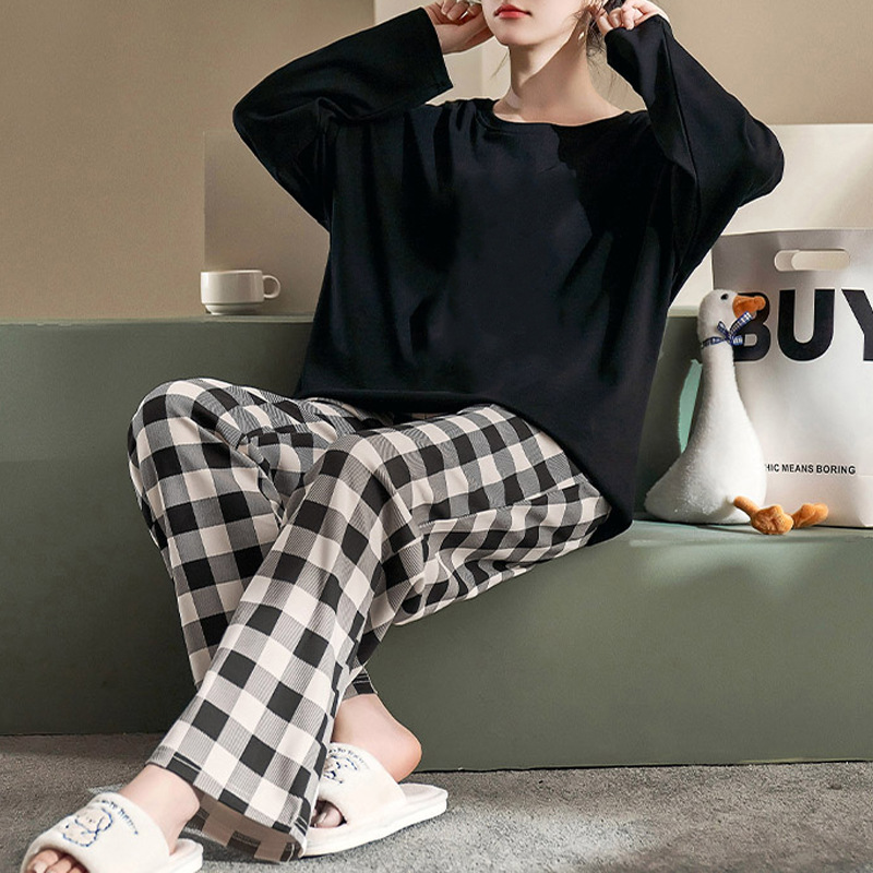 이 여성 잠옷 봄 얇은 둥근 목 우유 실크 체크 무늬 바지 긴 소매 느슨한 캐주얼 소녀 홈웨어 여름스토어 가기
