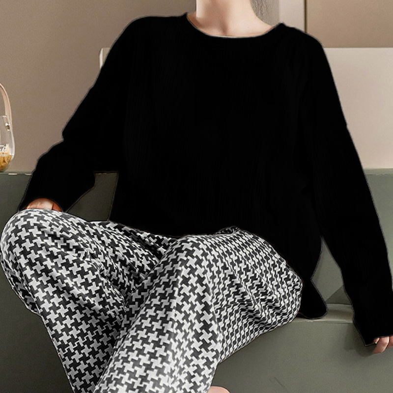 이 여성 잠옷 봄 얇은 둥근 목 우유 실크 체크 무늬 바지 긴 소매 느슨한 캐주얼 소녀 홈웨어 여름