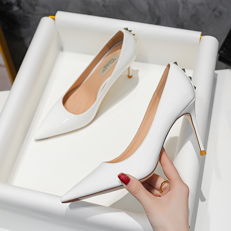 2024 년 봄과 여름 새로운 인터넷 기념 프랑스 특허 가죽 화이트 하이힐 여성용 스틸레토 힐 뾰족한 섹시한 누드 신발스토어 가기