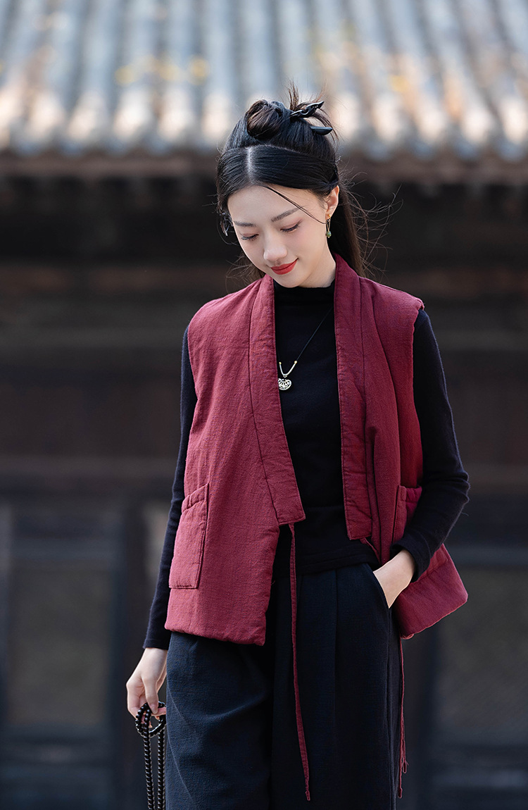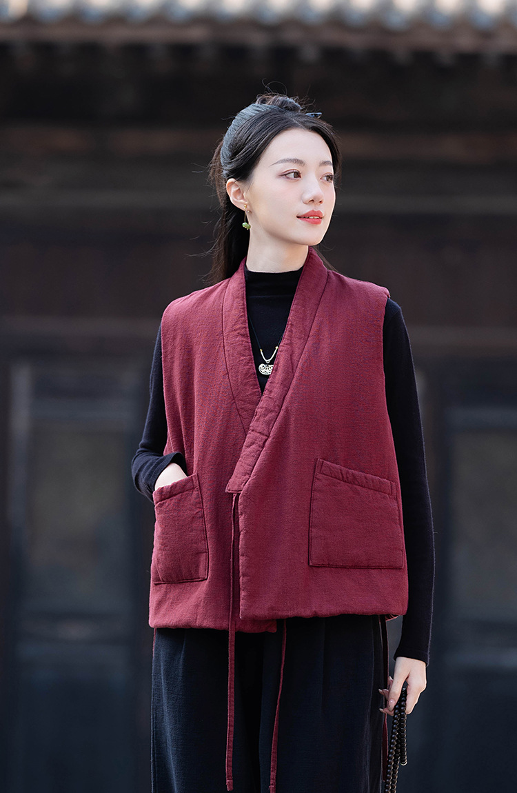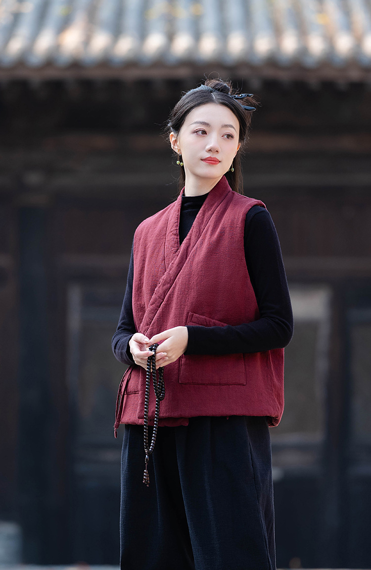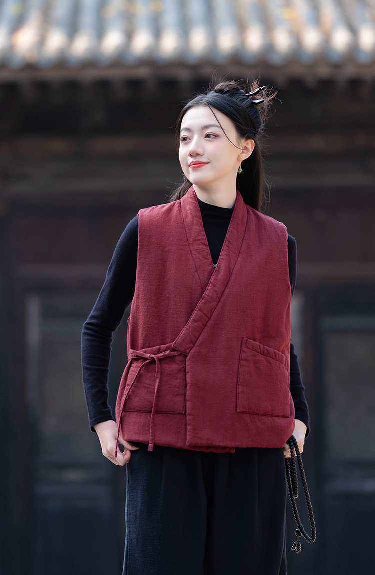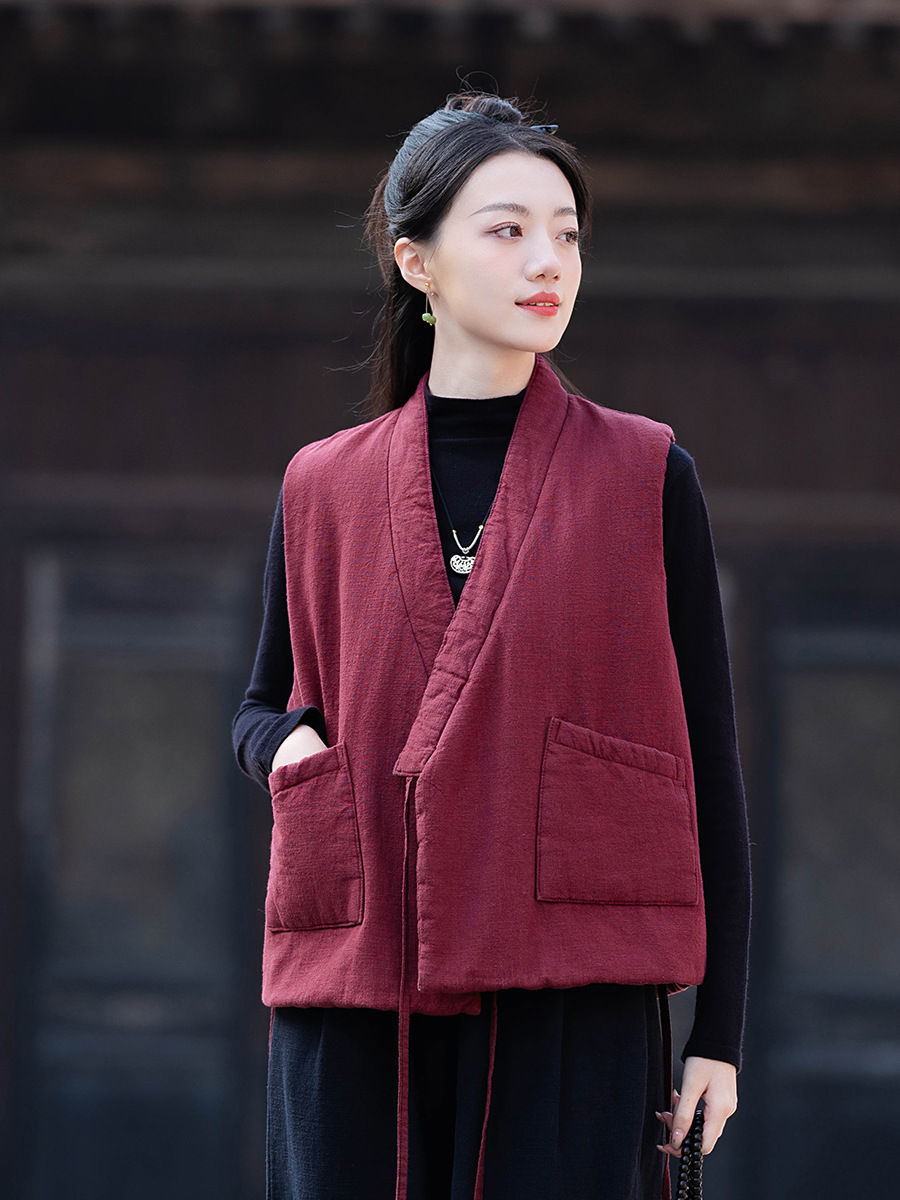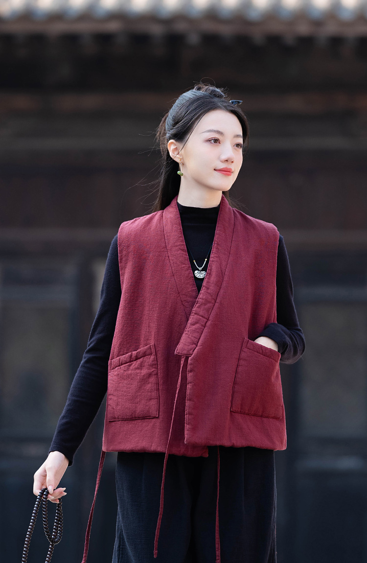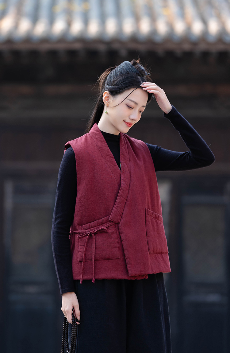 25 겨울용 면마 여성복 신상품 중국풍 레트로 샌드워싱 브이넥 조끼 여성용 아우터 면마 누빔 두꺼운 면조끼