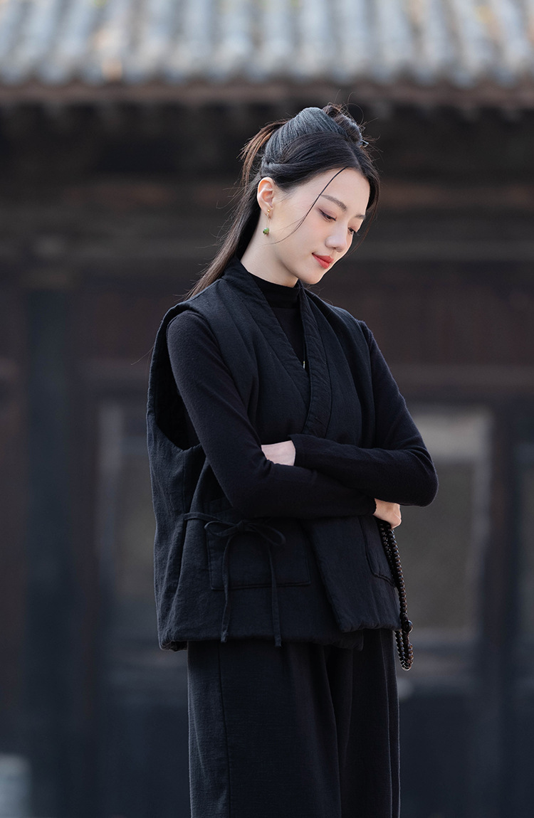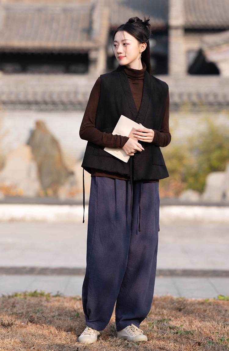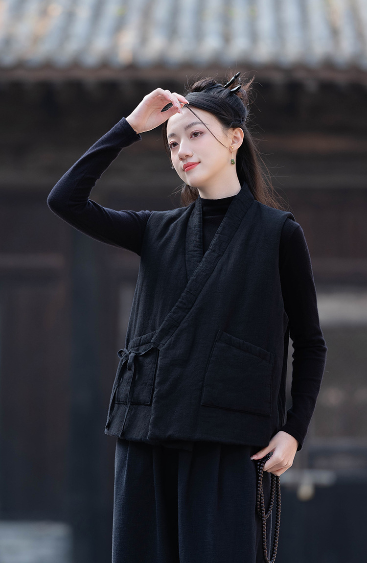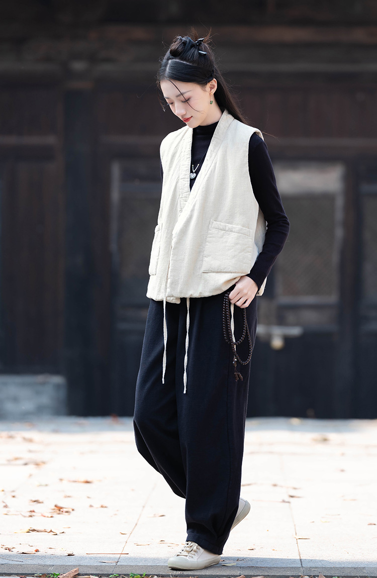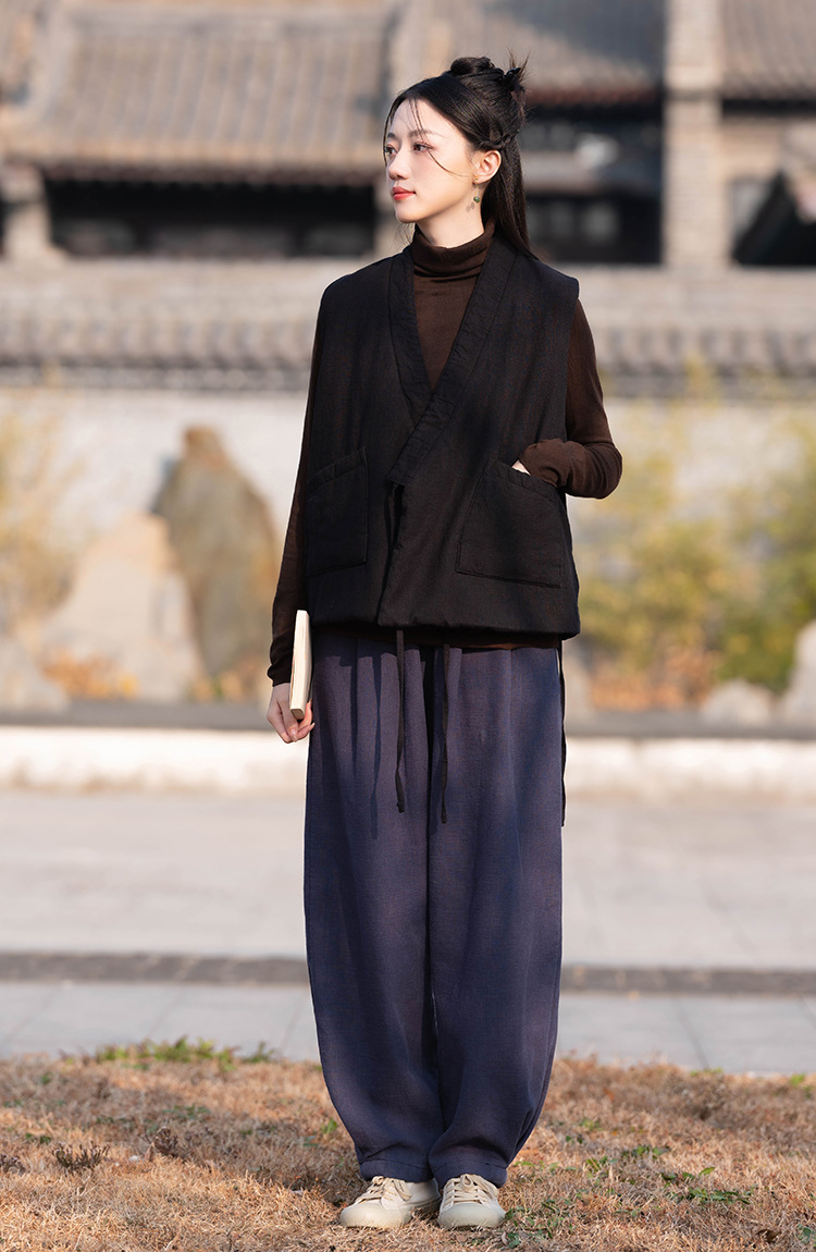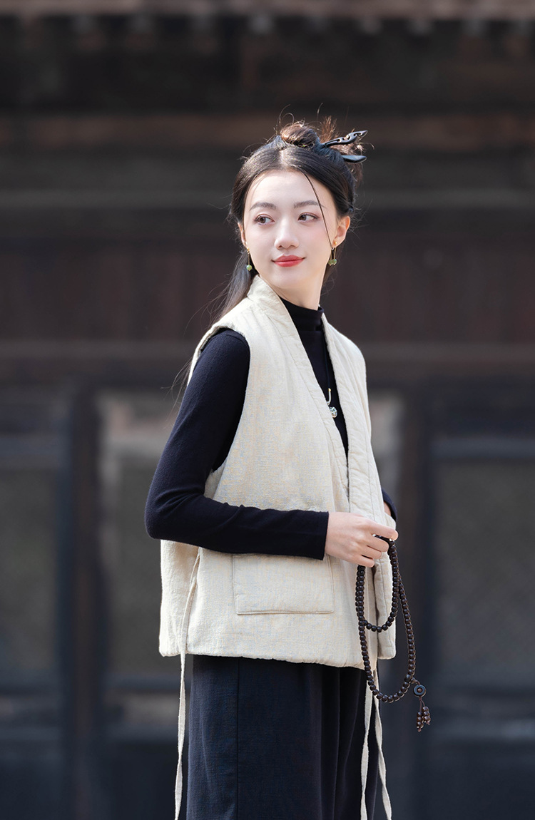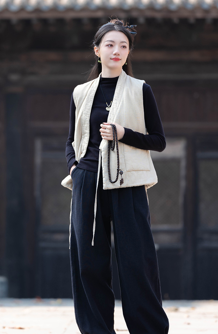 25 겨울용 면마 여성복 신상품 중국풍 레트로 샌드워싱 브이넥 조끼 여성용 아우터 면마 누빔 두꺼운 면조끼