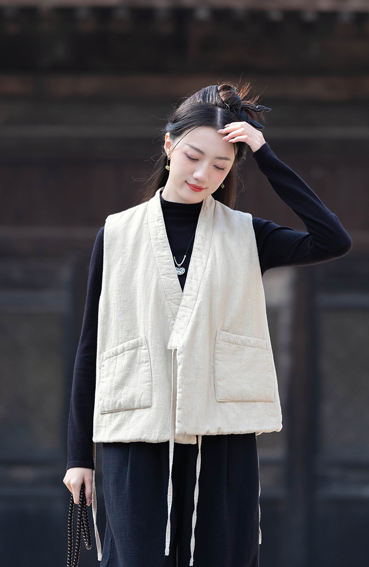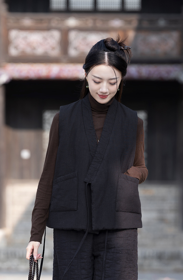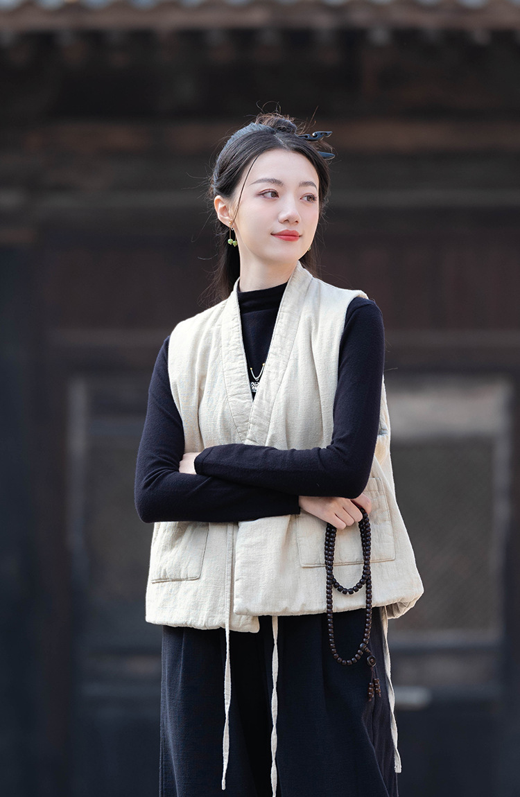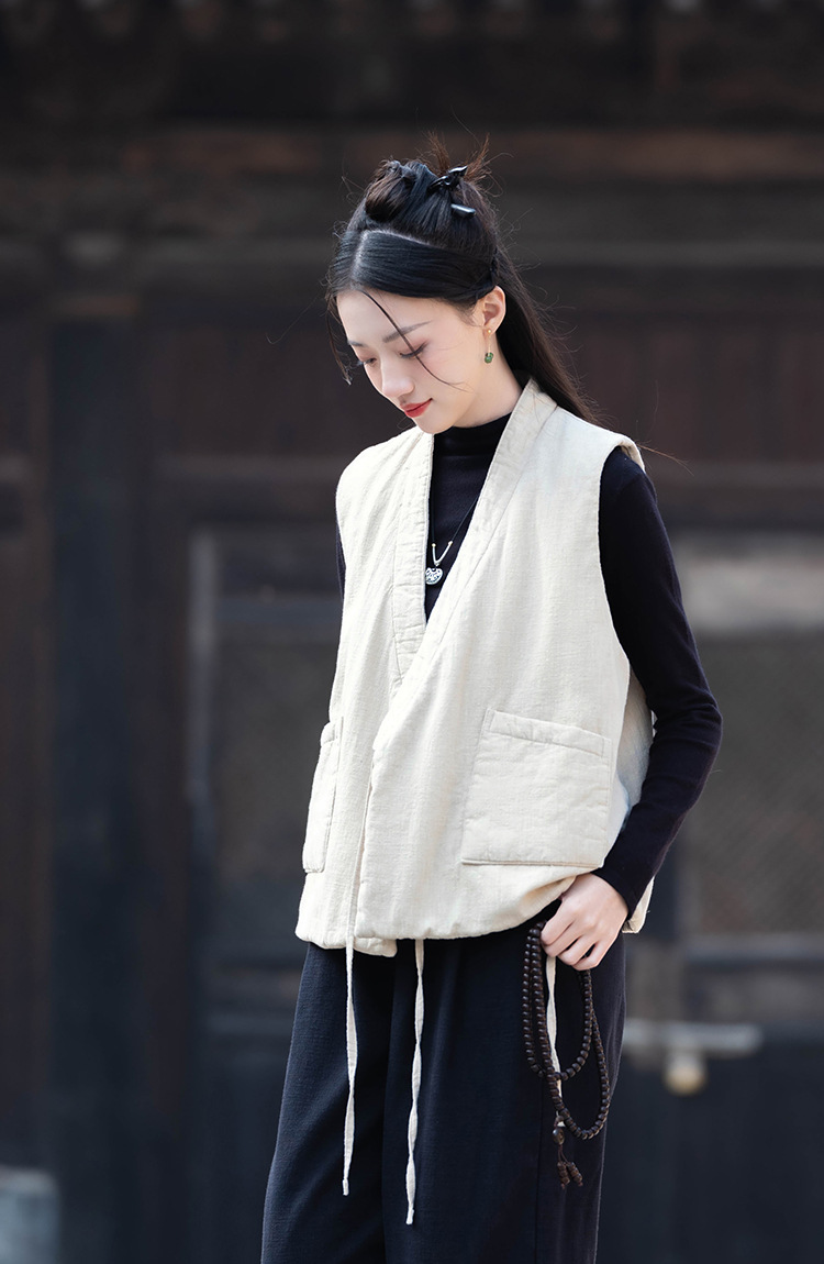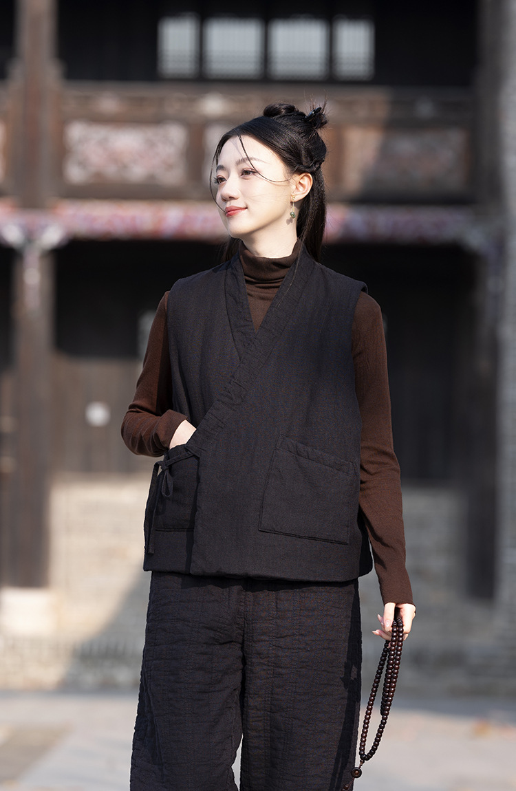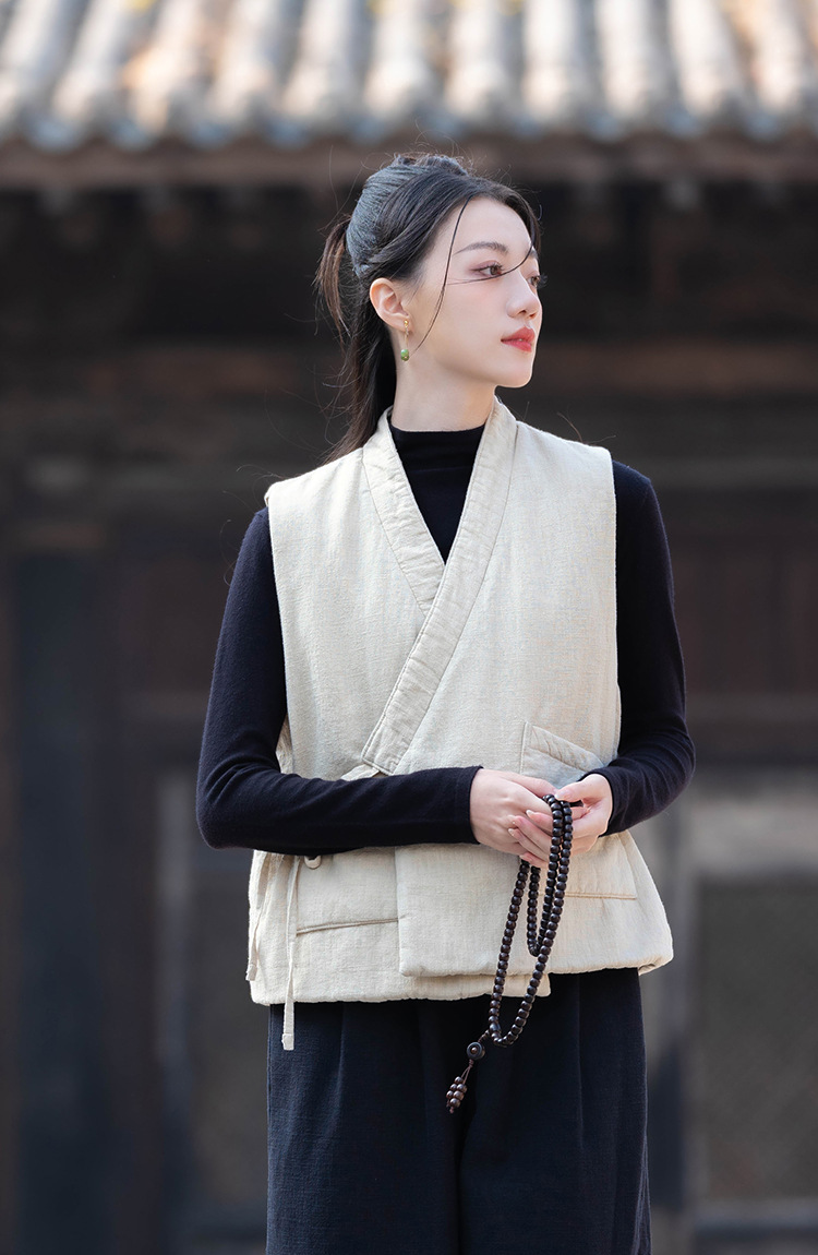 25 겨울용 면마 여성복 신상품 중국풍 레트로 샌드워싱 브이넥 조끼 여성용 아우터 면마 누빔 두꺼운 면조끼스토어 가기