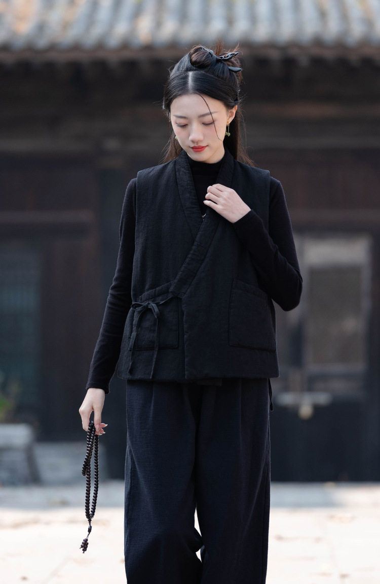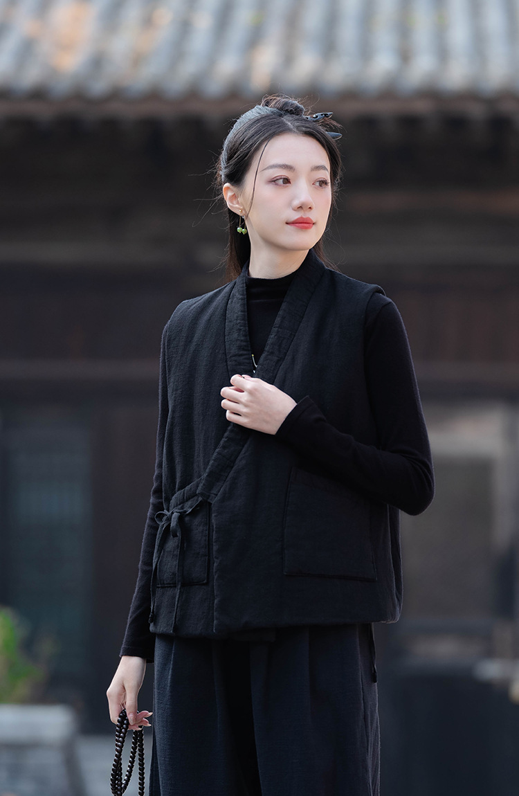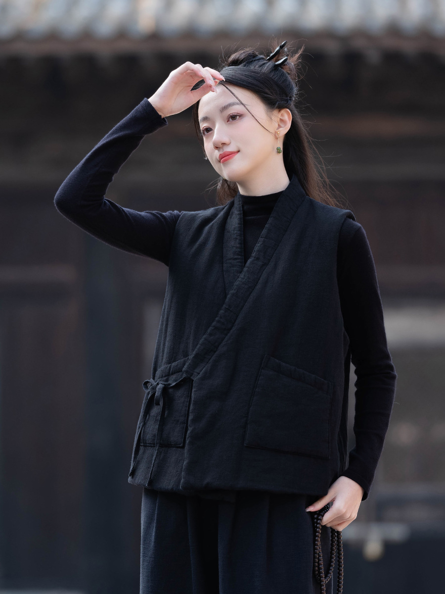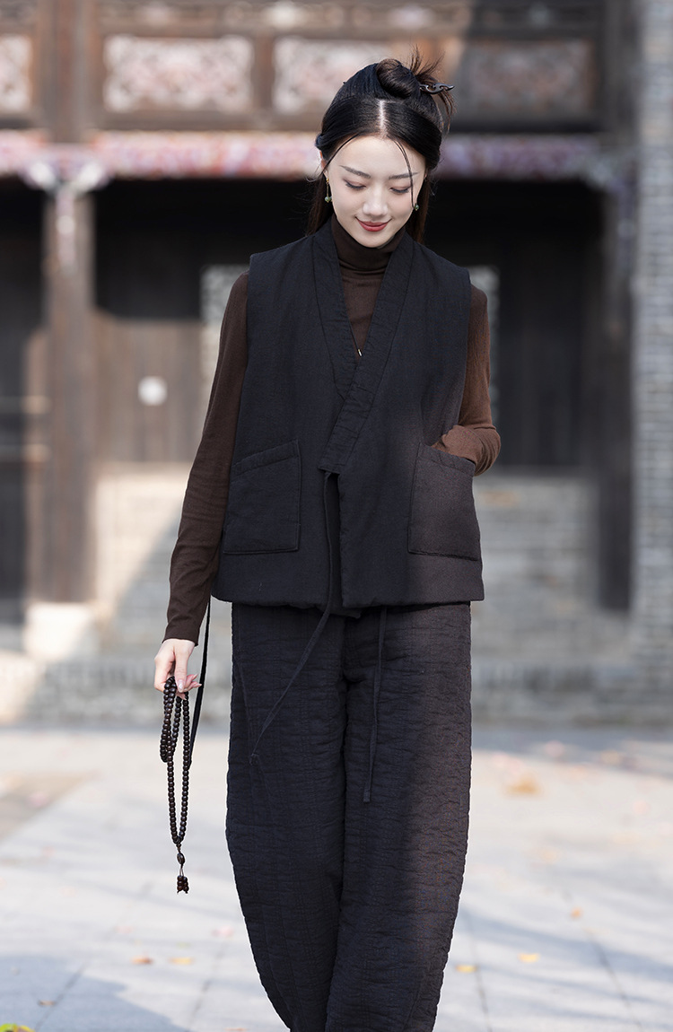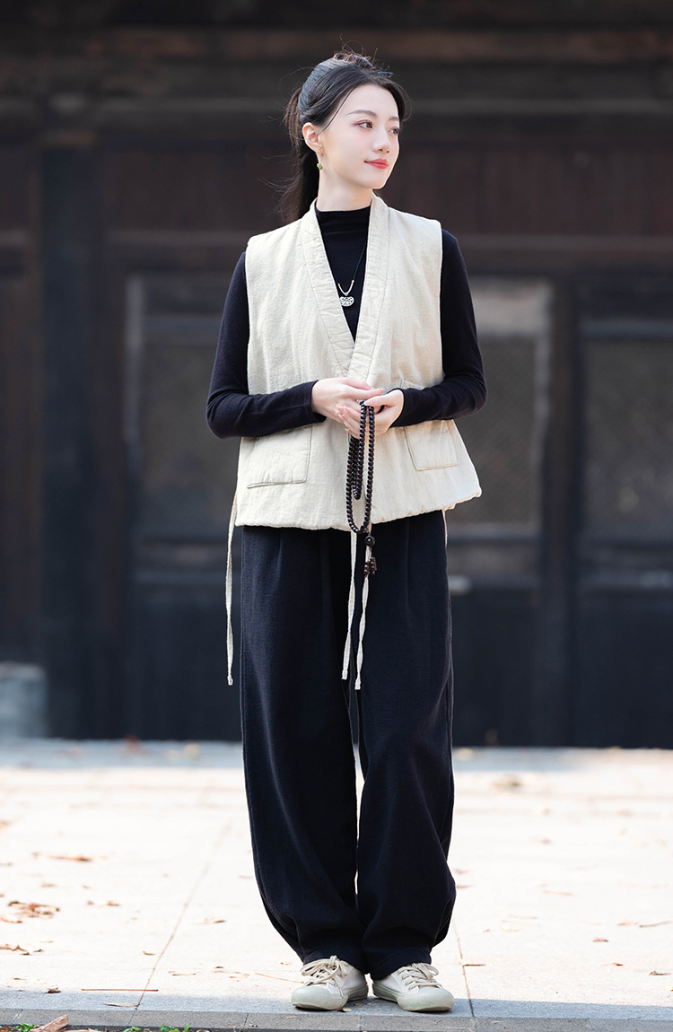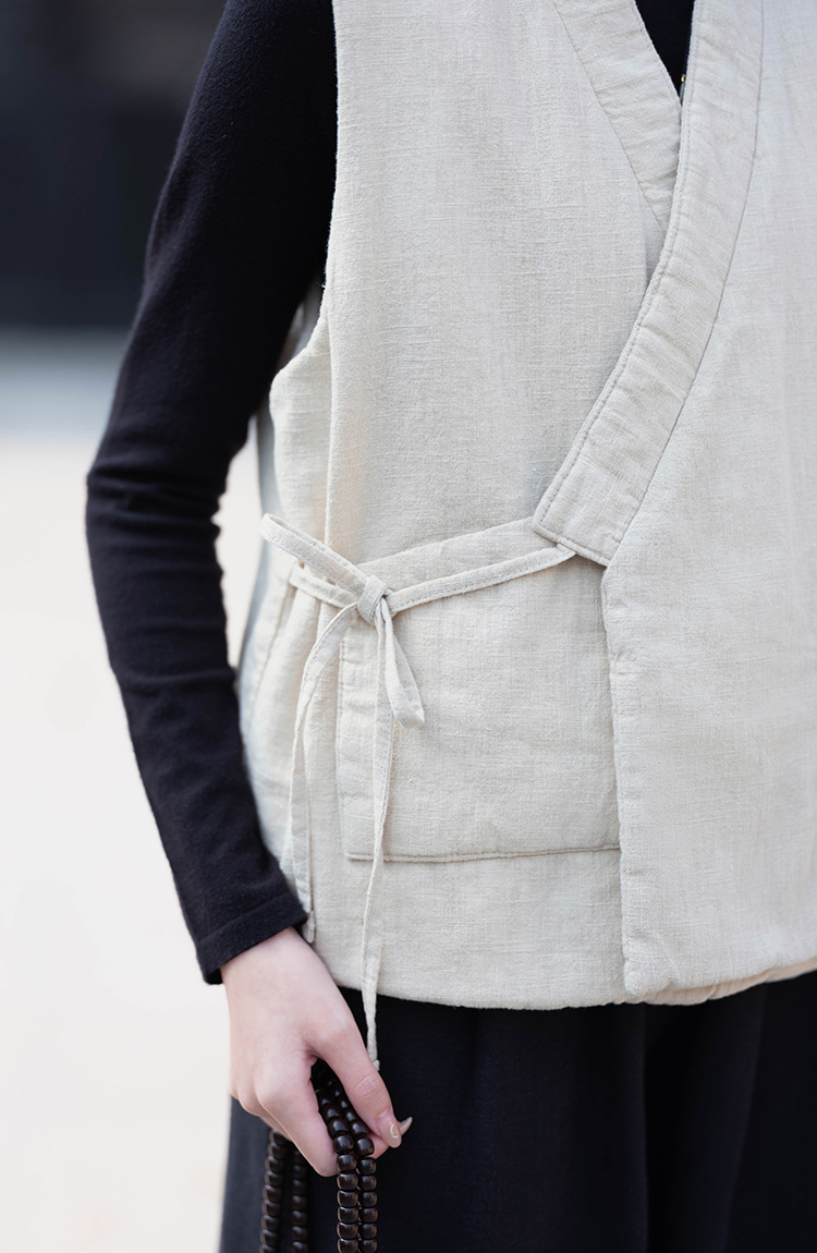 25 겨울용 면마 여성복 신상품 중국풍 레트로 샌드워싱 브이넥 조끼 여성용 아우터 면마 누빔 두꺼운 면조끼스토어 가기