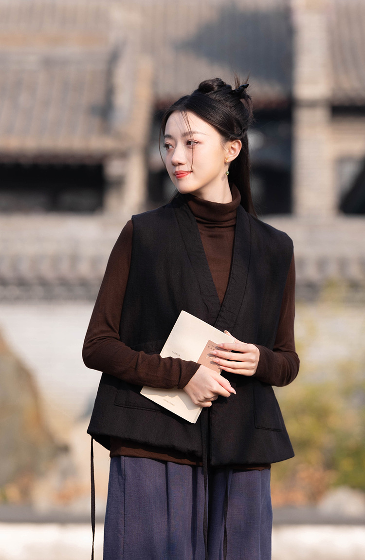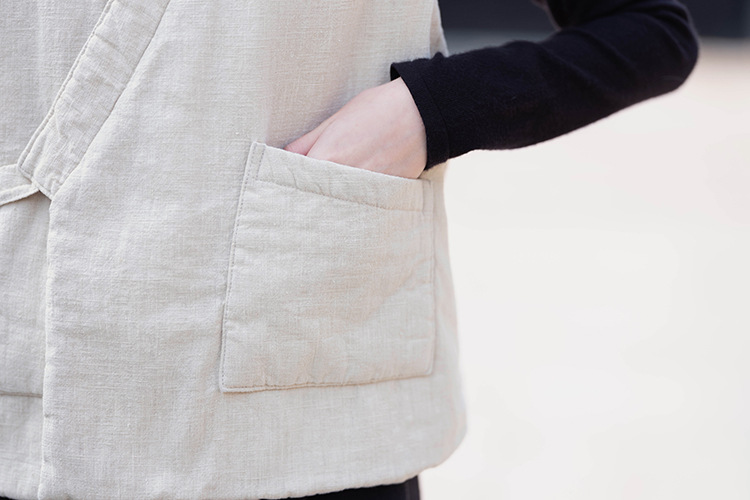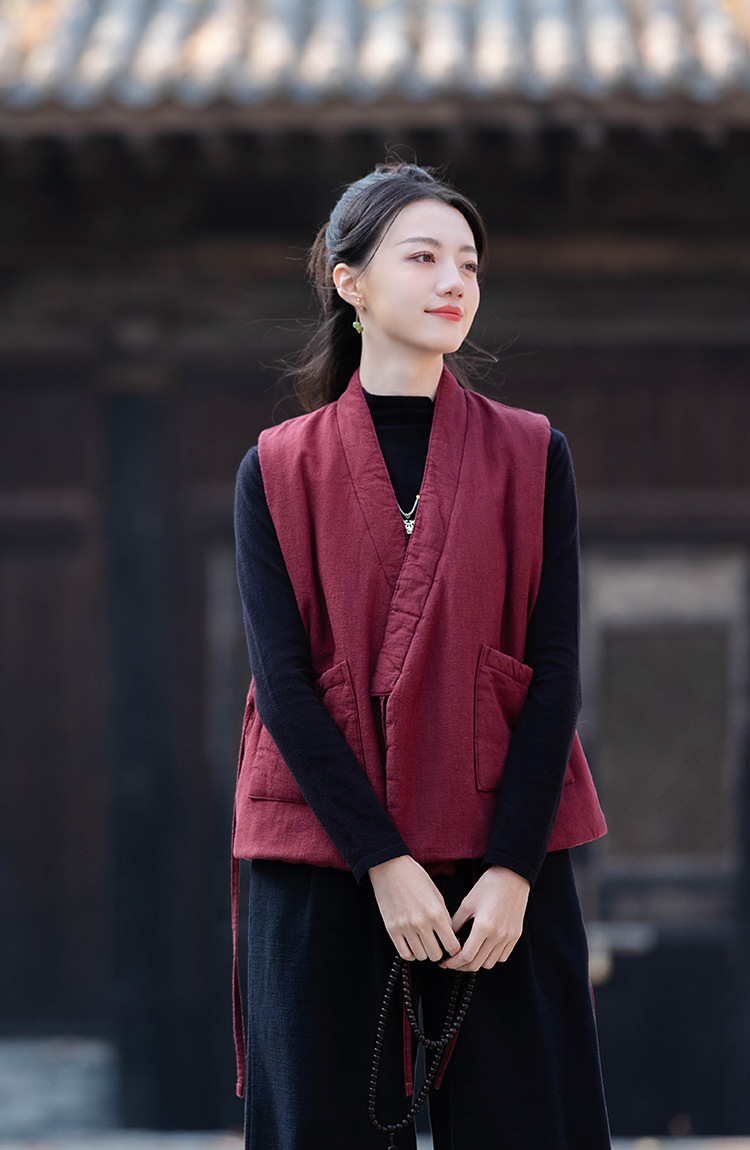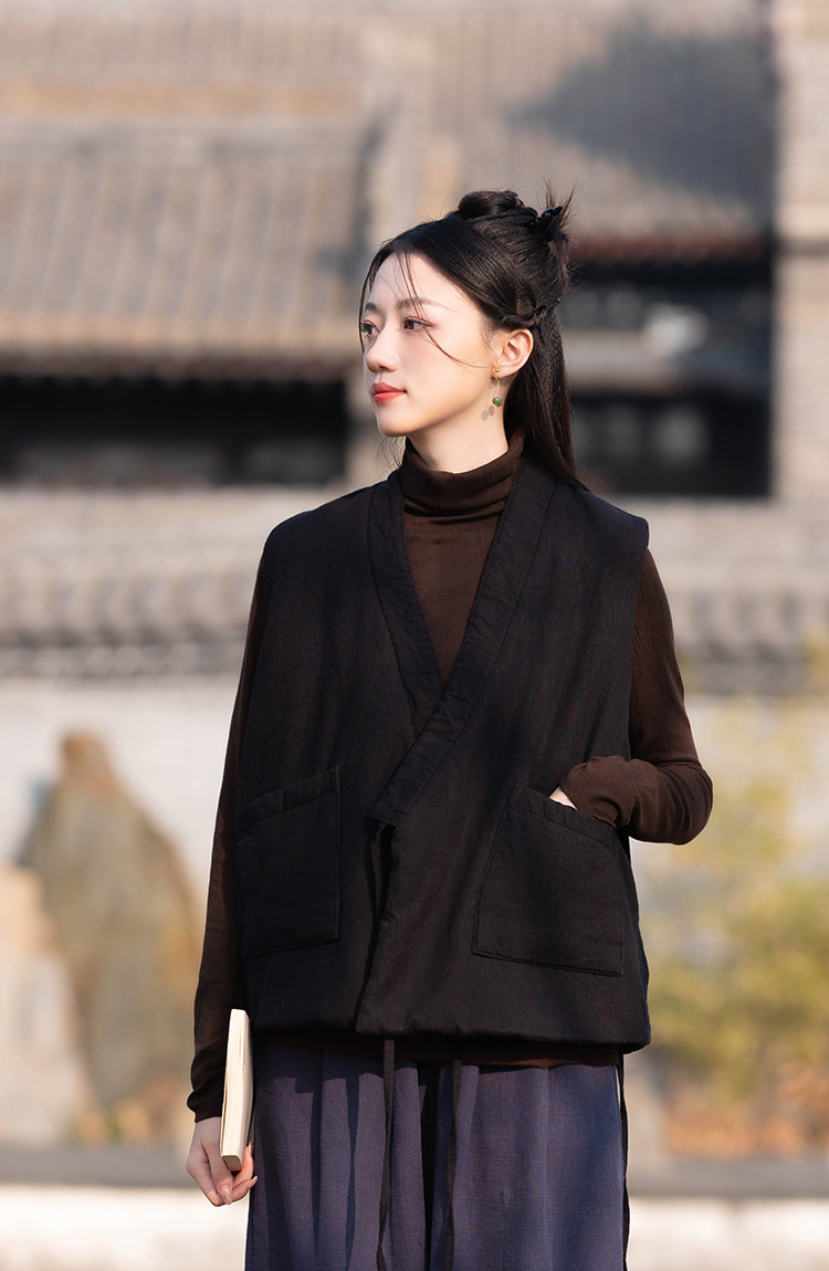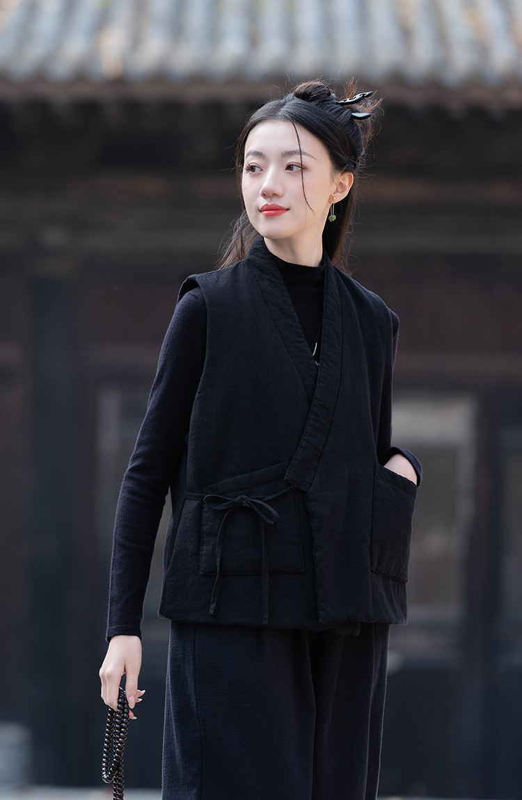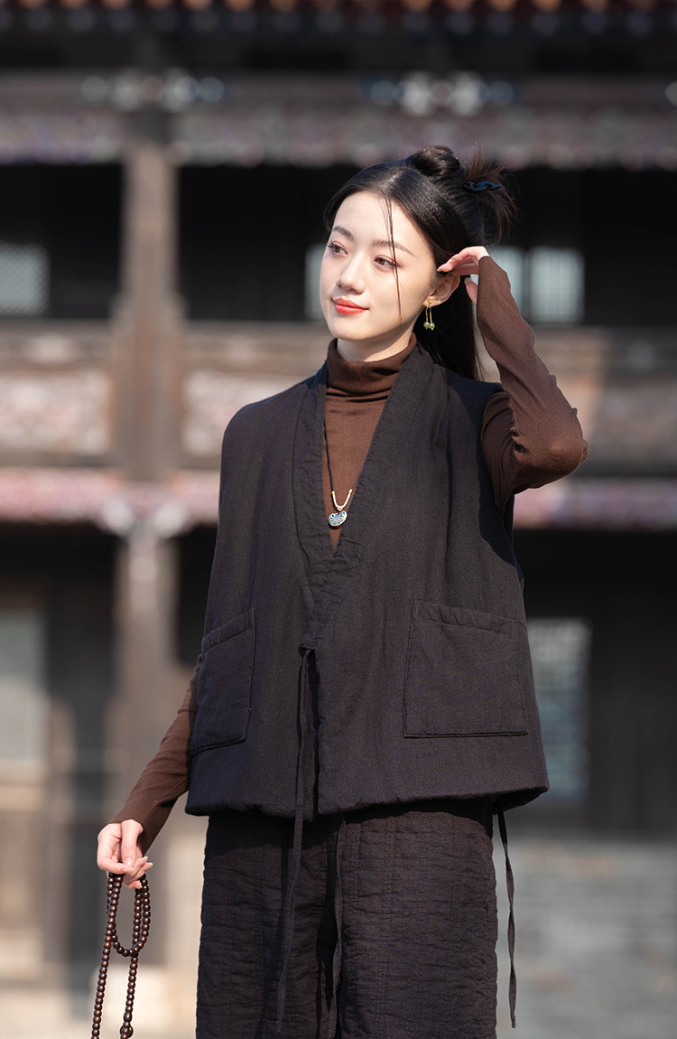 25 겨울용 면마 여성복 신상품 중국풍 레트로 샌드워싱 브이넥 조끼 여성용 아우터 면마 누빔 두꺼운 면조끼스토어 가기