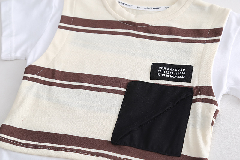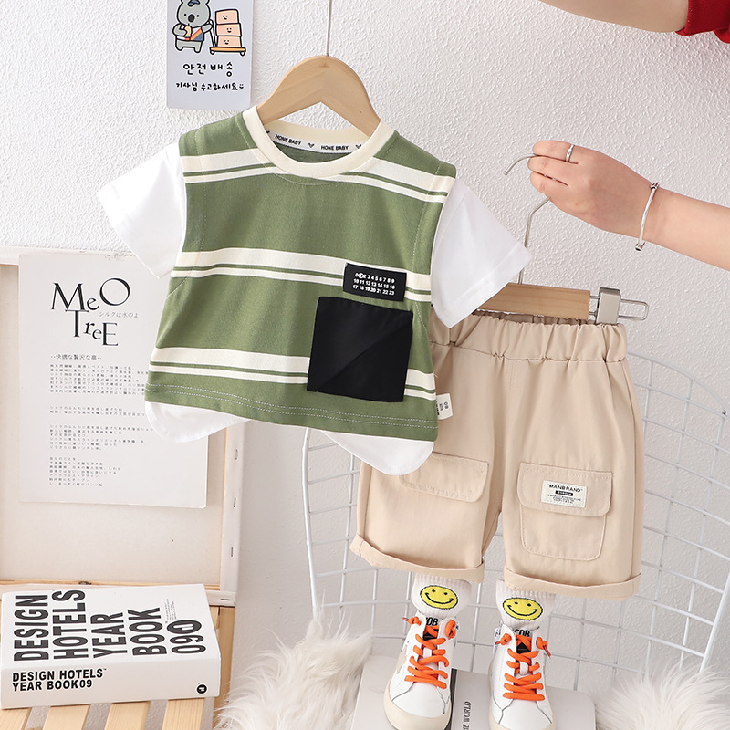 여름 2024 새로운 와이드 스트라이프 포켓 아동복 남학생 투피스 짧은 소매 반바지 여름 옷 어린이 세트