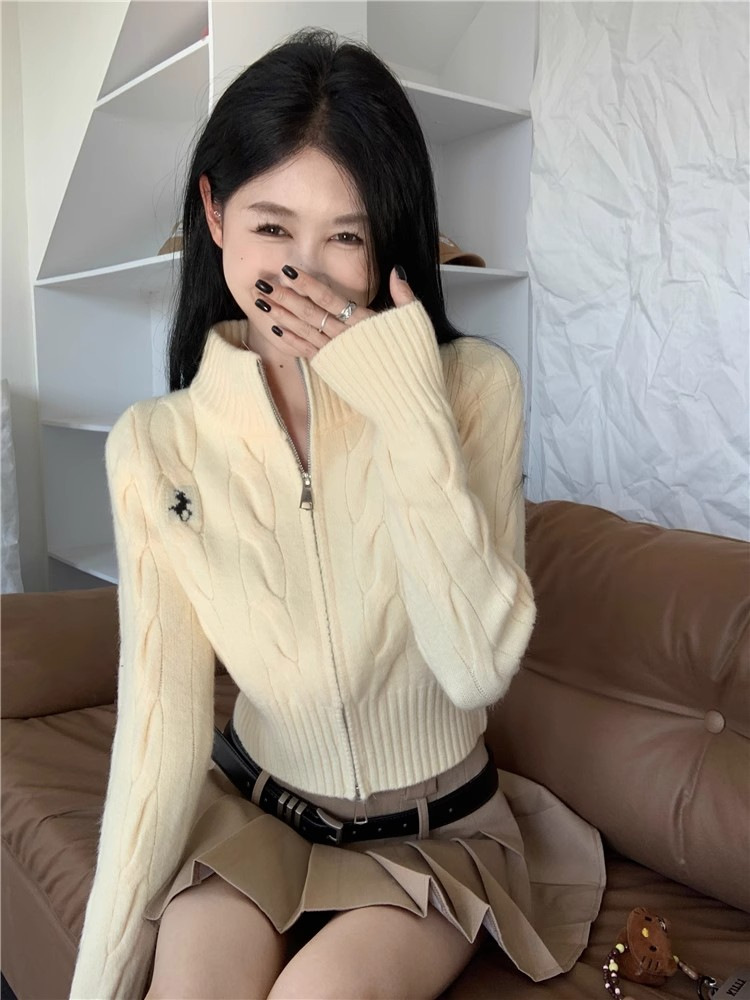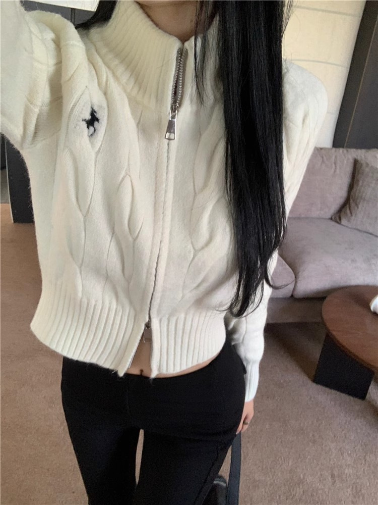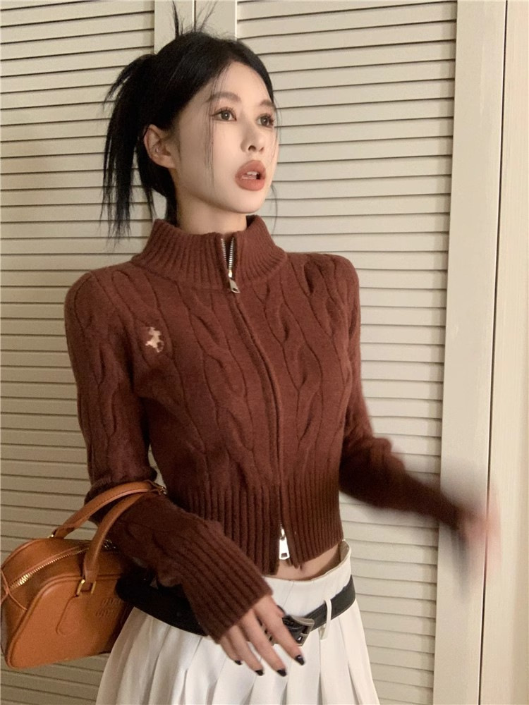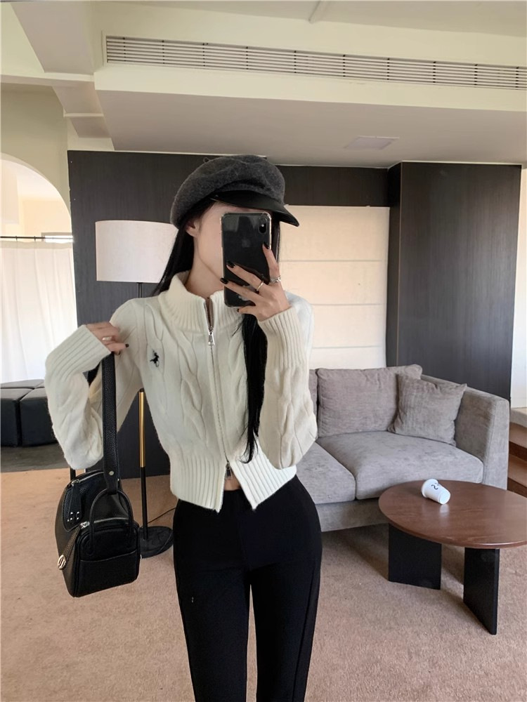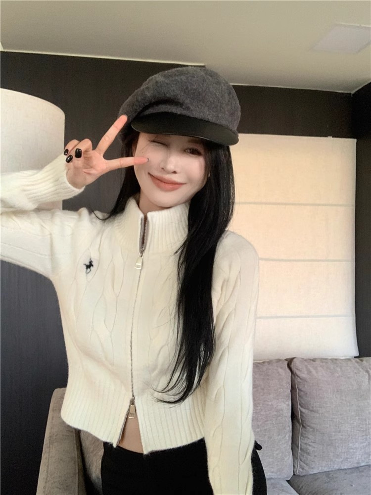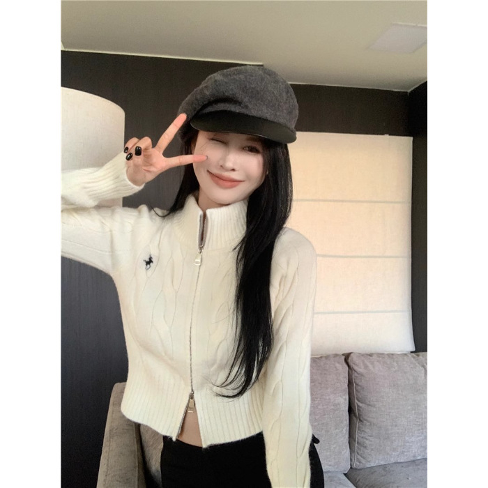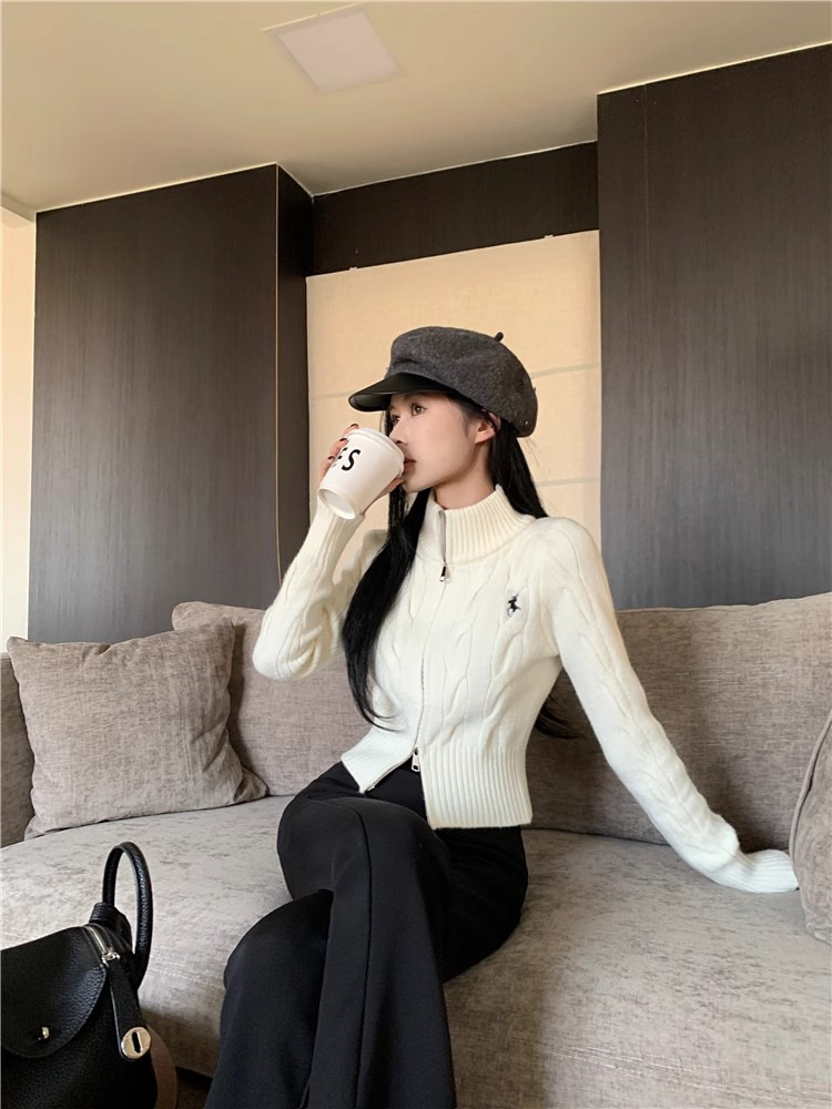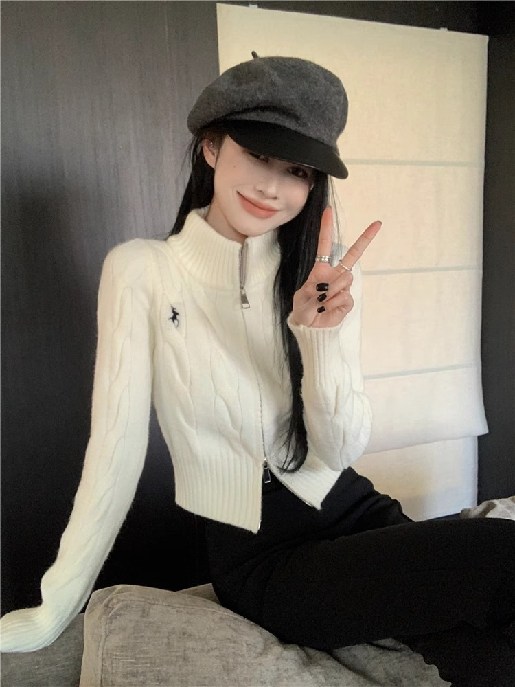 자수 스탠드 칼라 니트 스웨터 여성의 가을과 겨울 한국 스타일 2023 새로운 슬리밍 슬림 핏 패션 짧은 더블 지퍼 카디건스토어 가기