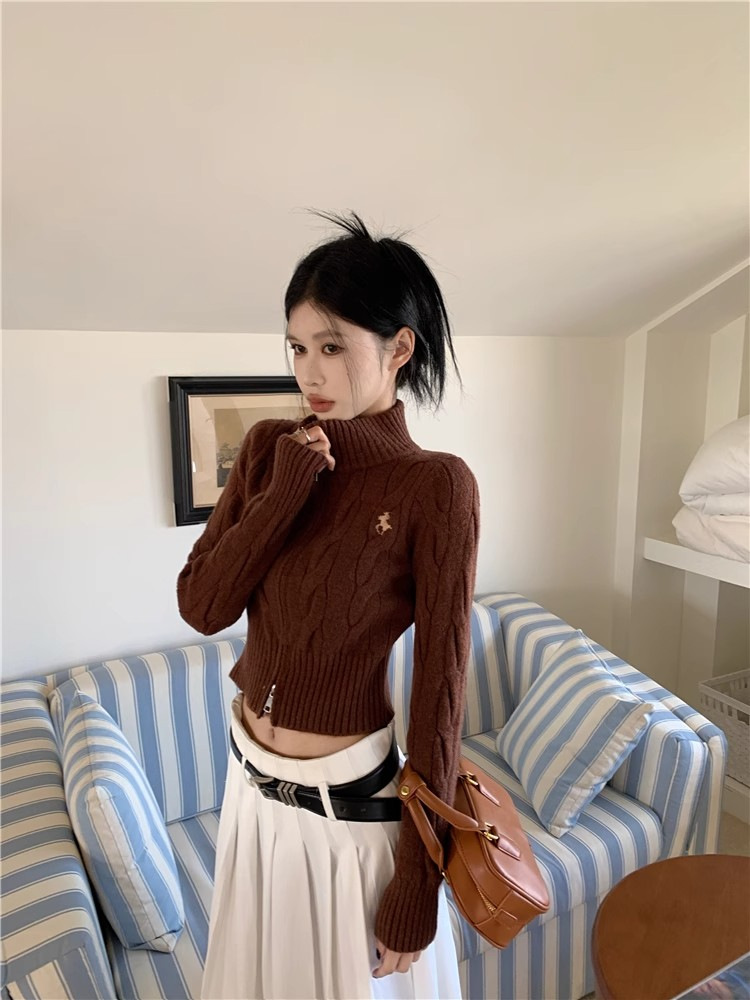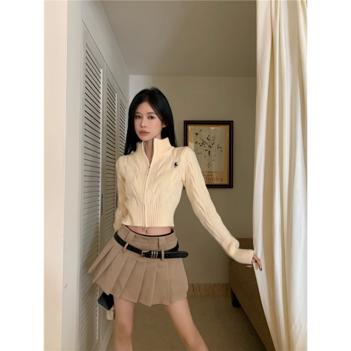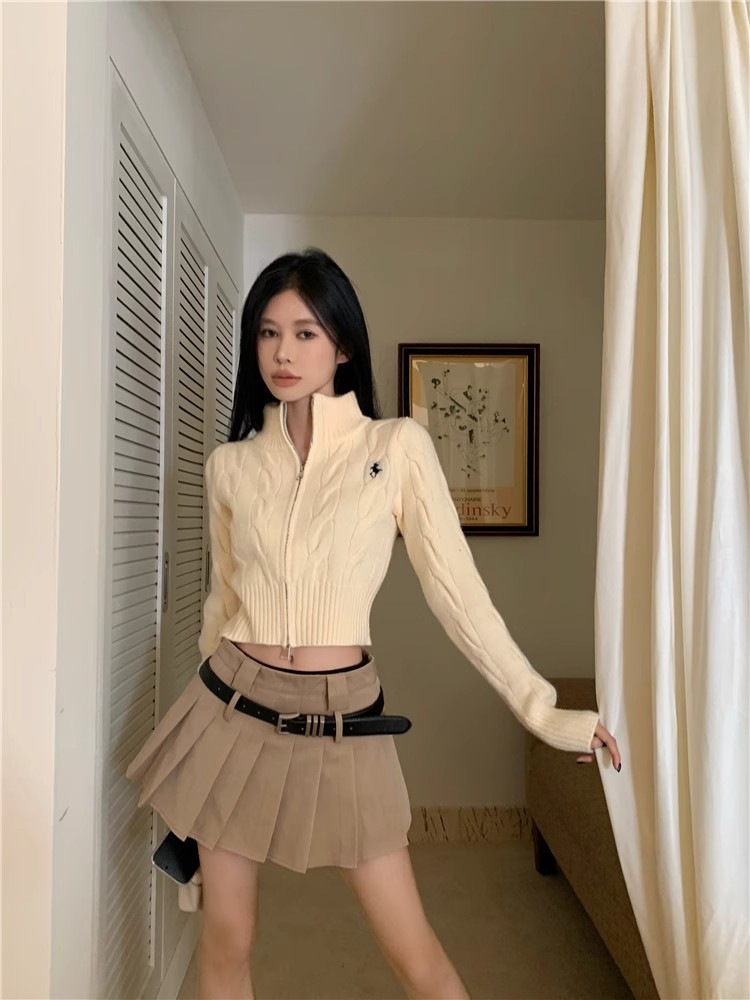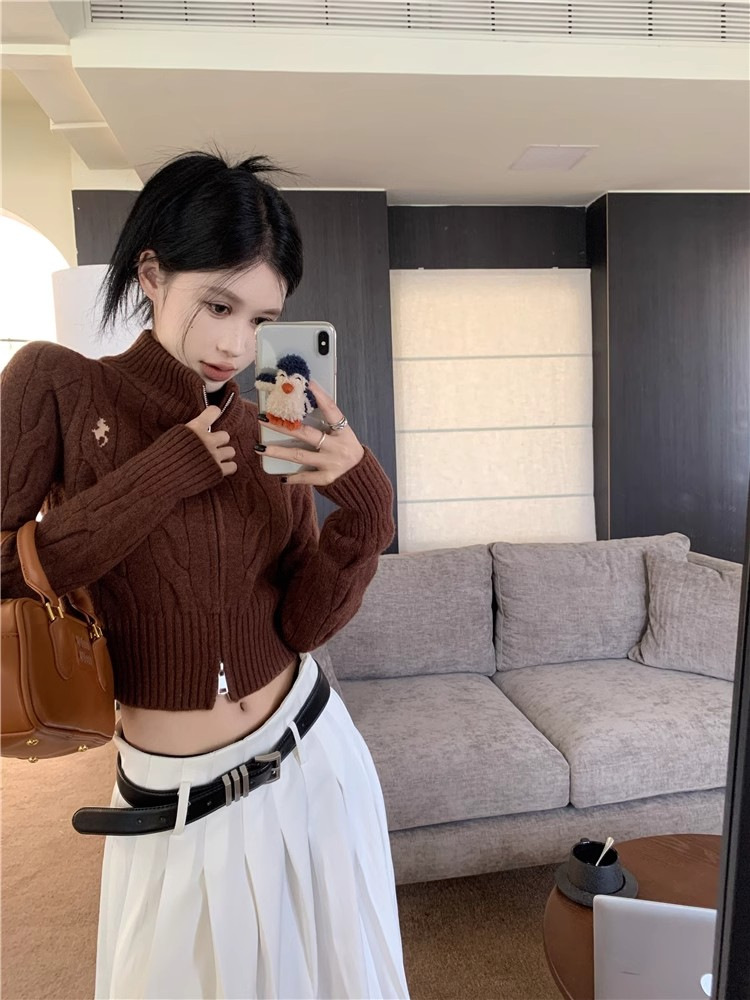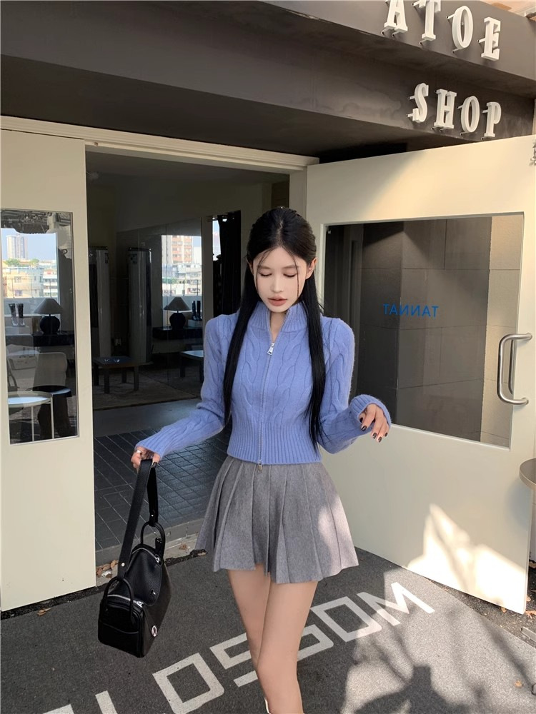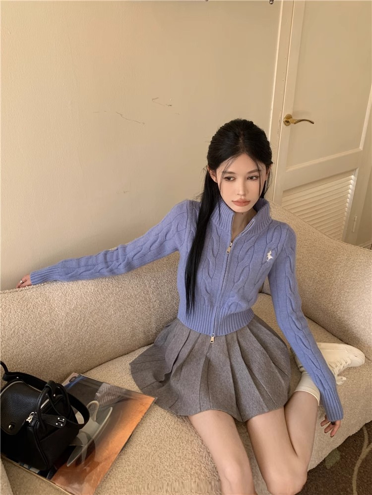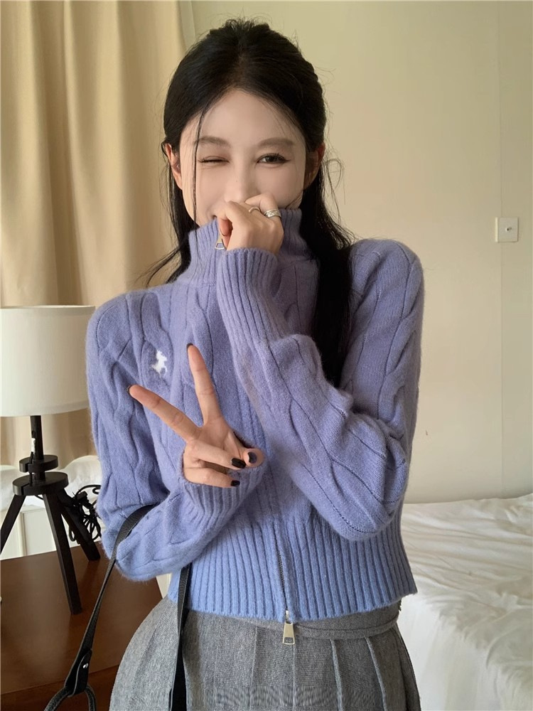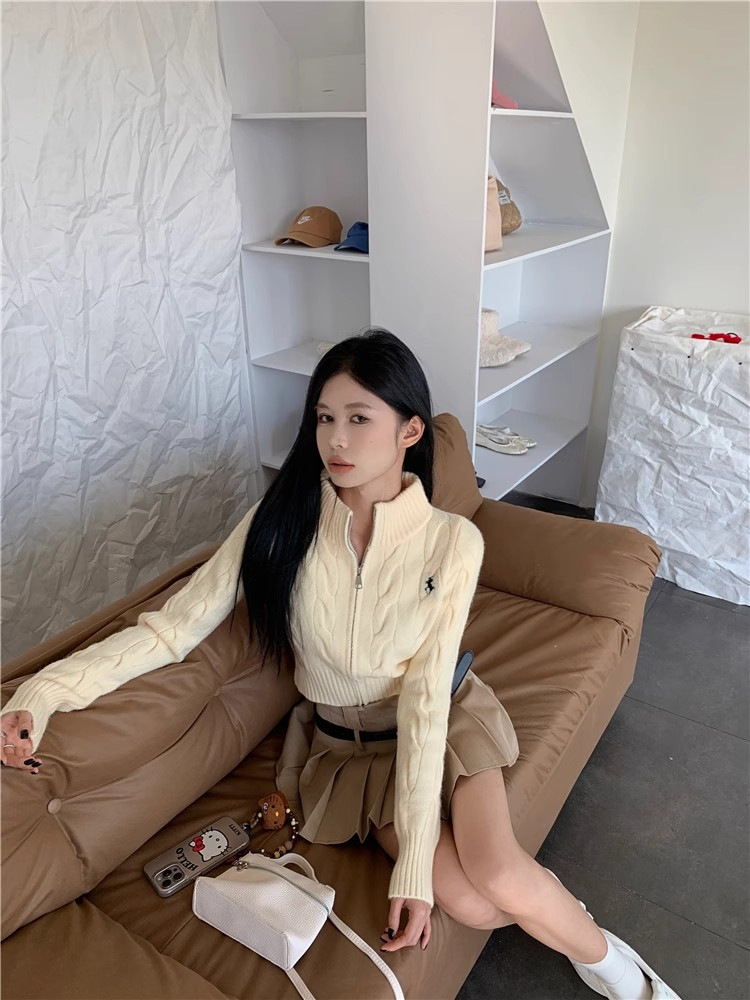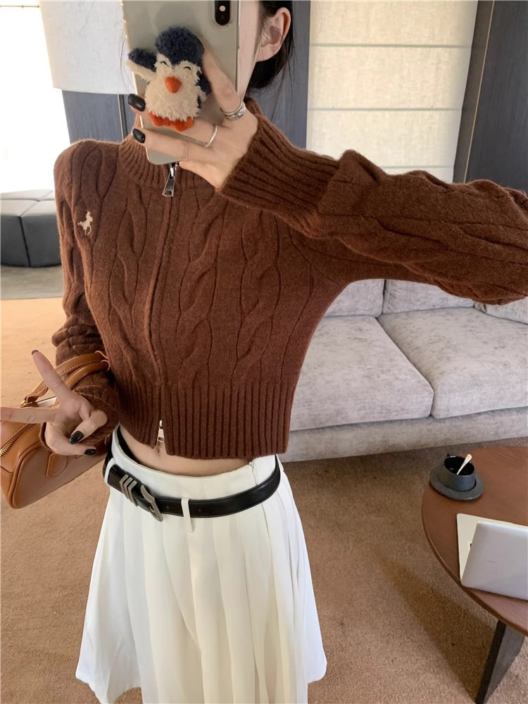 자수 스탠드 칼라 니트 스웨터 여성의 가을과 겨울 한국 스타일 2023 새로운 슬리밍 슬림 핏 패션 짧은 더블 지퍼 카디건스토어 가기