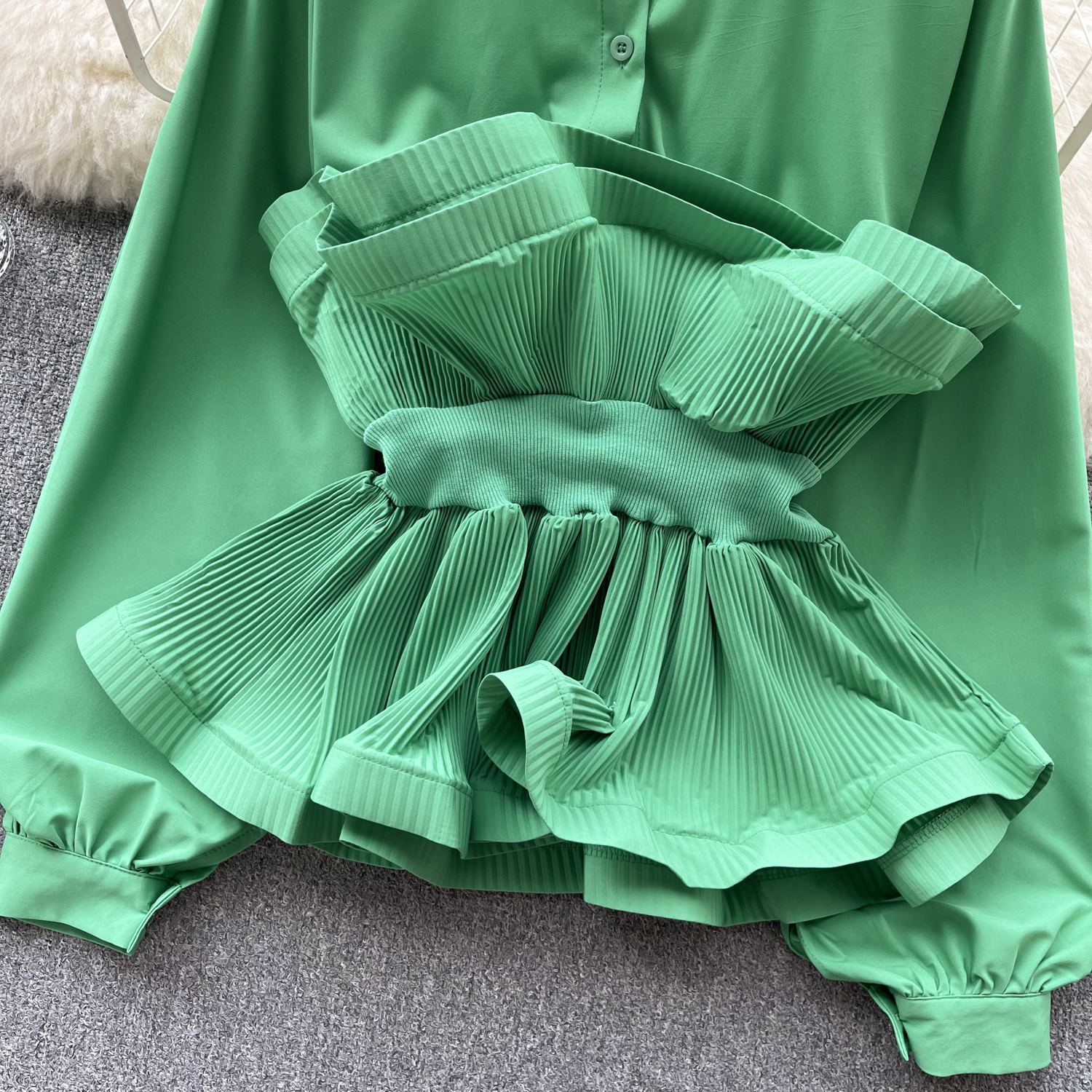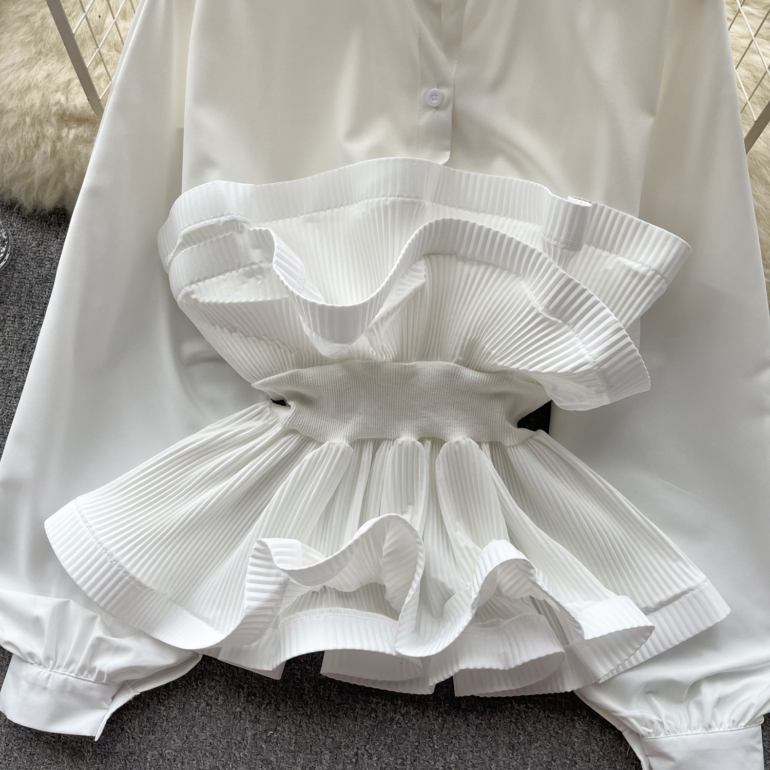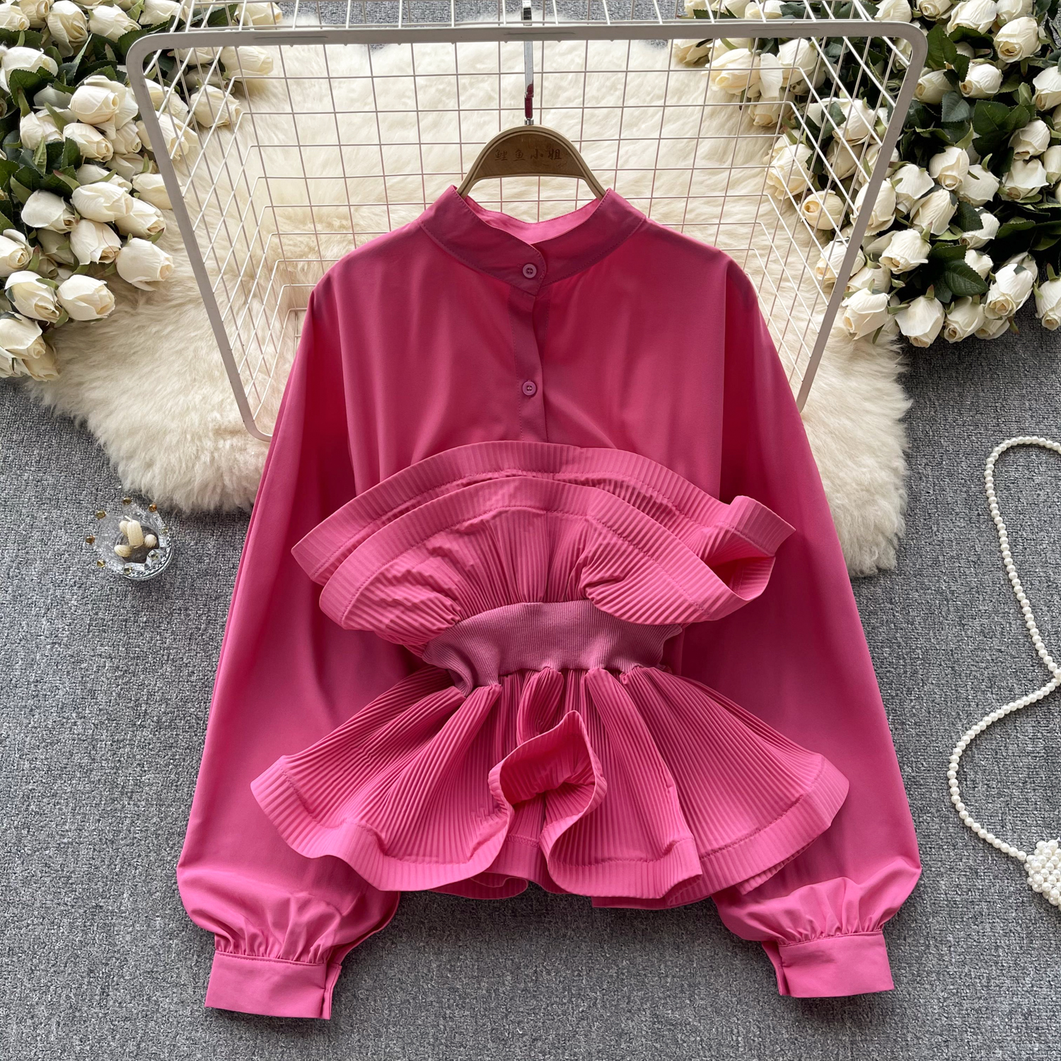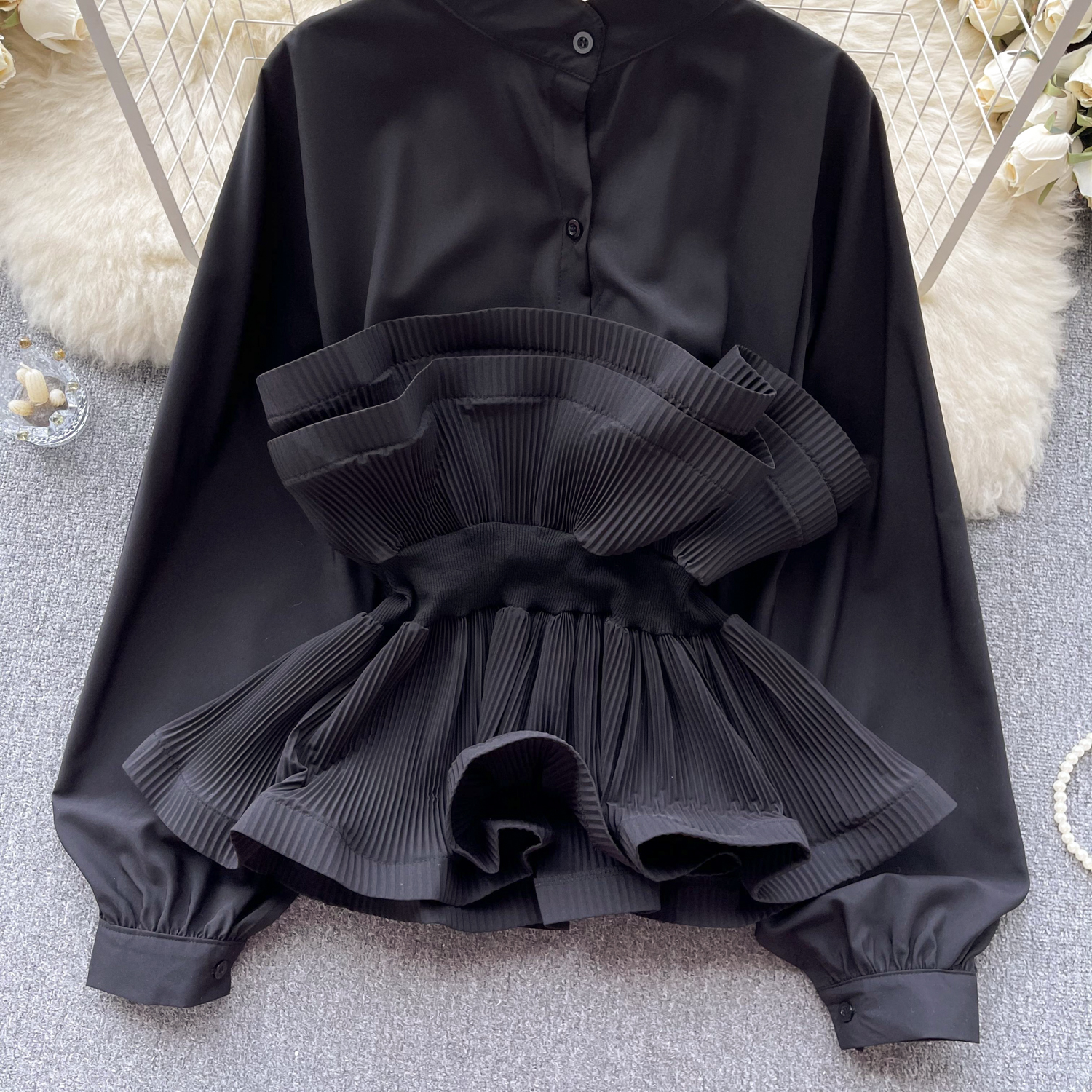 프랑스 스타일 가벼운 럭셔리 사교계 스타일 퍼프 소매 셔츠 여성의 가을 타이트 허리 주름진 디자인 틈새 슈퍼 요정 탑스토어 가기
