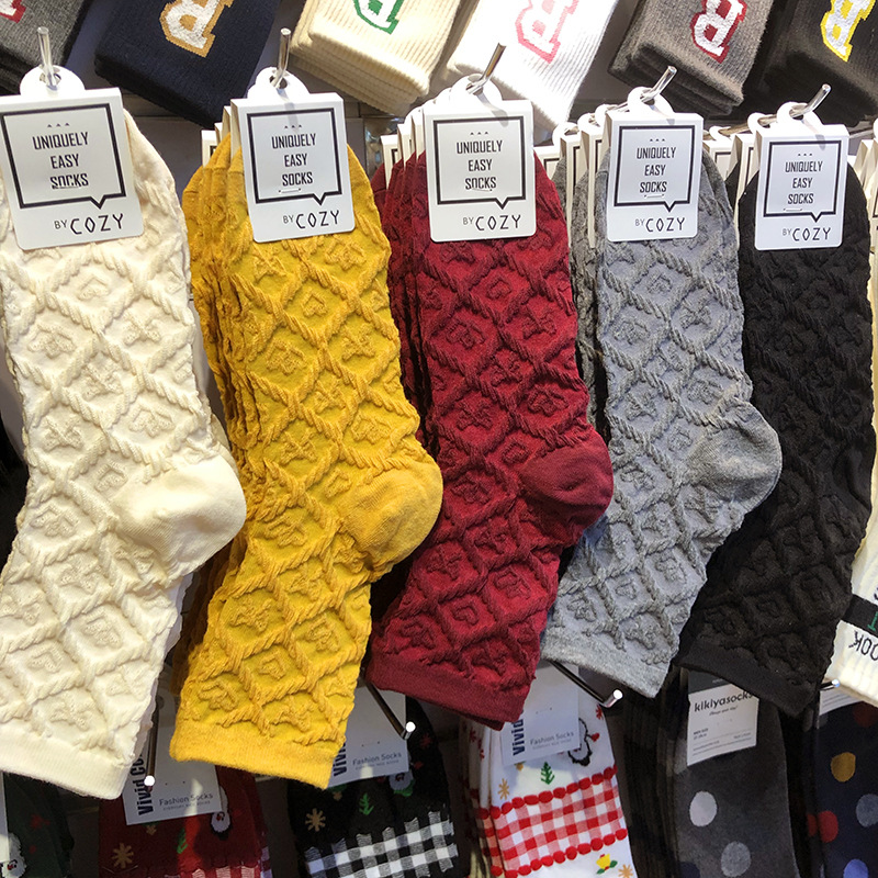 한국 수입 양말 양각 다이아몬드 모양의 격자 무늬 여성용 중간 종아리 양말 COZY 활 하트 모양의 단색 올 매치 여성면 양말스토어 가기