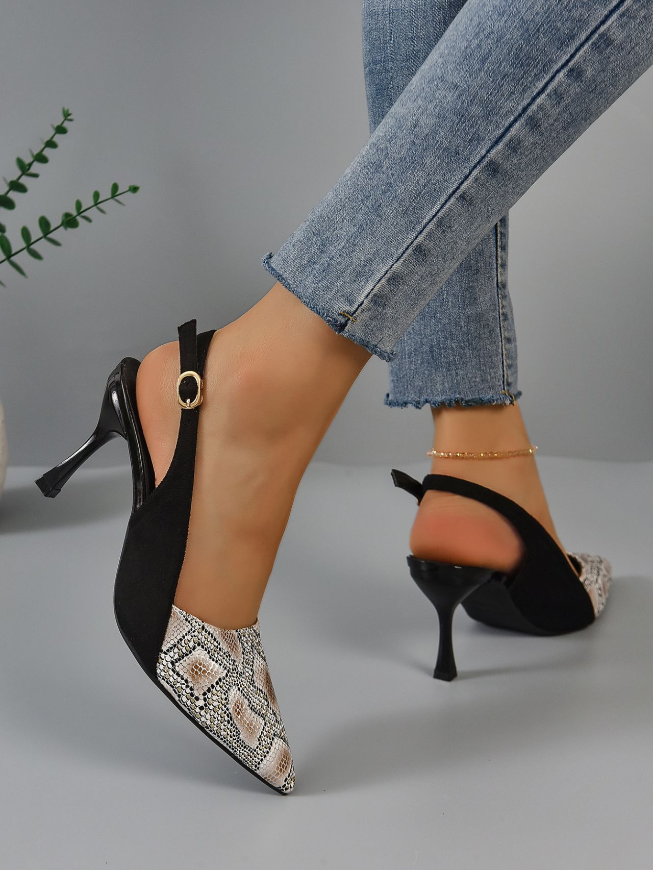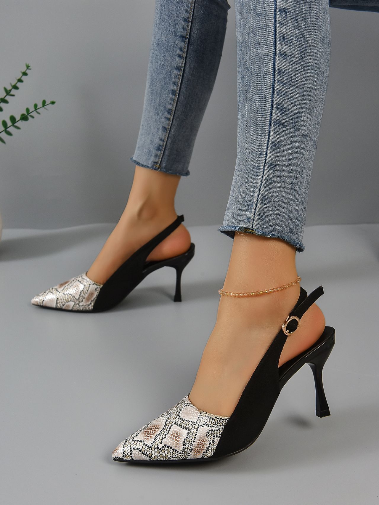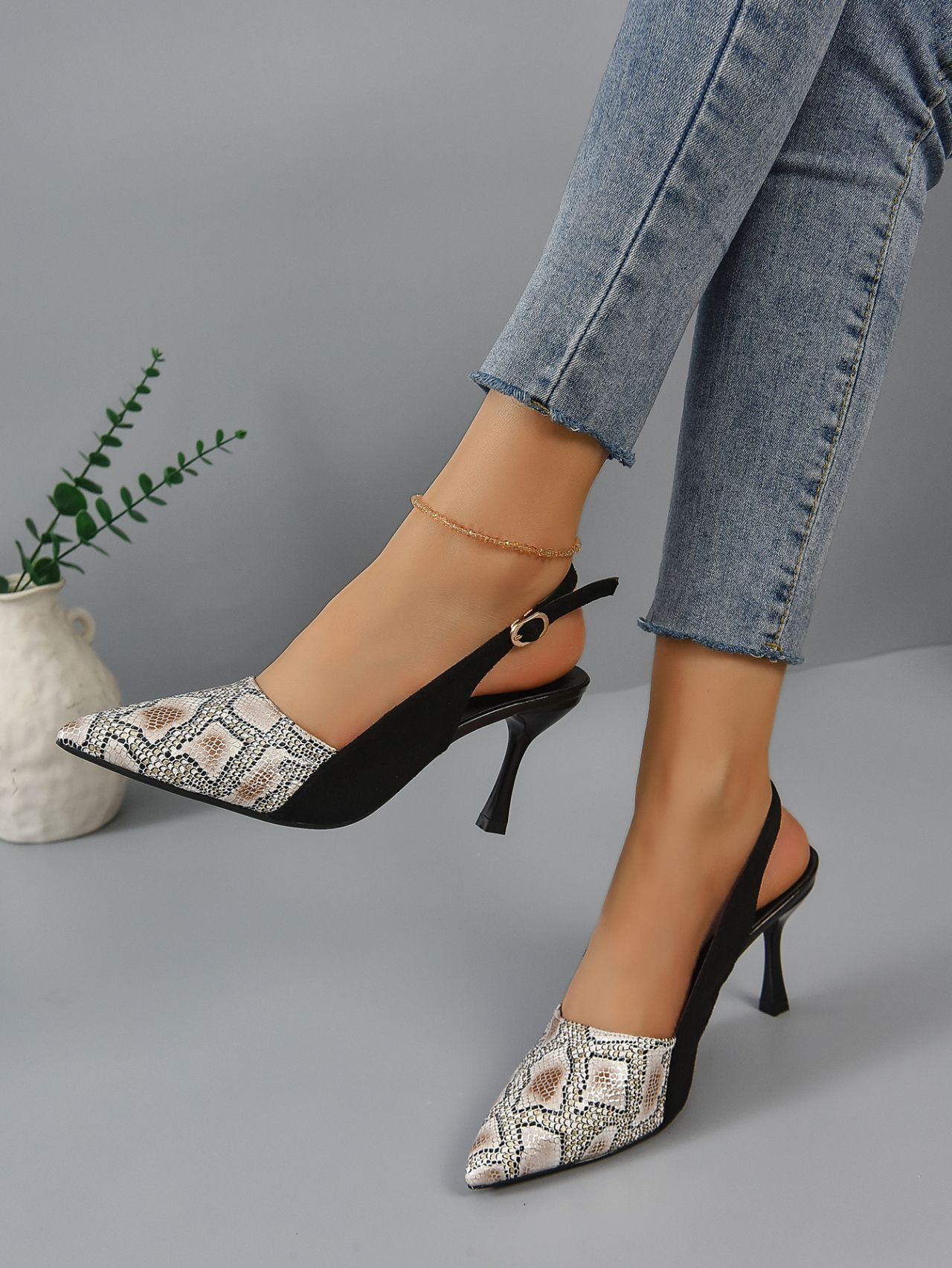 Snakeskin 표면 뾰족한 발가락 다시 빈 버클 하이힐 패션 샌들 여성 프랑스 스타일의 우아한 여성 신발