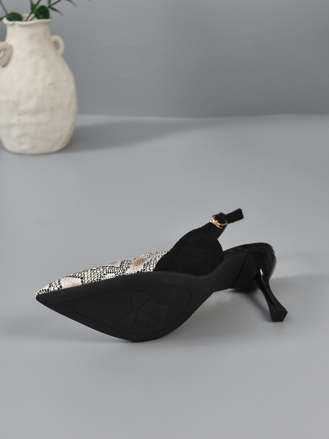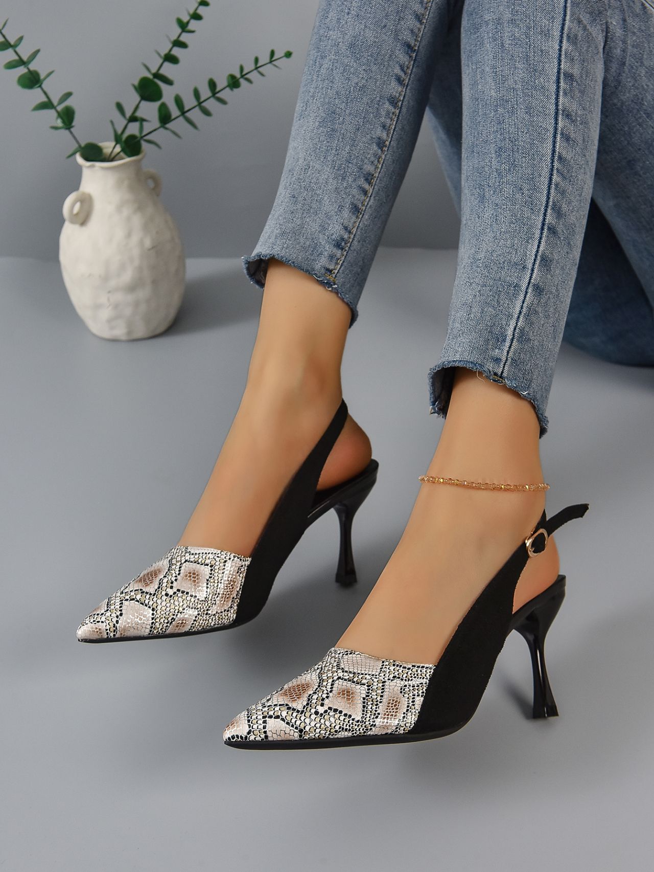 Snakeskin 표면 뾰족한 발가락 다시 빈 버클 하이힐 패션 샌들 여성 프랑스 스타일의 우아한 여성 신발스토어 가기