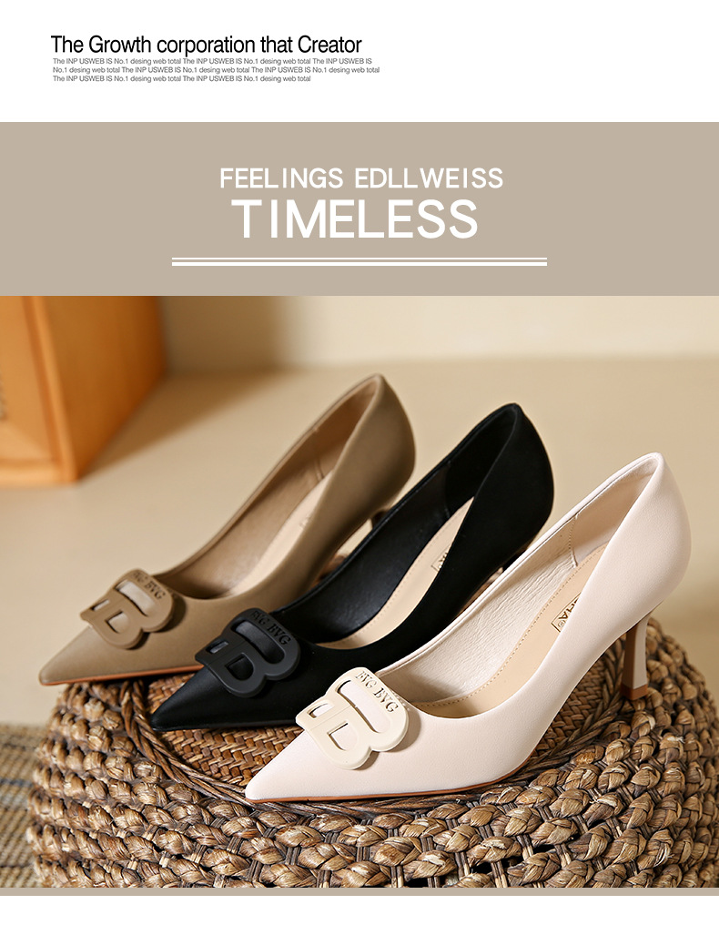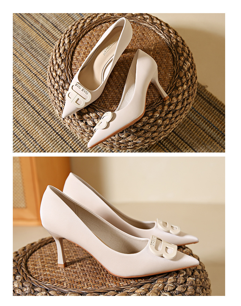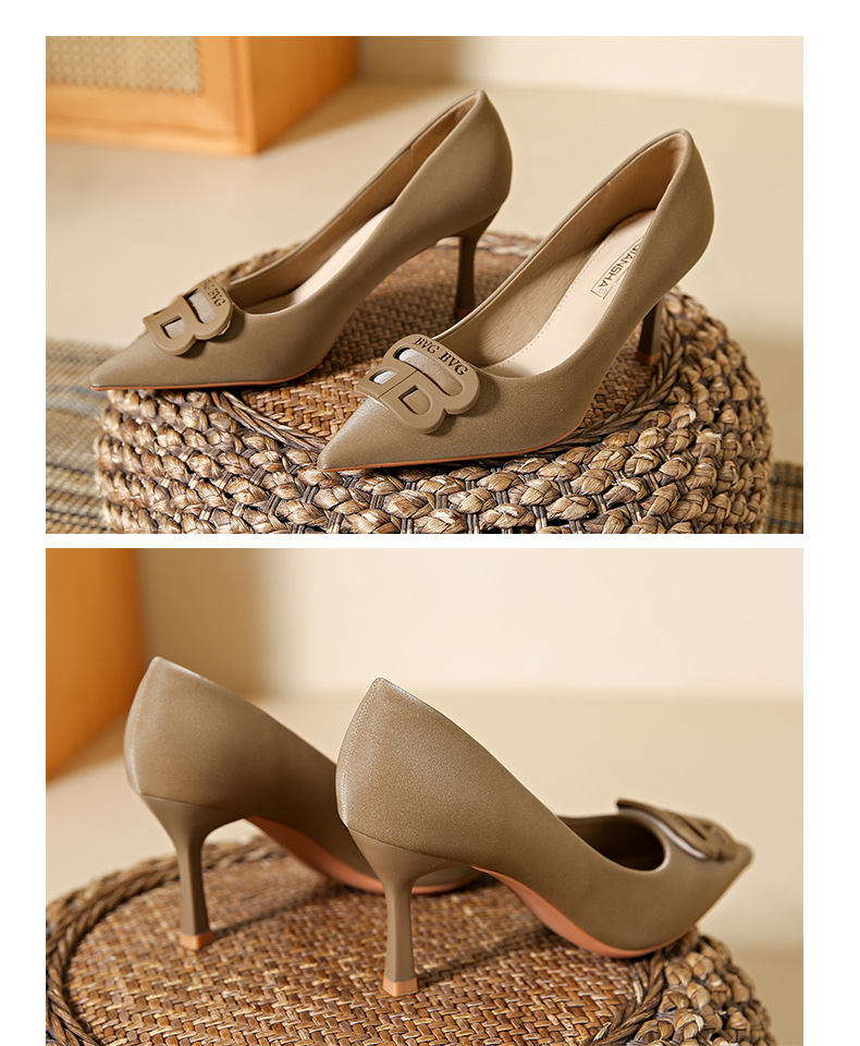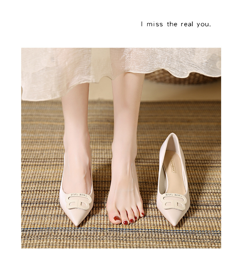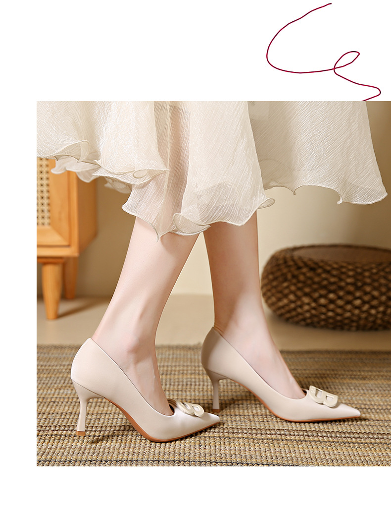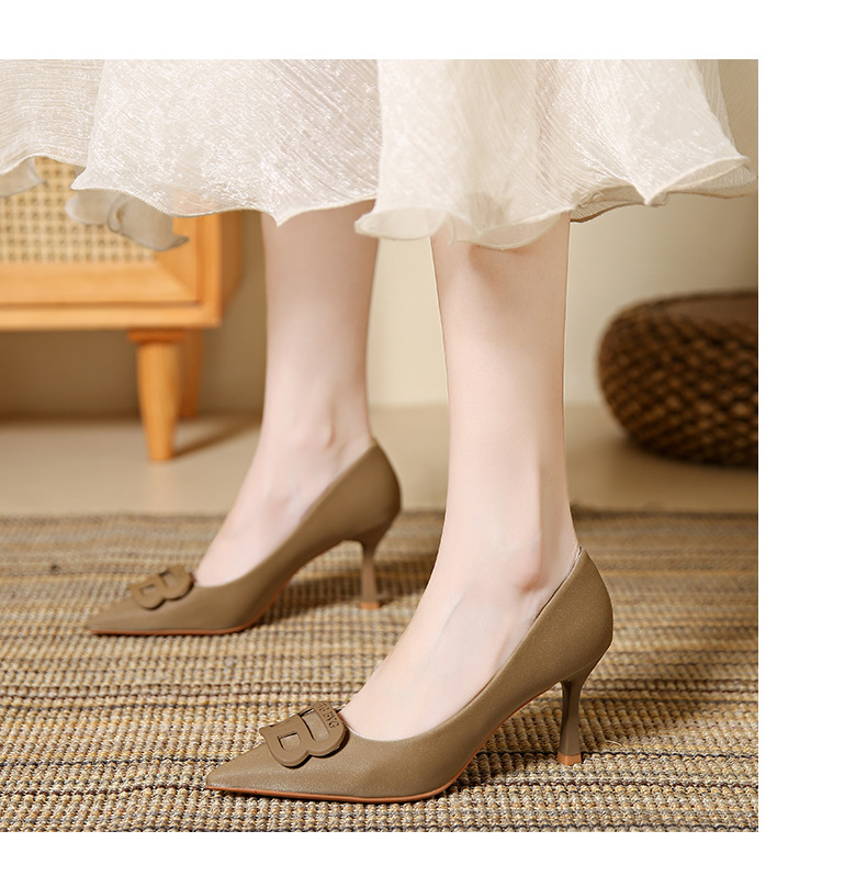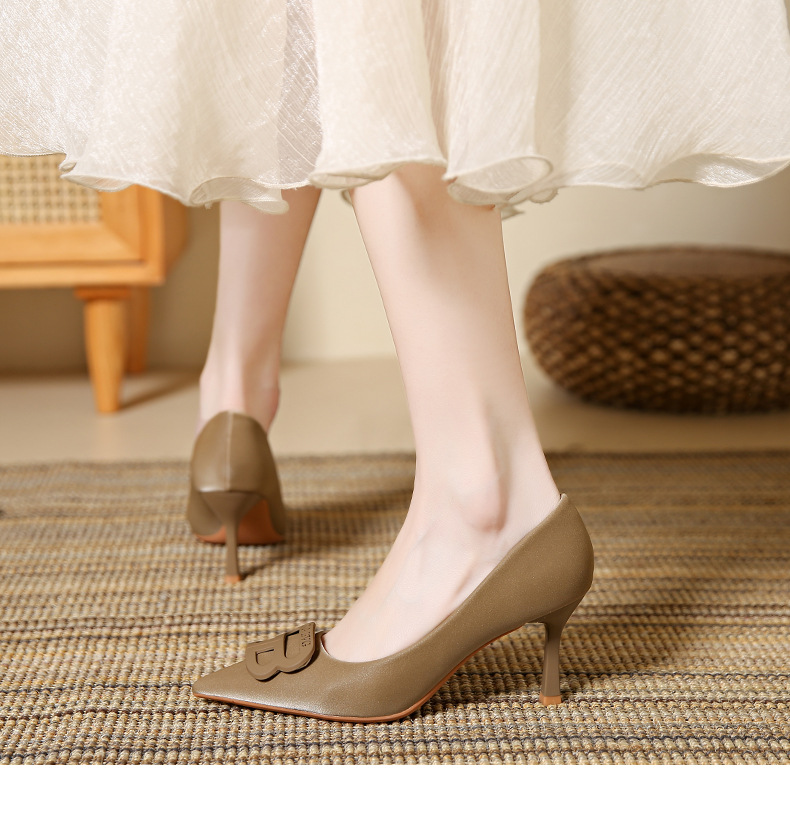 프렌치 누드 컬러 천연 가죽 메탈 버클 얇은 굽 하이힐 2025년 신상 부드러운 가죽 출퇴근용 여성용 하이힐스토어 가기
